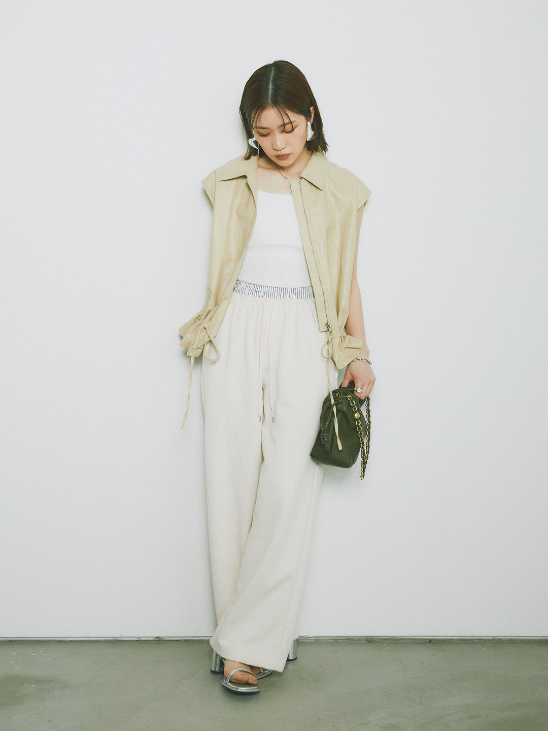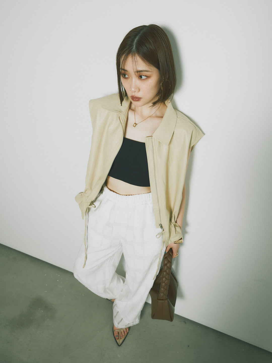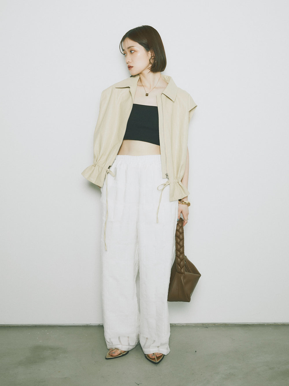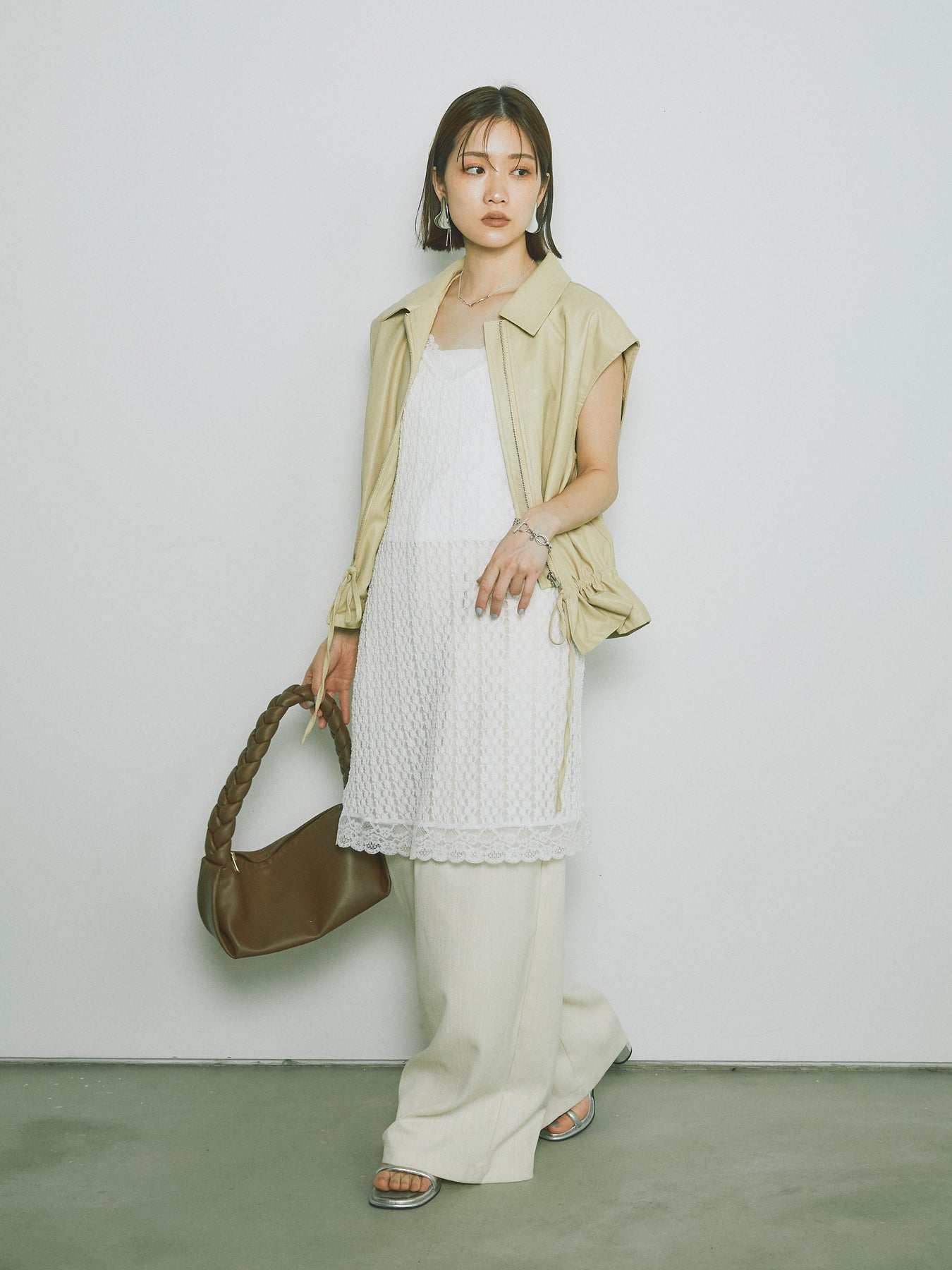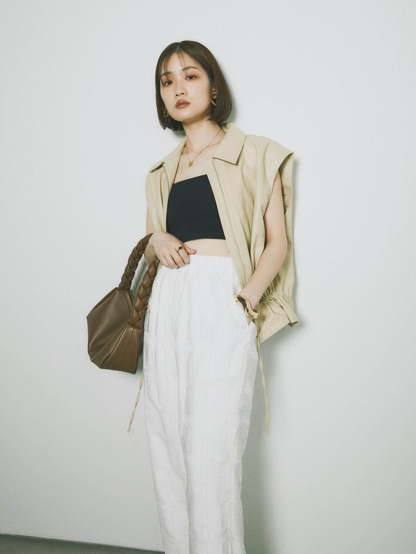 スタイリッシュでありながら、軽やかな着心地を提供するフェイクレザーノースリーブジャケット。シンプルなデザインに加えて、ウエスト部分のドローコードでシルエットを調整できるため、さまざまな体型にフィットします。ファスナー付きで、カジュアルにもエレガントにもコーディネートが可能。秋冬の重ね着にぴったりなアイテムです。 ※ボトムス、キャミソール(インナー)以外の商品は一律でインナーは付属していません。