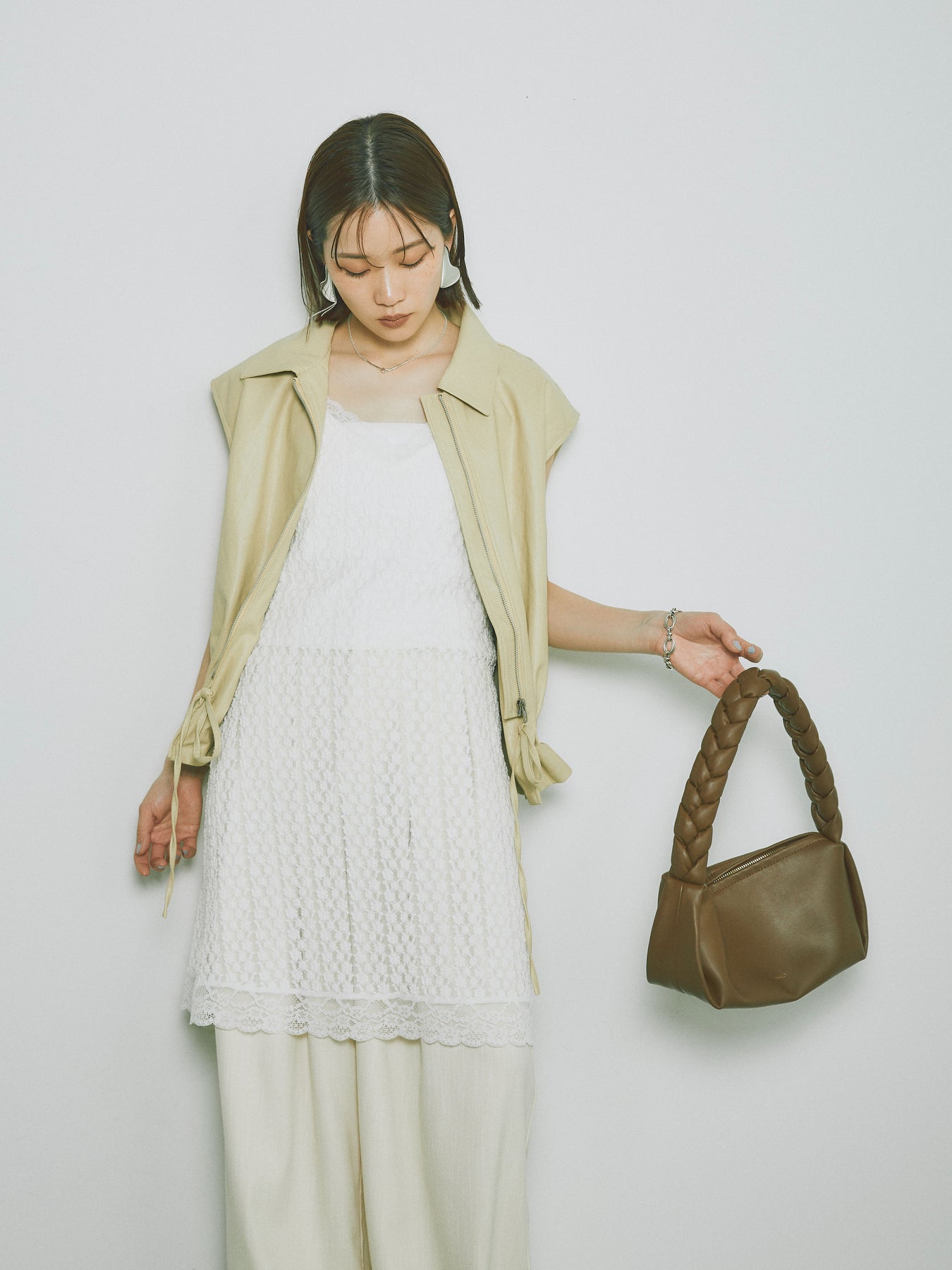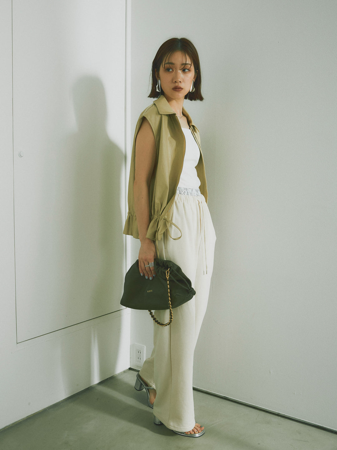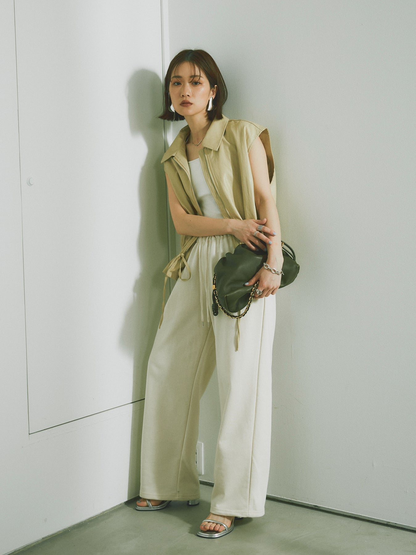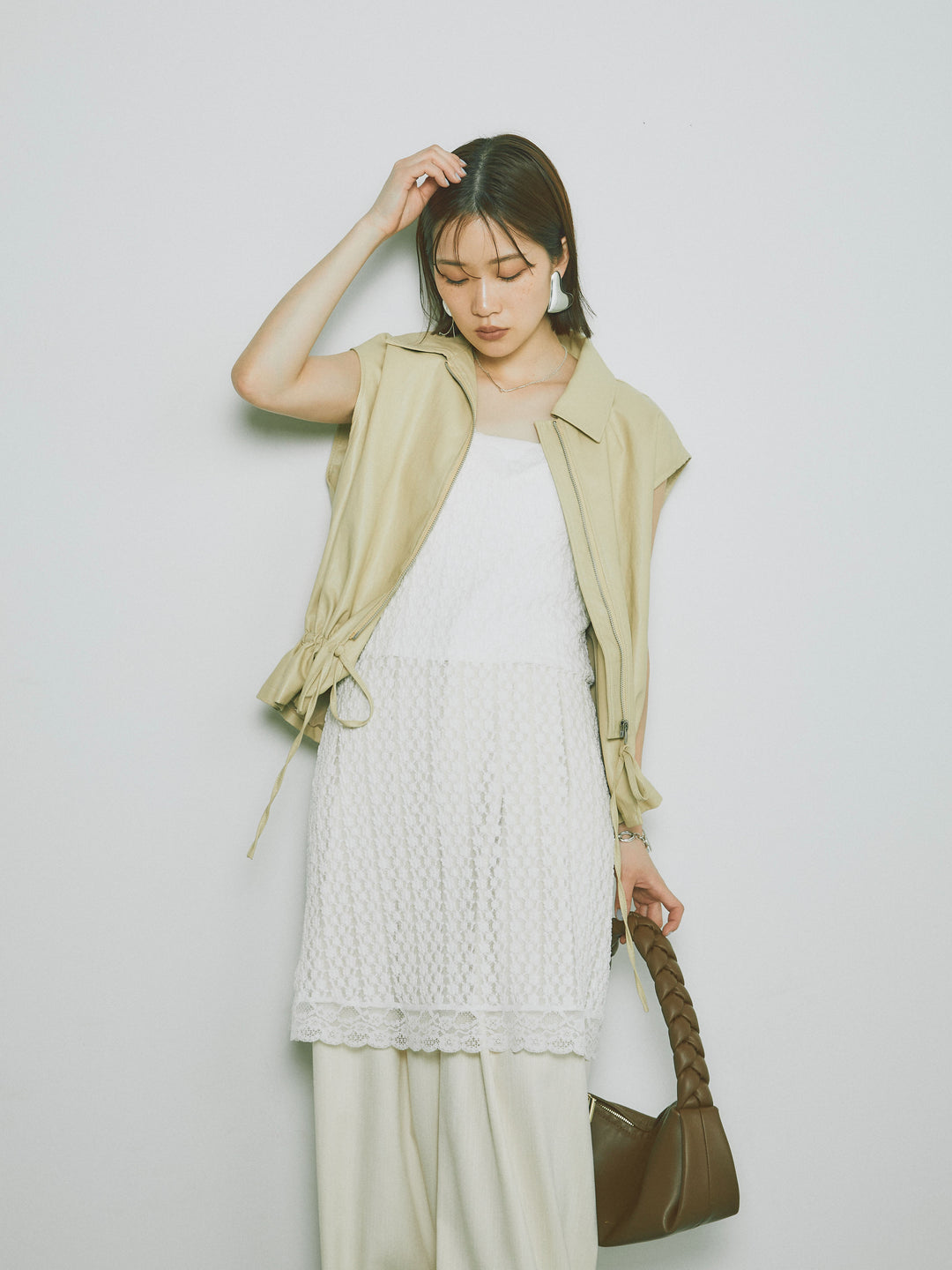 スタイリッシュでありながら、軽やかな着心地を提供するフェイクレザーノースリーブジャケット。シンプルなデザインに加えて、ウエスト部分のドローコードでシルエットを調整できるため、さまざまな体型にフィットします。ファスナー付きで、カジュアルにもエレガントにもコーディネートが可能。秋冬の重ね着にぴったりなアイテムです。 ※ボトムス、キャミソール(インナー)以外の商品は一律でインナーは付属していません。