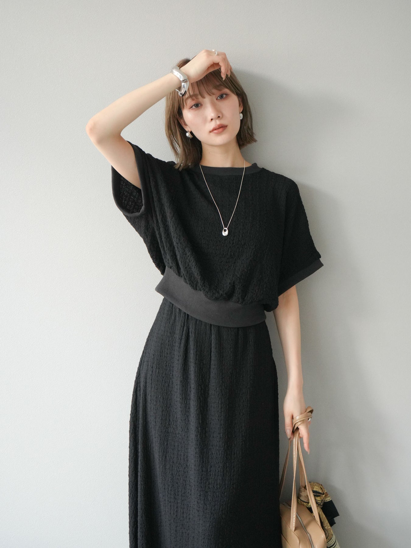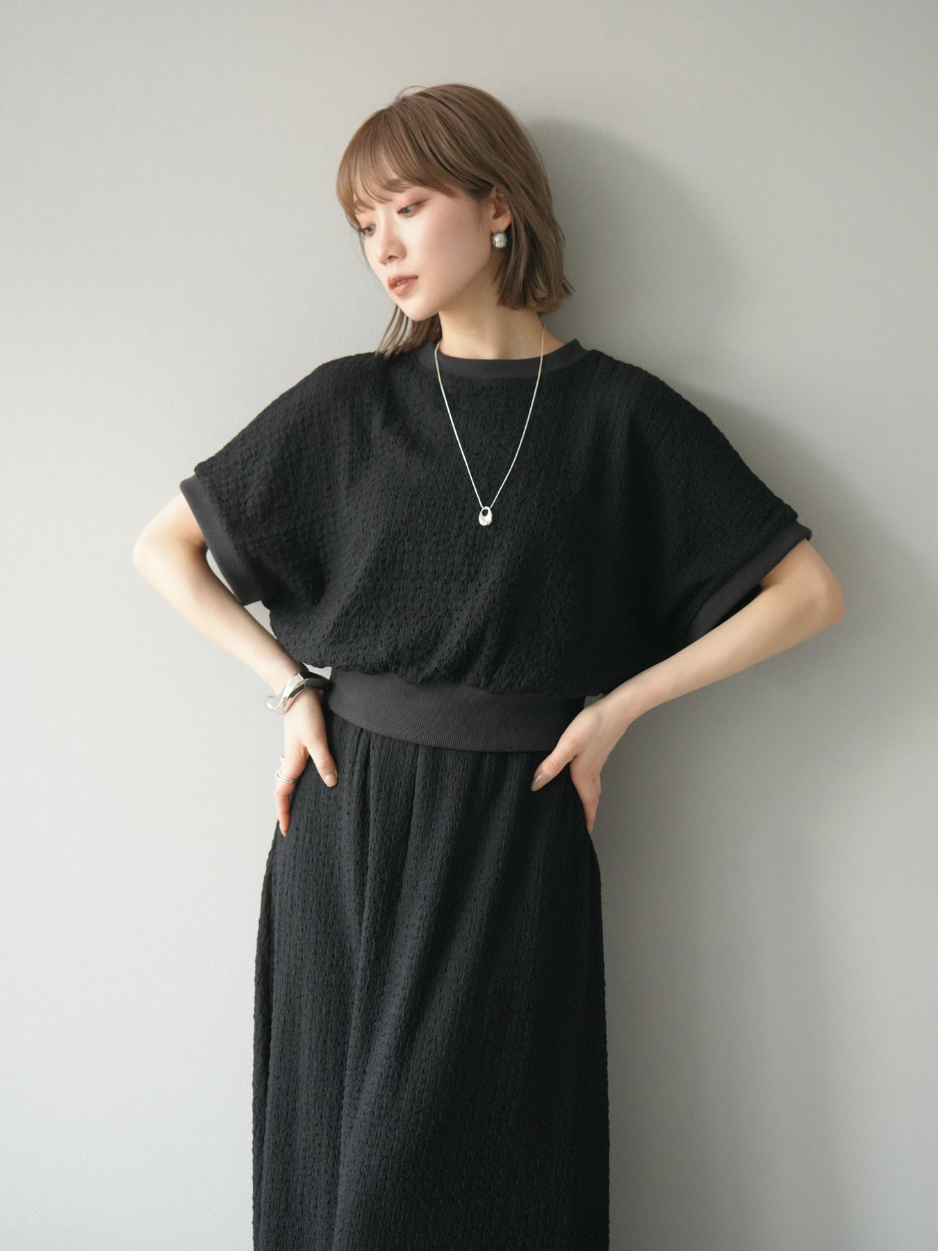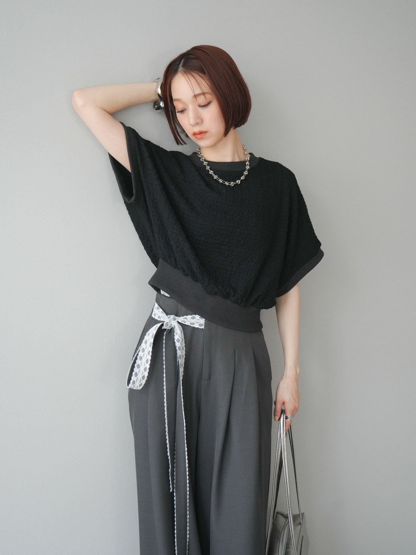立体感のある膨れジャガード素材を使用したバイカラーデザインのプルオーバー。シンプルながらも表情のある素材感と、袖口・裾の切り替えがアクセントに。ゆとりのあるシルエットでラフに着られ、カジュアルながらも洗練された印象に仕上がります。ワイドパンツやデニムとの相性も◎。トレンドを意識したデイリースタイルにおすすめの一着です。 ※ボトムス、キャミソール(インナー)以外の商品は一律でインナーは付属していません