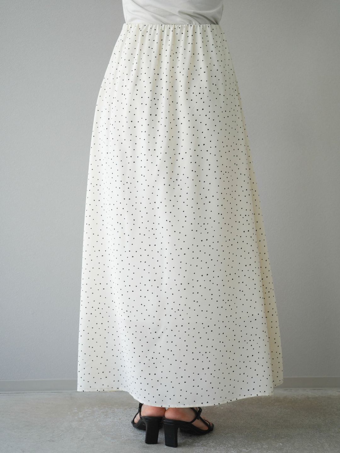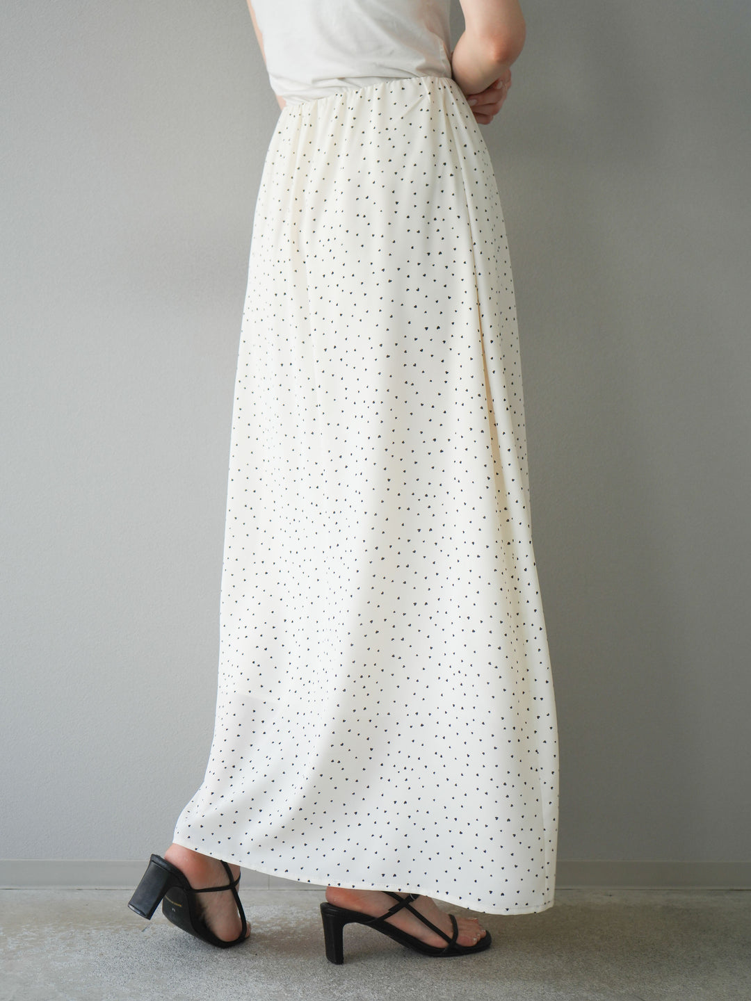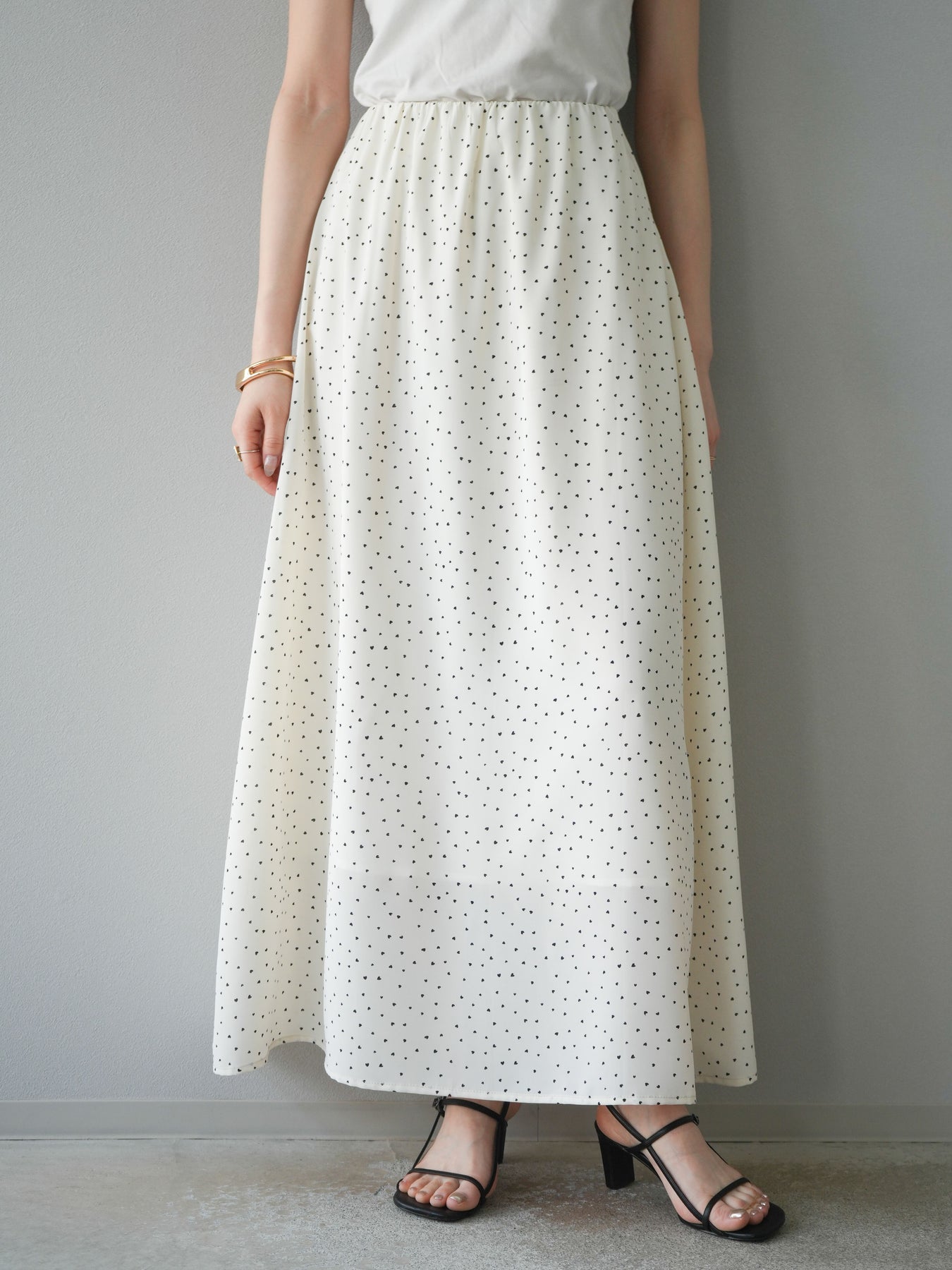 小さなハート型ドットが愛らしい、トレンド感たっぷりのロングスカート。裾に向かって広がる軽やかなフレアシルエットが、女性らしさを引き立てます。ウエストはゴム仕様でリラックスした穿き心地。シンプルなトップスと合わせても華やかな印象に仕上がる一着です。デイリーからお出かけスタイルまで幅広く活躍。 ※ボトムス、キャミソール(インナー)以外の商品は一律でインナーは付属していません