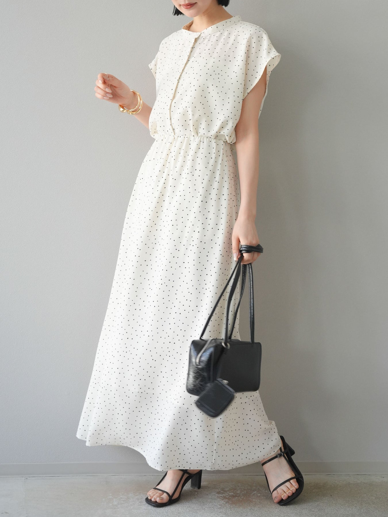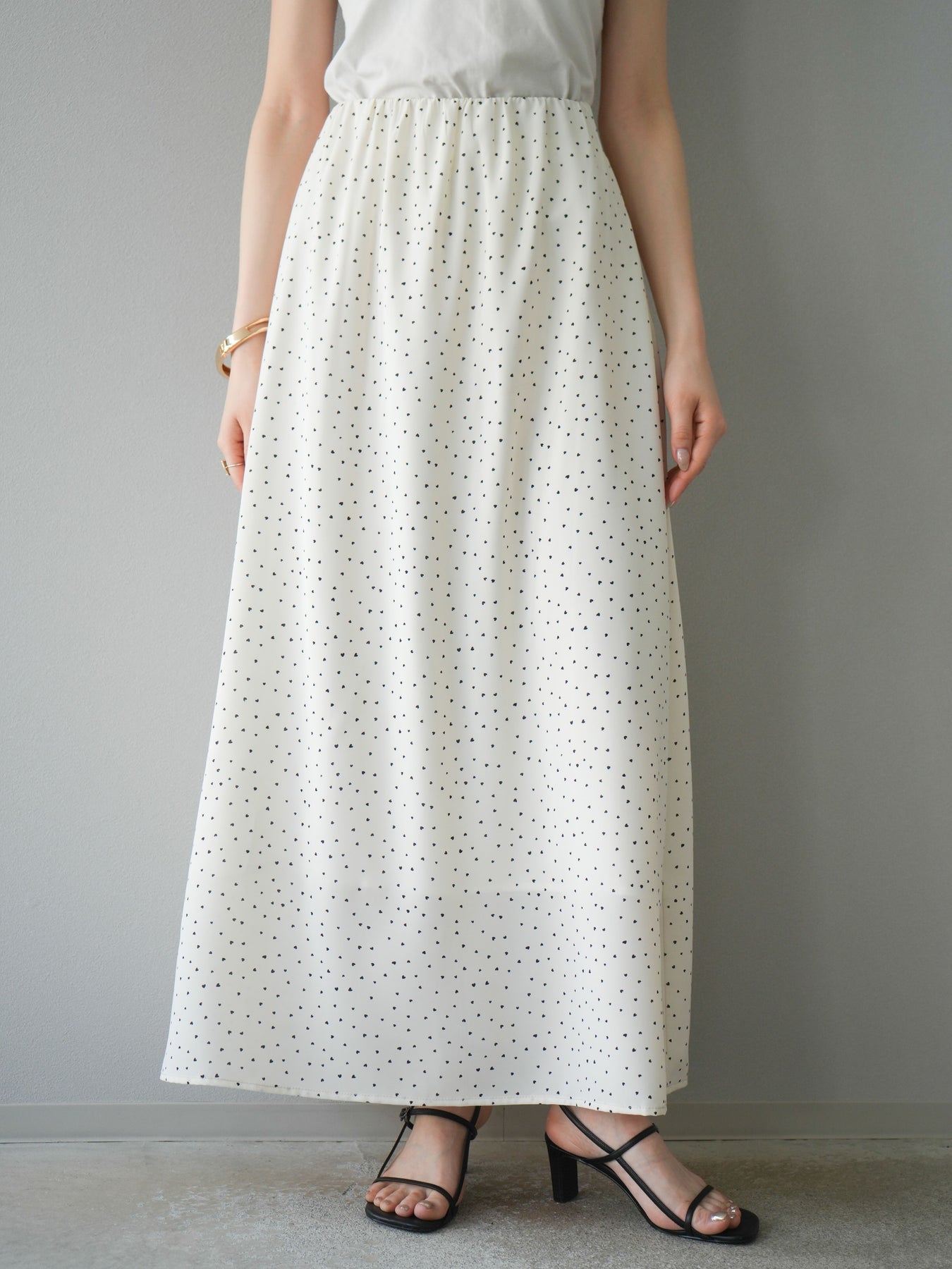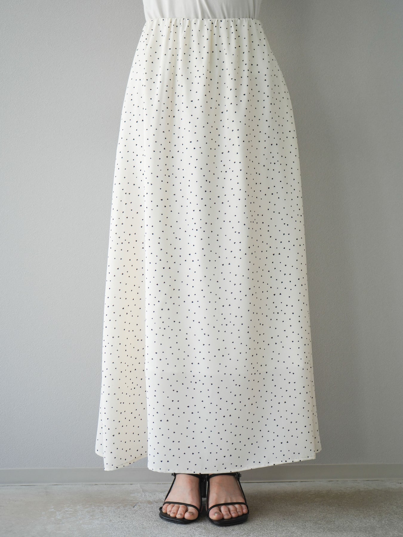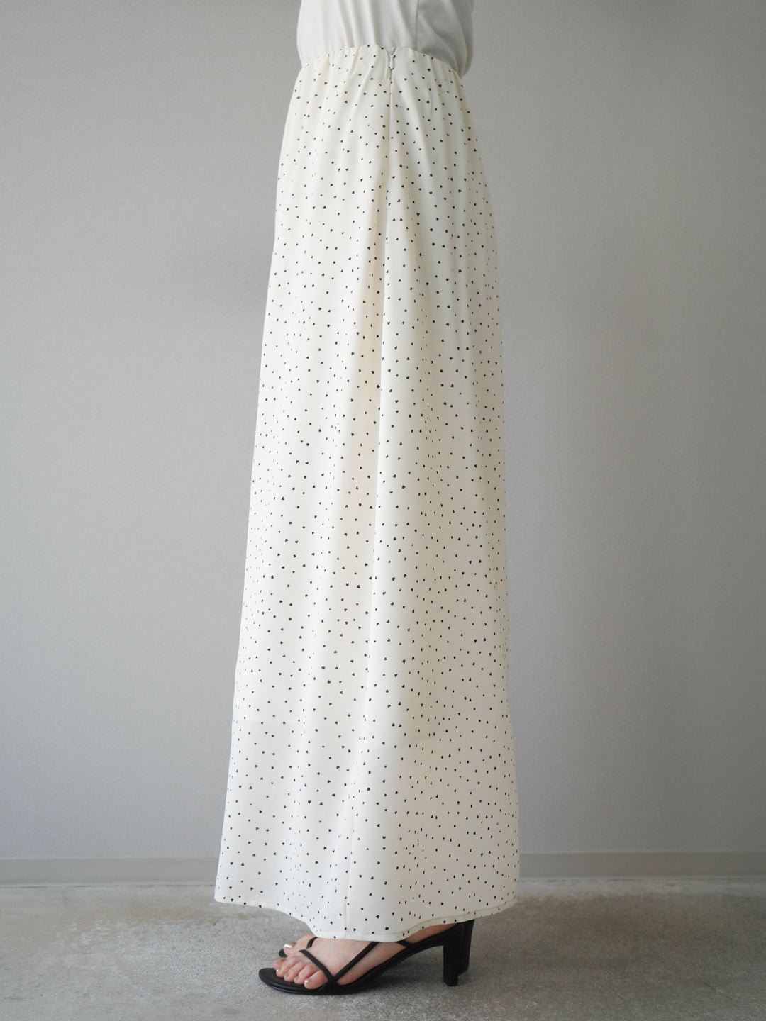 小さなハート型ドットが愛らしい、トレンド感たっぷりのロングスカート。裾に向かって広がる軽やかなフレアシルエットが、女性らしさを引き立てます。ウエストはゴム仕様でリラックスした穿き心地。シンプルなトップスと合わせても華やかな印象に仕上がる一着です。デイリーからお出かけスタイルまで幅広く活躍。 ※ボトムス、キャミソール(インナー)以外の商品は一律でインナーは付属していません