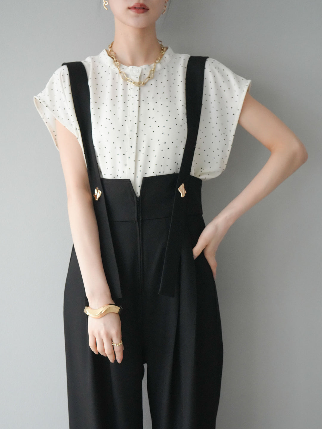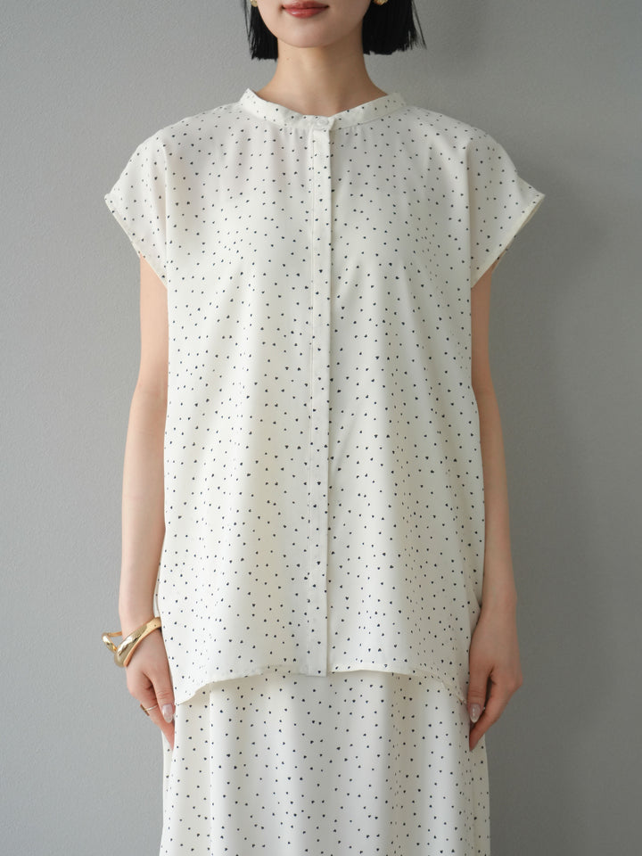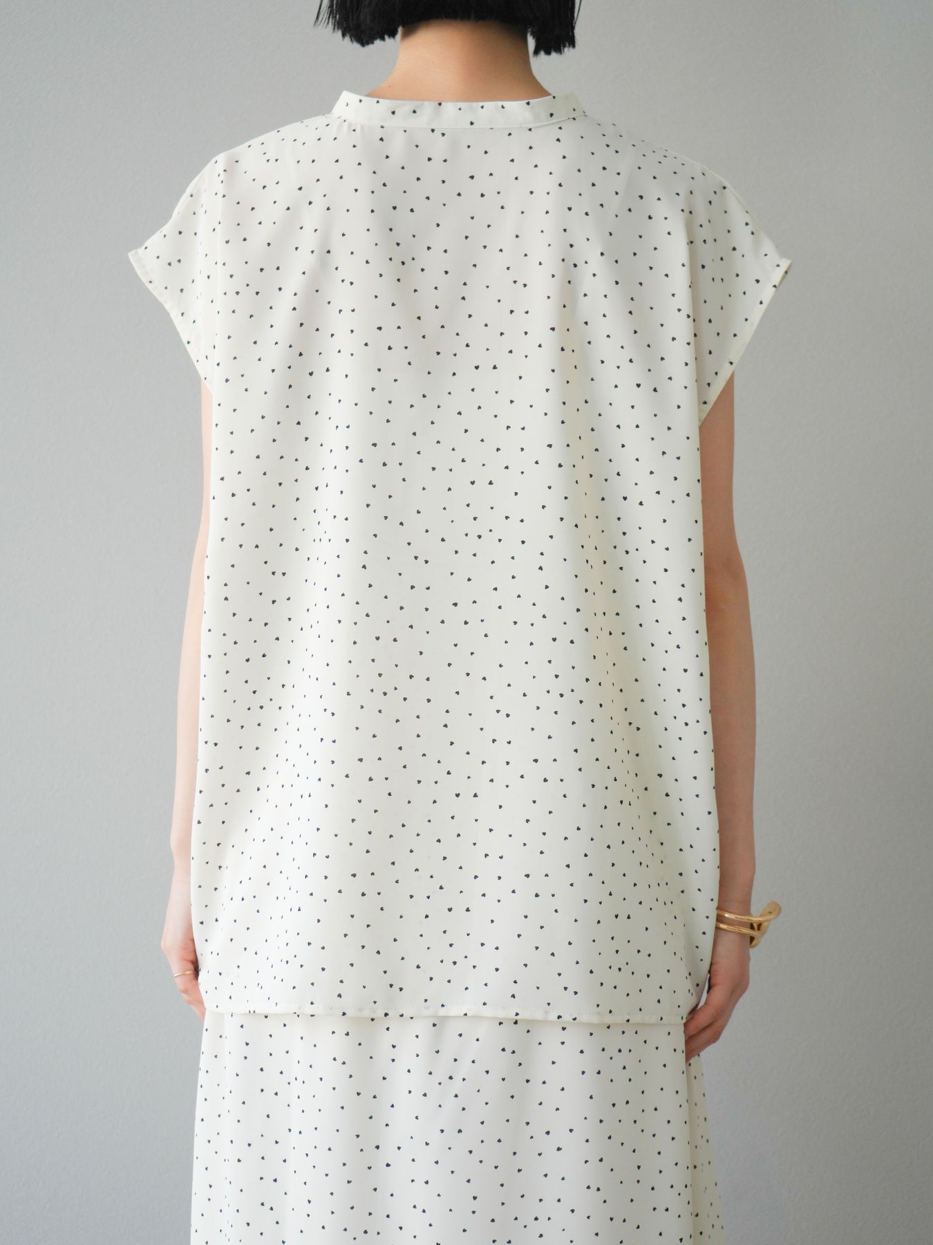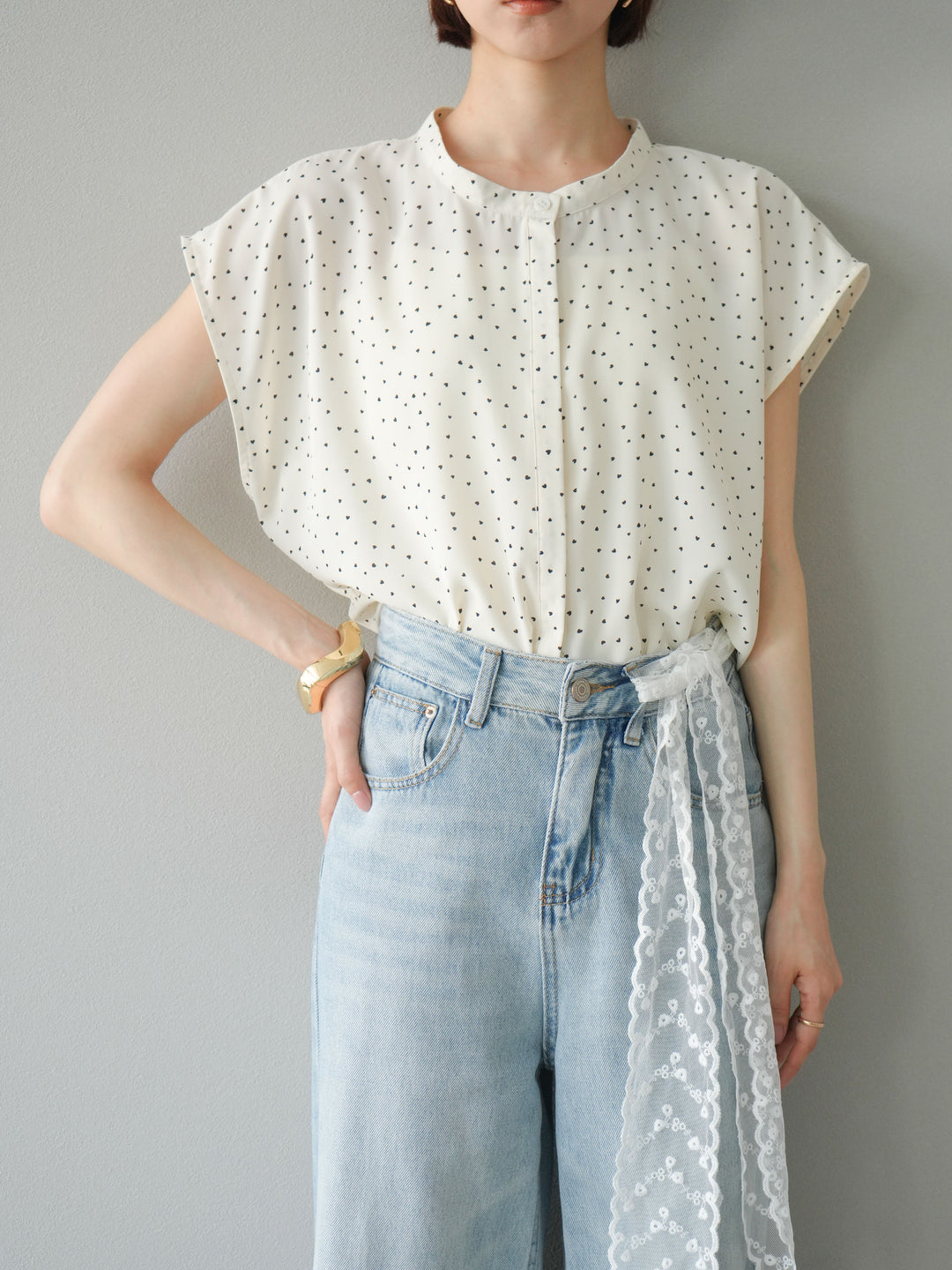 小さなハート柄を散りばめた、愛らしさあふれるフレンチスリーブブラウス。さらりとした軽やかな生地感で、暑い季節も快適に着用できます。フロントの比翼仕立てが上品な印象を演出し、カジュアルにもきれいめにも幅広く活躍。ボトムスインでもアウトでもバランスよく決まる丈感で、デイリーコーデに取り入れやすい一枚です。 ※ボトムス、キャミソール(インナー)以外の商品は一律でインナーは付属していません