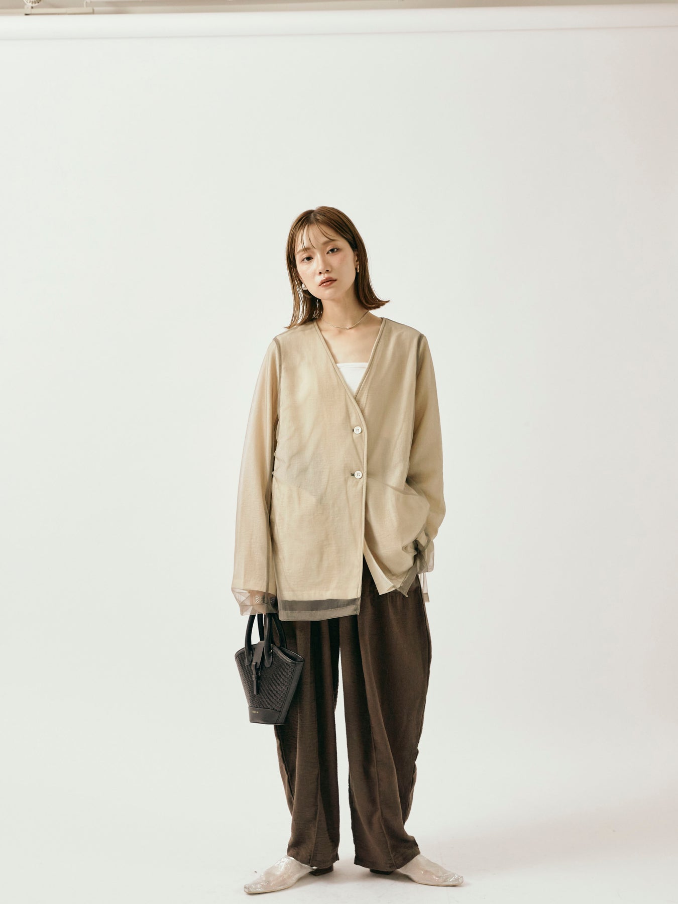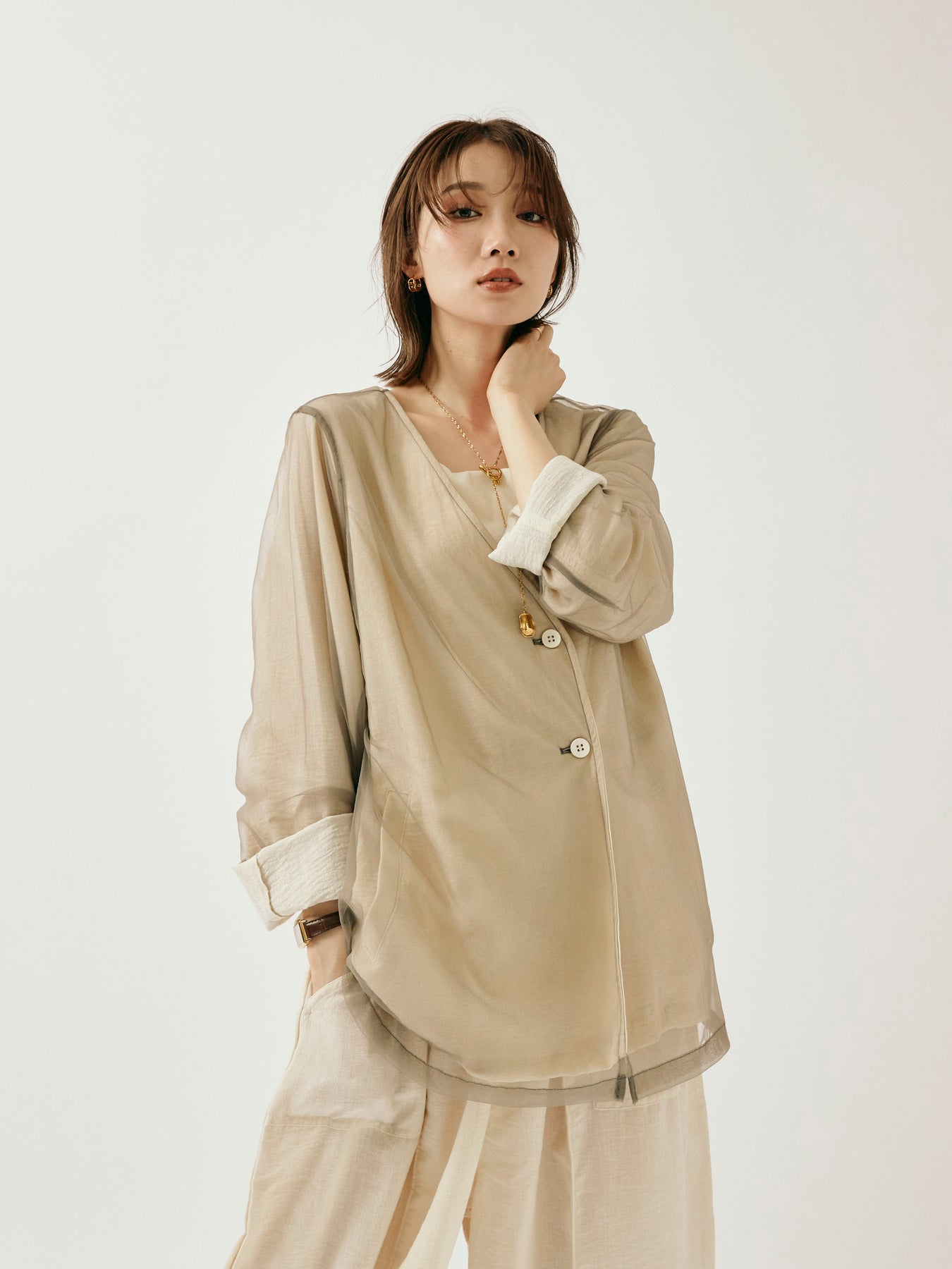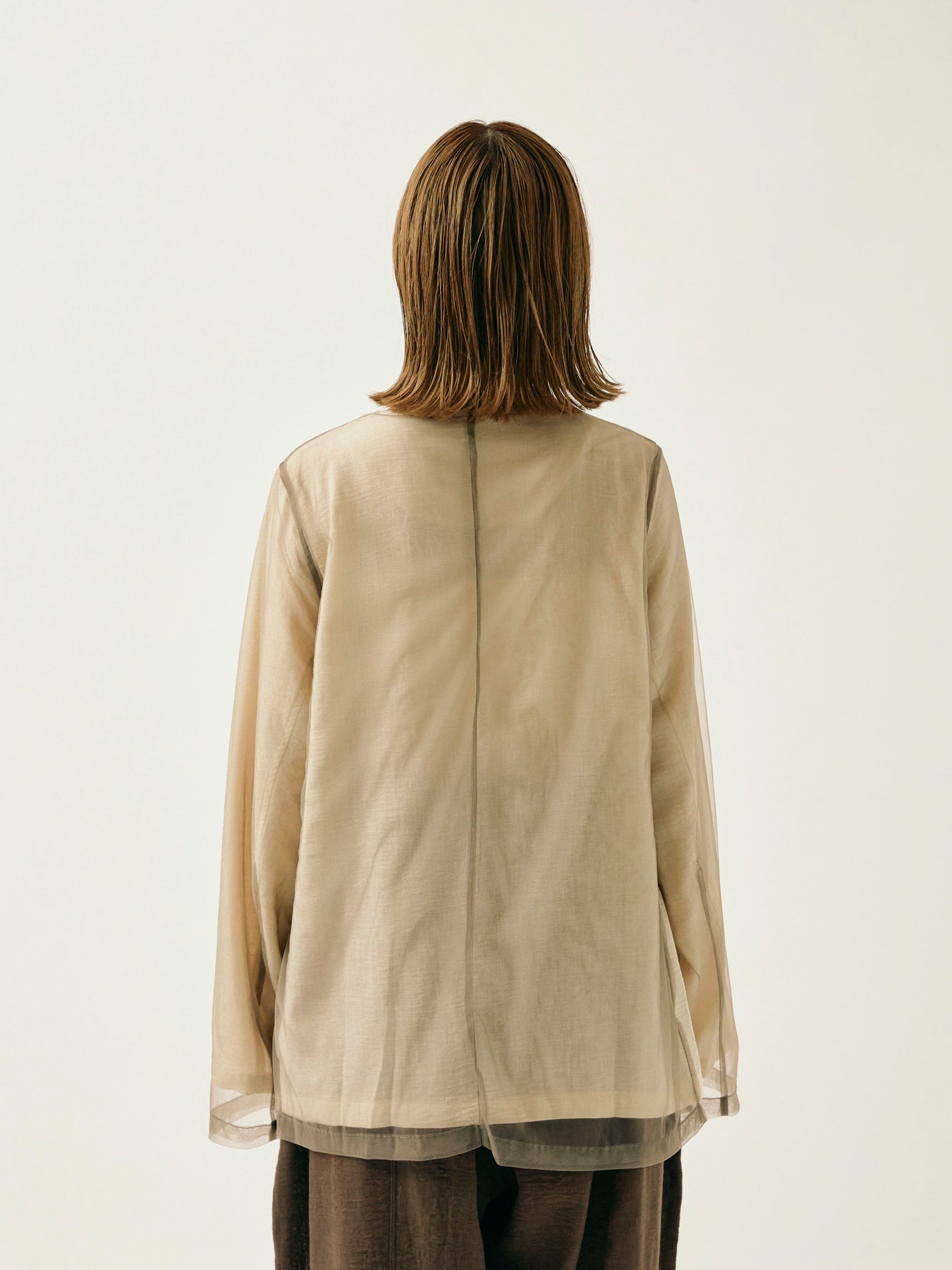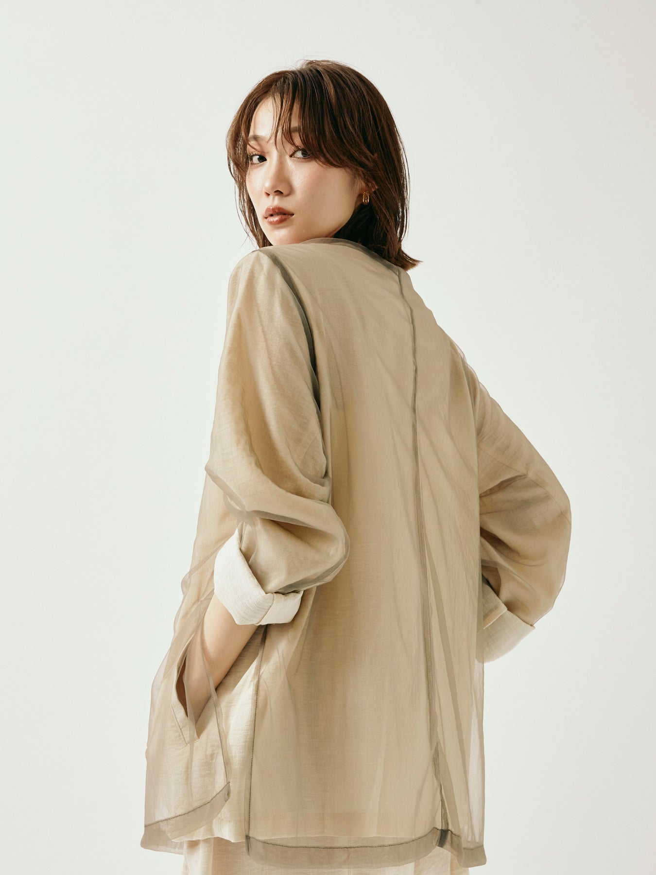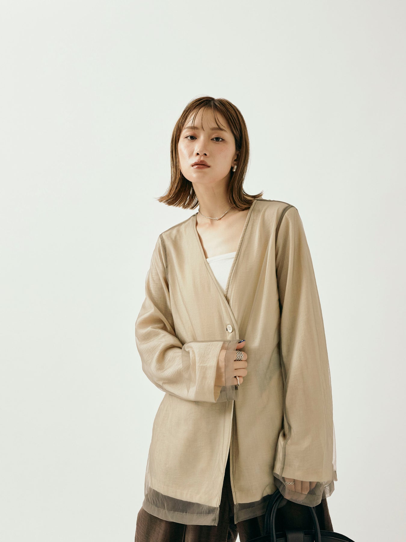 ふんわりと重ねたチュールが目を引く、軽やかなVネックジャケット。 程よくシアーな素材感が、春夏の羽織りとして抜け感のあるスタイリングを叶えます。 シンプルながらも、異素材のレイヤードデザインで奥行きのある印象に。 Vネック仕様で顔まわりもすっきりと見せつつ、着回しやすい万能な一着。 デニムやワンピースにさらっと羽織るだけで、スタイリングが格上げされるアイテムです。 ※ボトムス、キャミソール(インナー)以外の商品は一律でインナーは付属していません。