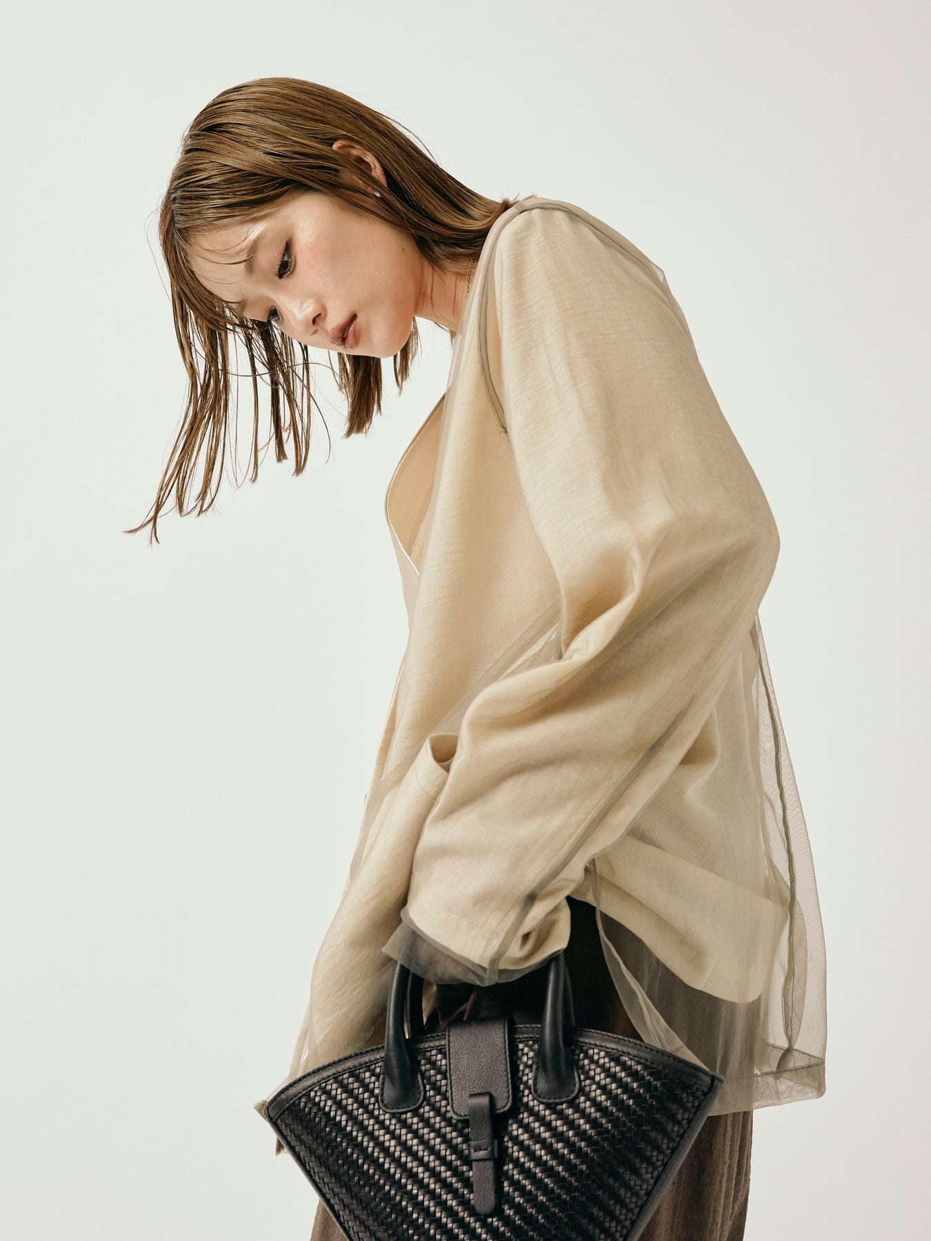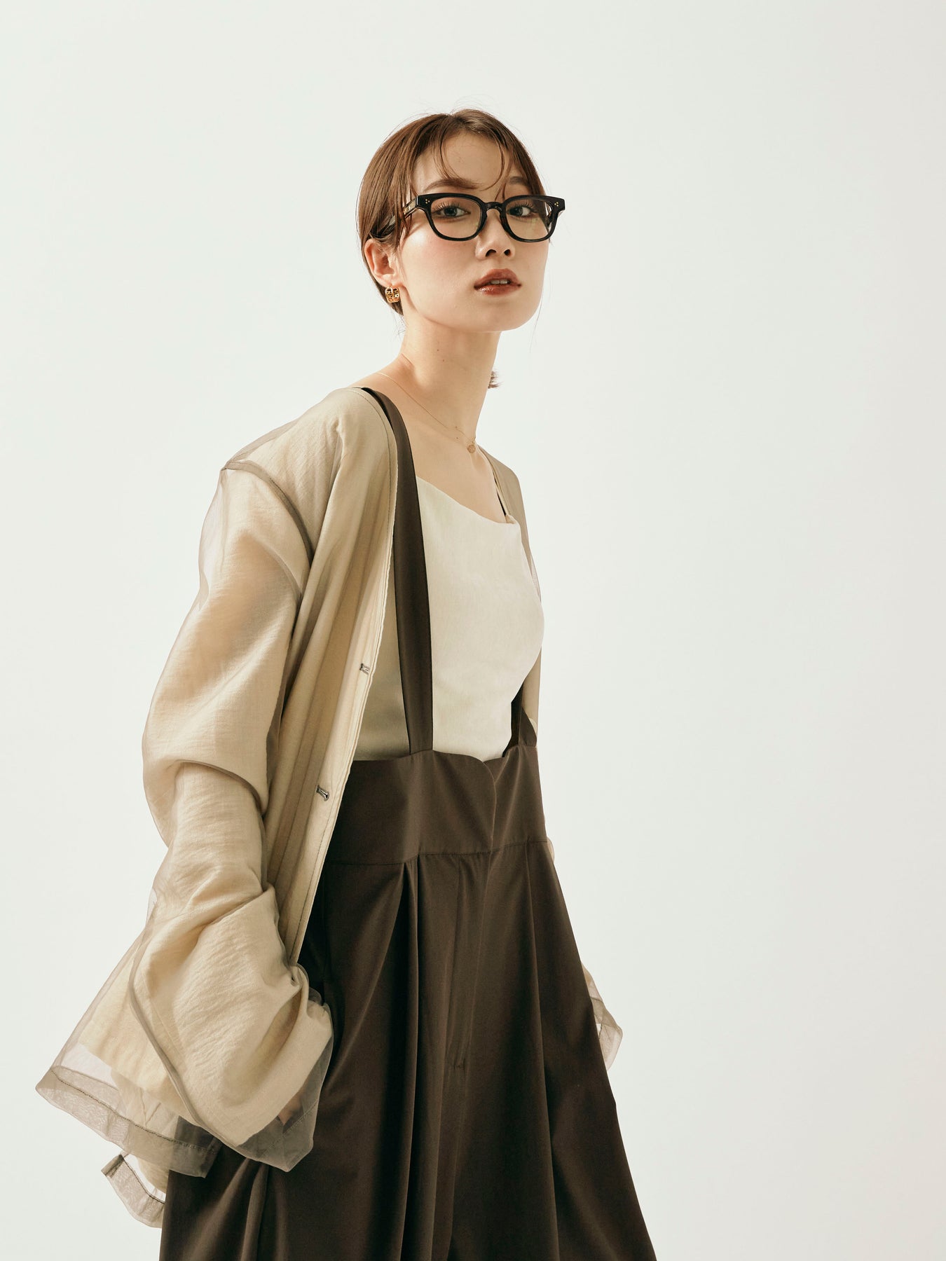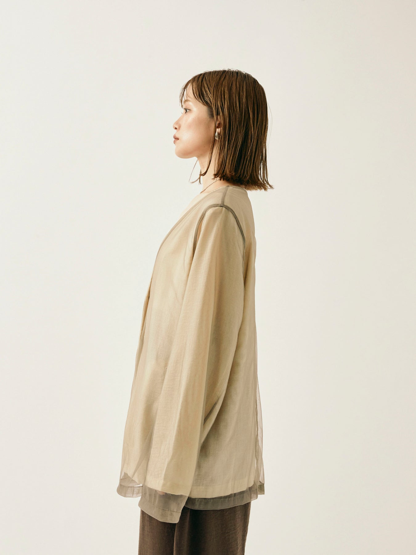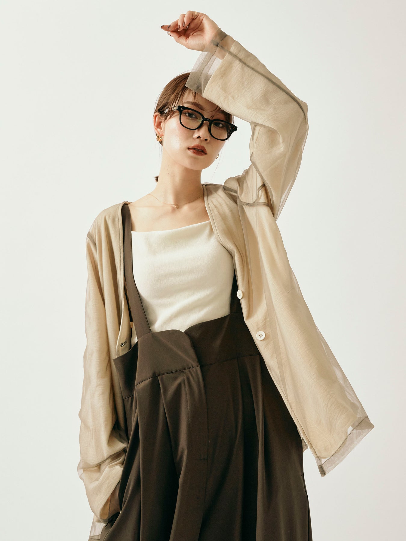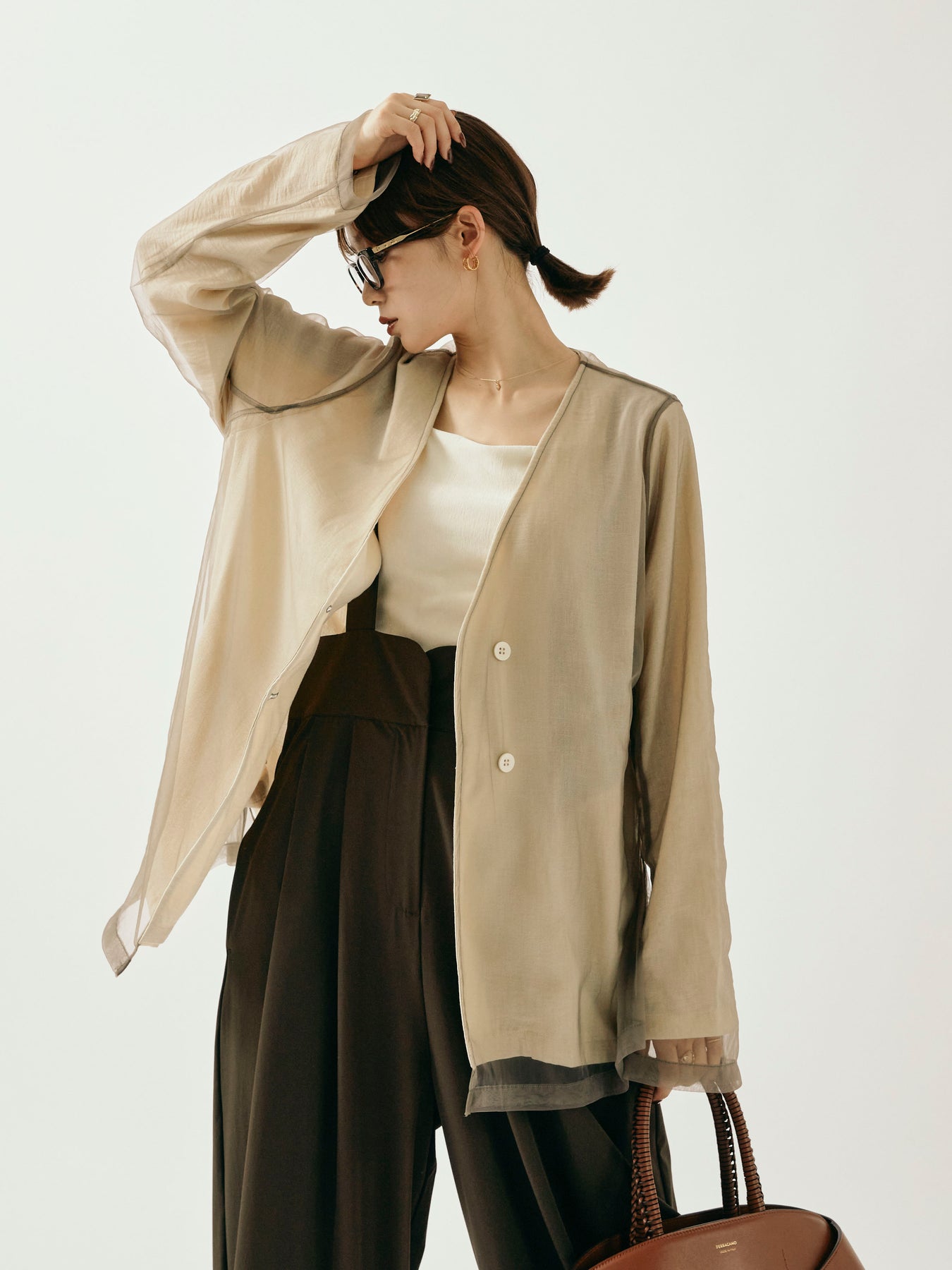 ふんわりと重ねたチュールが目を引く、軽やかなVネックジャケット。 程よくシアーな素材感が、春夏の羽織りとして抜け感のあるスタイリングを叶えます。 シンプルながらも、異素材のレイヤードデザインで奥行きのある印象に。 Vネック仕様で顔まわりもすっきりと見せつつ、着回しやすい万能な一着。 デニムやワンピースにさらっと羽織るだけで、スタイリングが格上げされるアイテムです。 ※ボトムス、キャミソール(インナー)以外の商品は一律でインナーは付属していません。