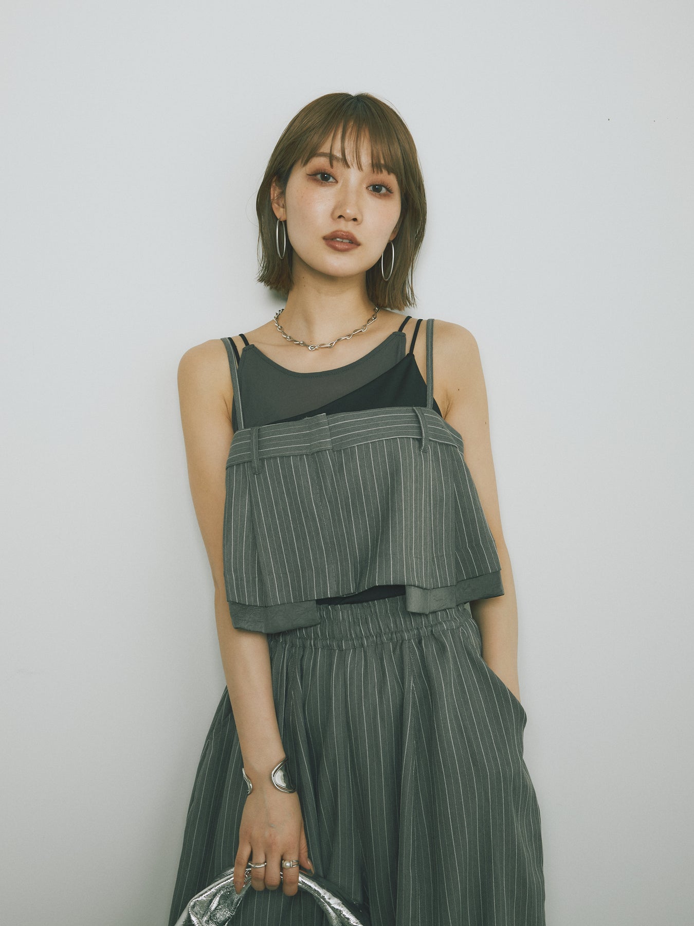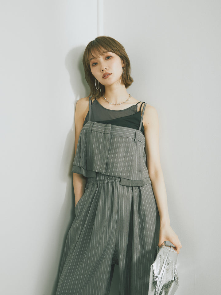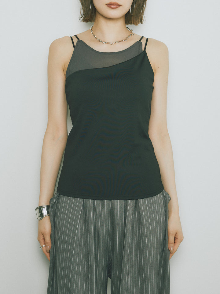 チュールとのレイヤード風デザインが目を引くカップ付きキャミソール。シアー感のある異素材使いで、1枚で着映えるアイテムに仕上げました。細ストラップで華奢見えも叶い、インナー使いにも便利な一着。伸縮性のある柔らかな生地とカップ付きで、着心地の良さと安心感を兼ね備えています。レイヤードスタイルのアクセントにもおすすめです。 ※ボトムス、キャミソール(インナー)以外の商品は一律でインナーは付属していません