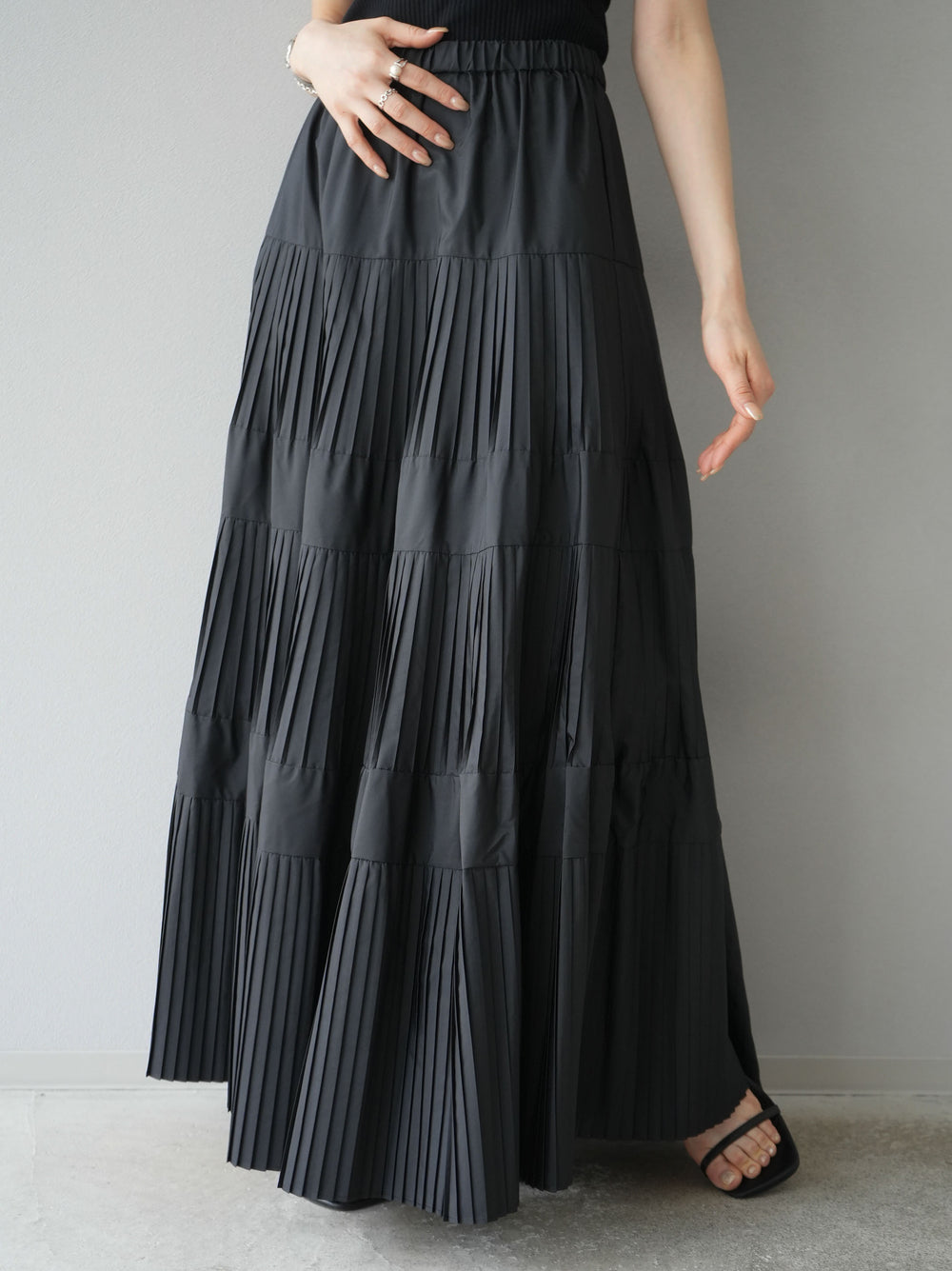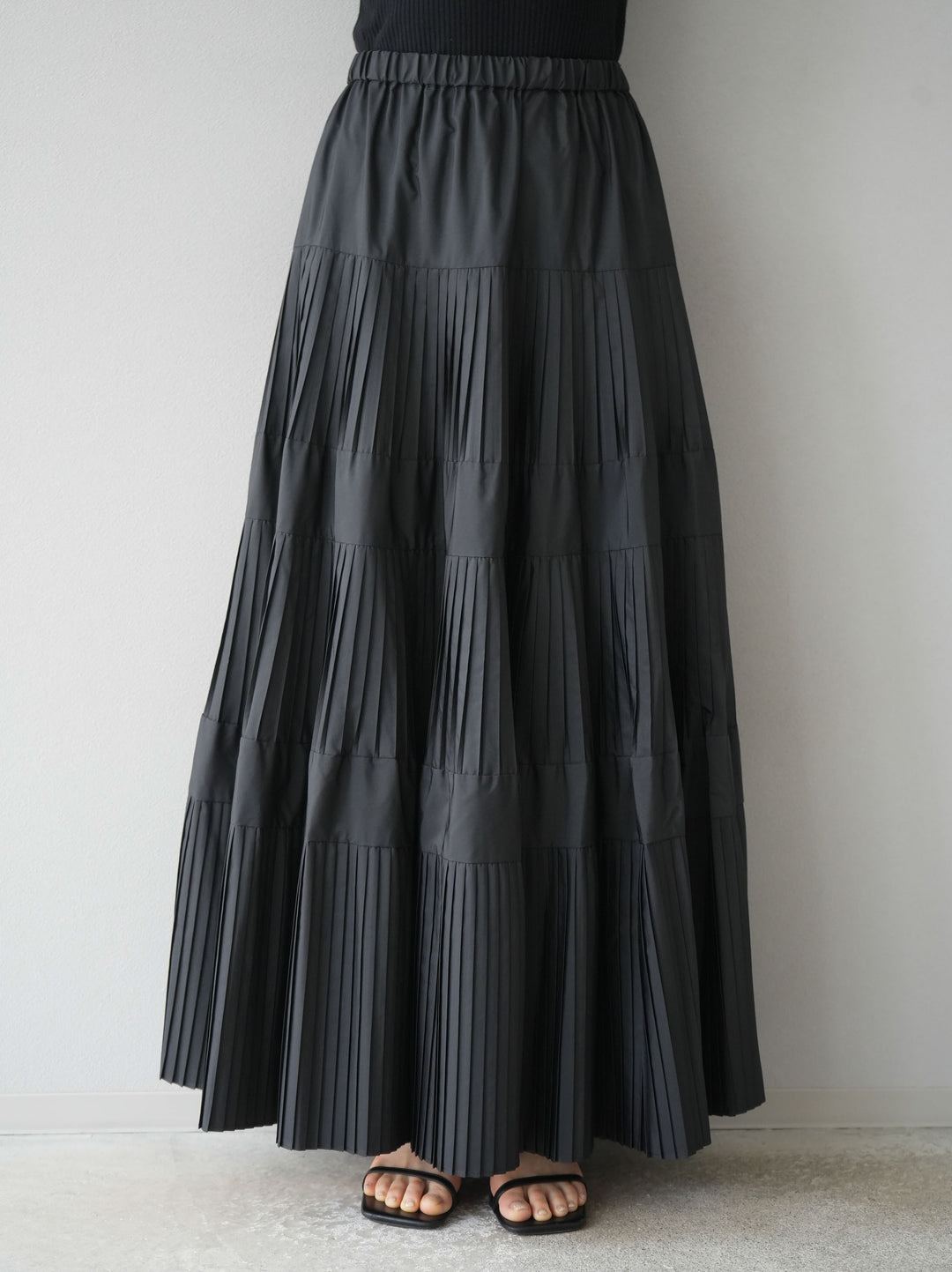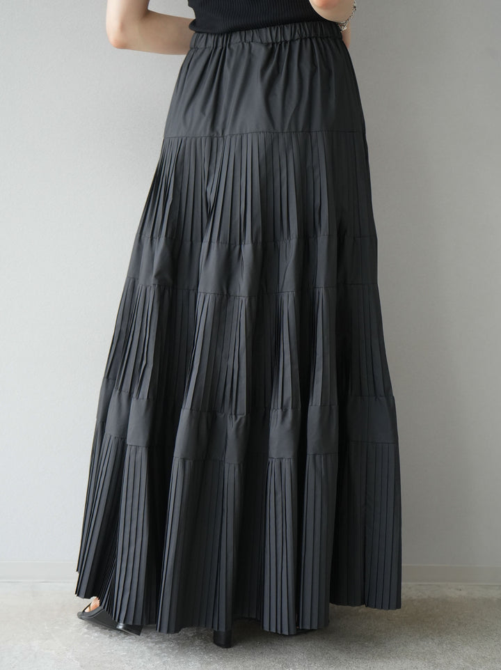 シルエットに動きをもたらすプリーツ加工が、エレガントな表情を引き立てるティアードスカート。歩くたびに揺れる裾がフェミニンなムードを演出し、軽やかな着心地を実現。ウエストゴム仕様で、快適なフィット感を提供し、デイリーにも取り入れやすいアイテムです。トレンド感のあるデザインで、さりげないアクセントとして、シンプルなトップスと合わせるだけで洗練されたスタイリングが完成します。