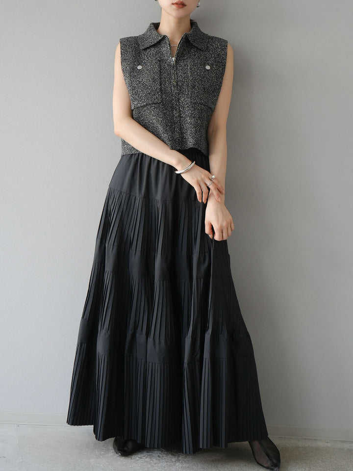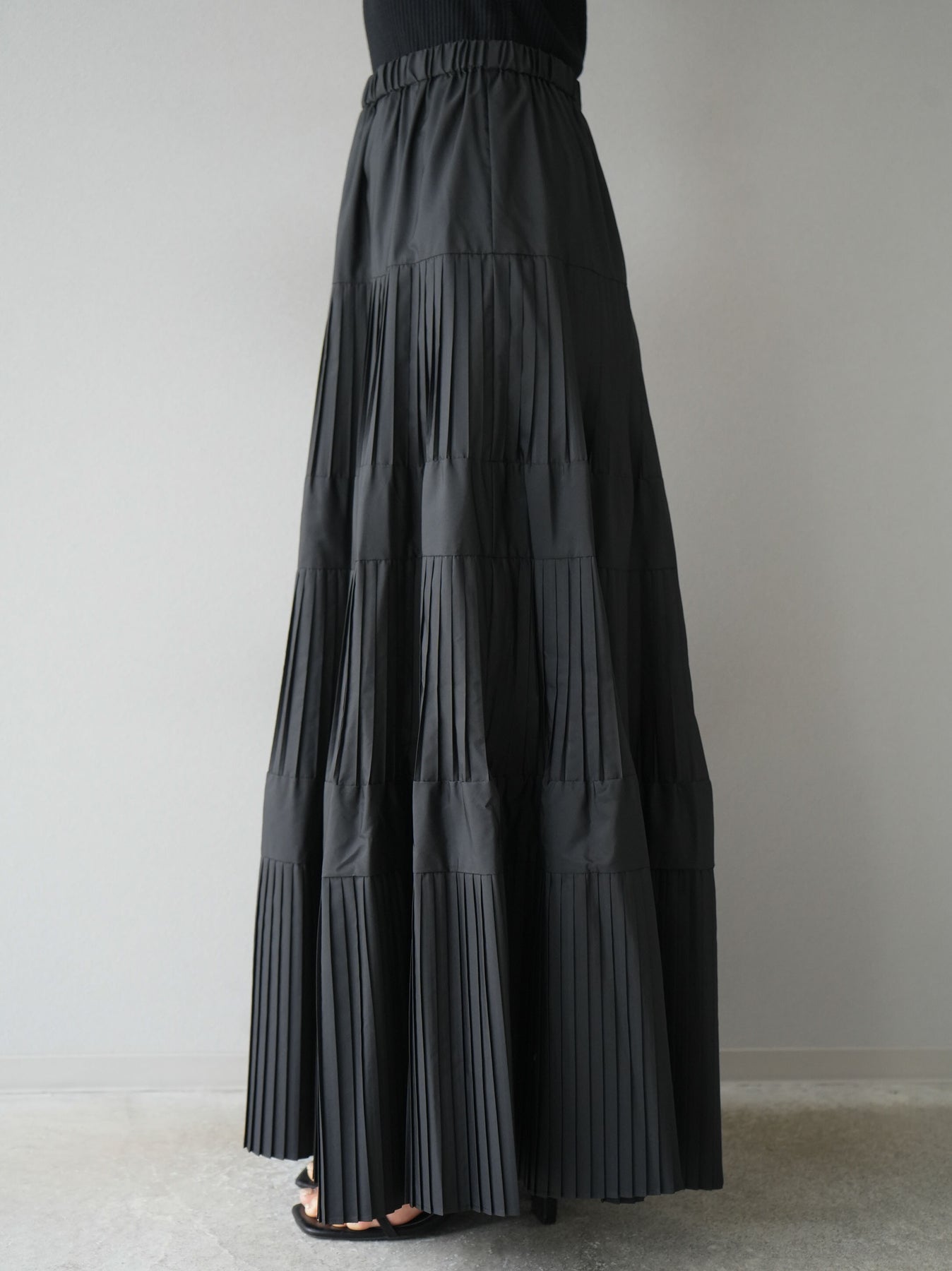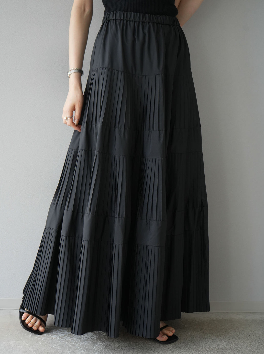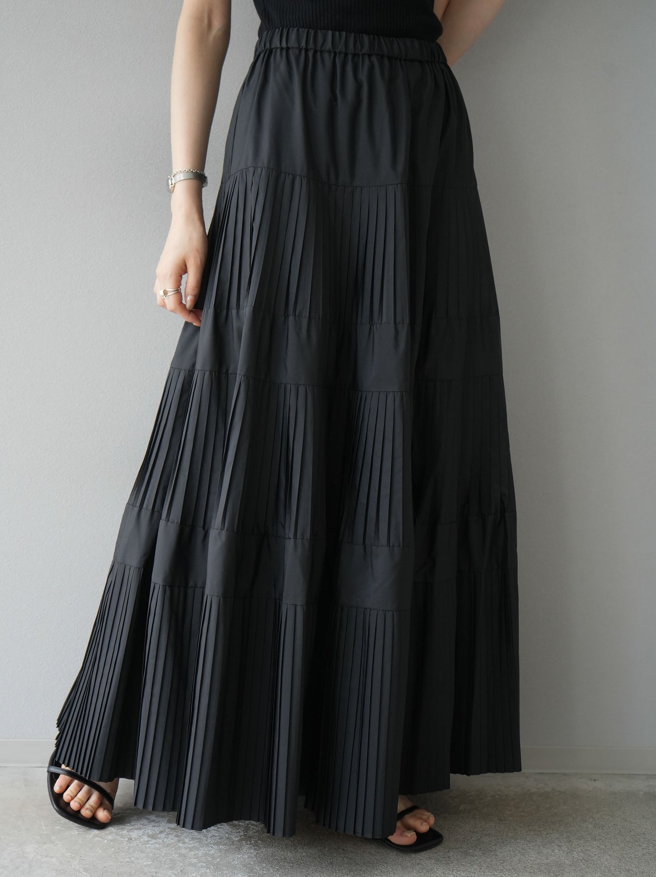シルエットに動きをもたらすプリーツ加工が、エレガントな表情を引き立てるティアードスカート。歩くたびに揺れる裾がフェミニンなムードを演出し、軽やかな着心地を実現。ウエストゴム仕様で、快適なフィット感を提供し、デイリーにも取り入れやすいアイテムです。トレンド感のあるデザインで、さりげないアクセントとして、シンプルなトップスと合わせるだけで洗練されたスタイリングが完成します。