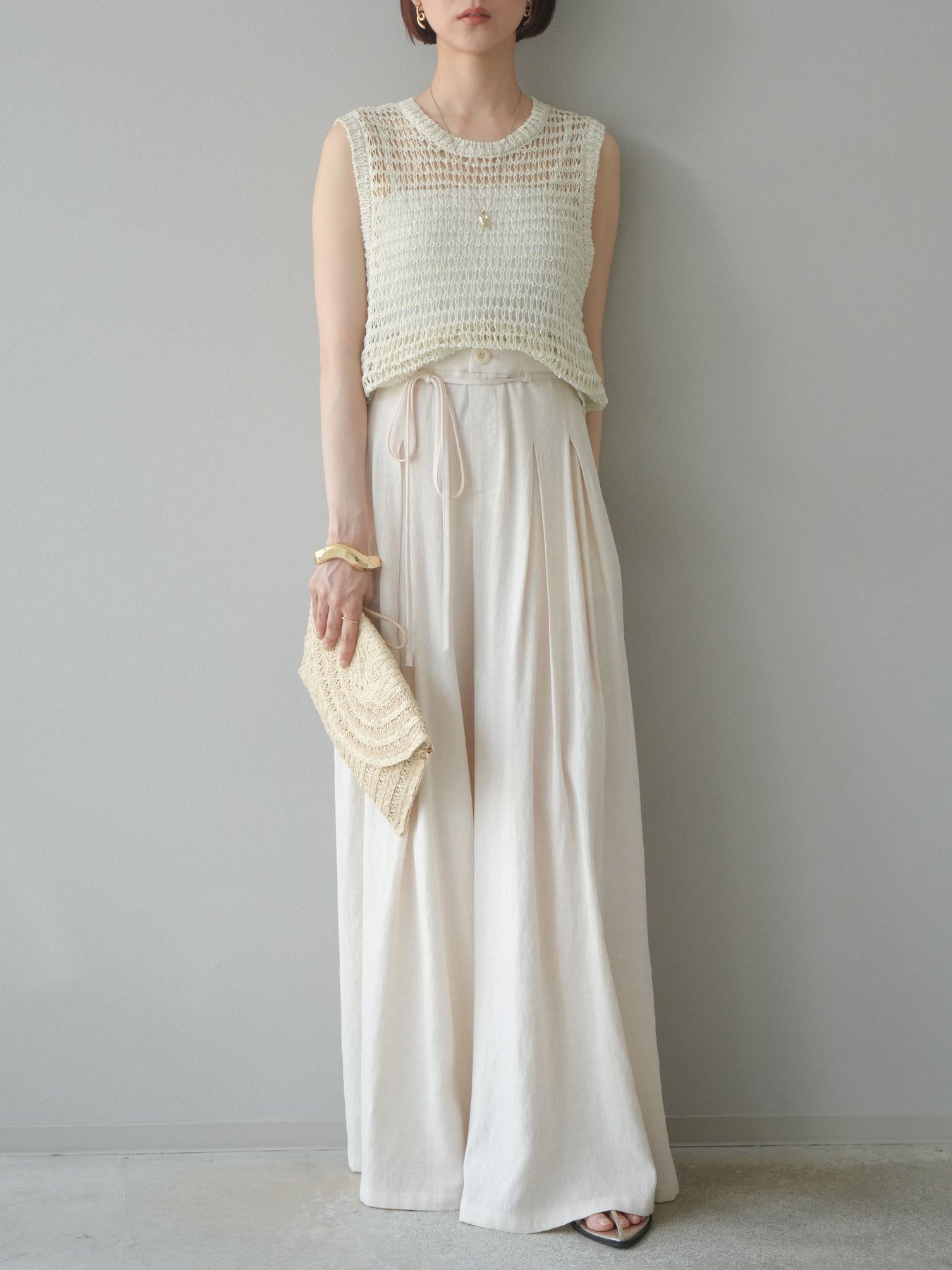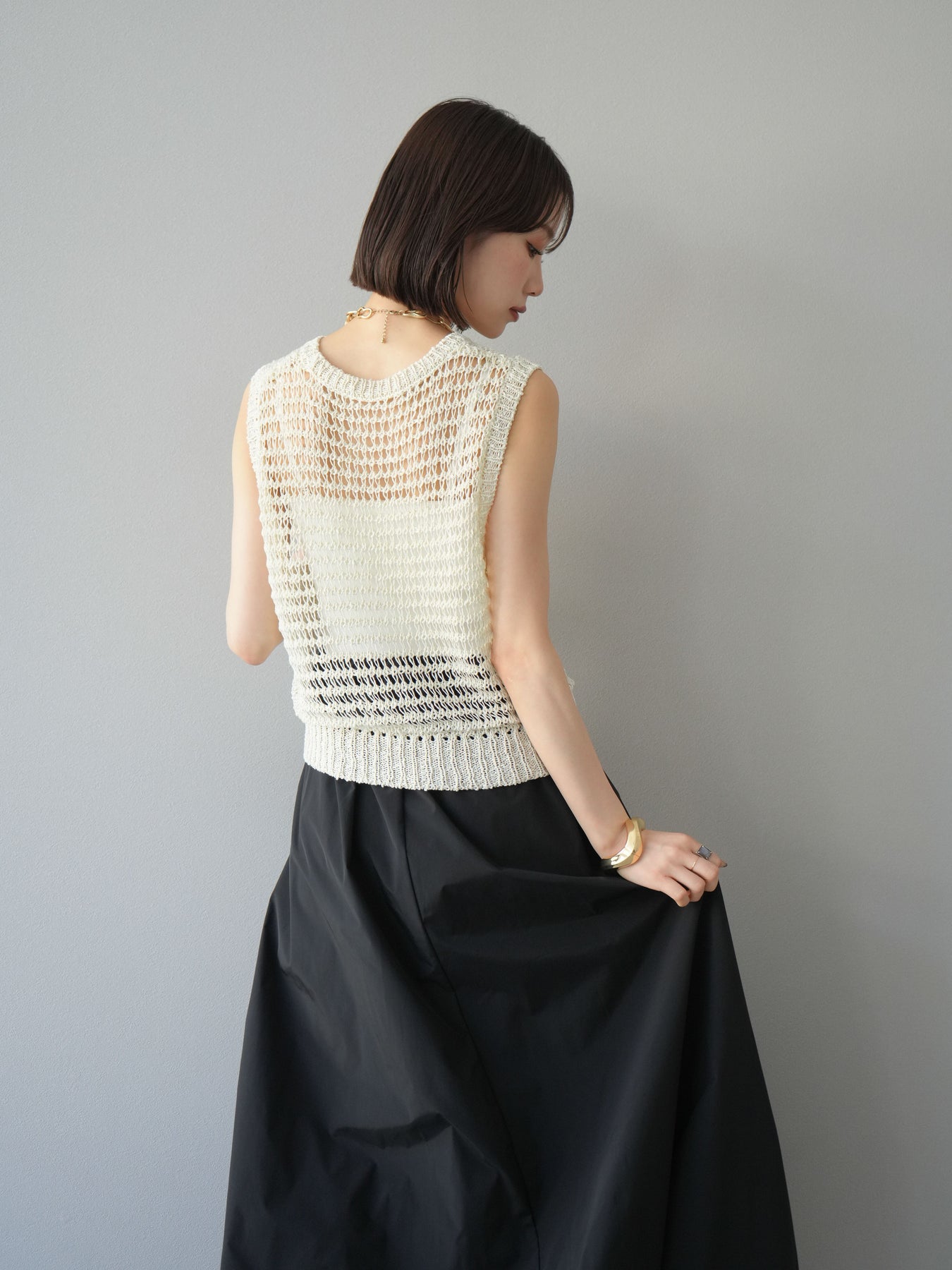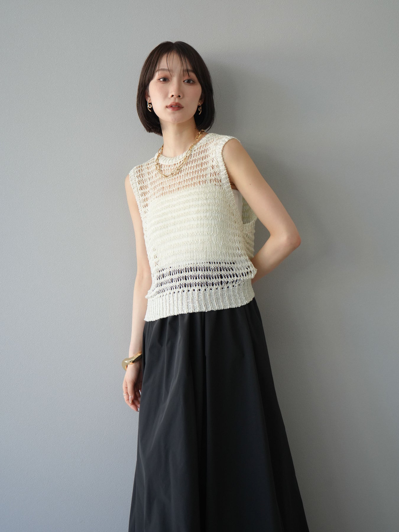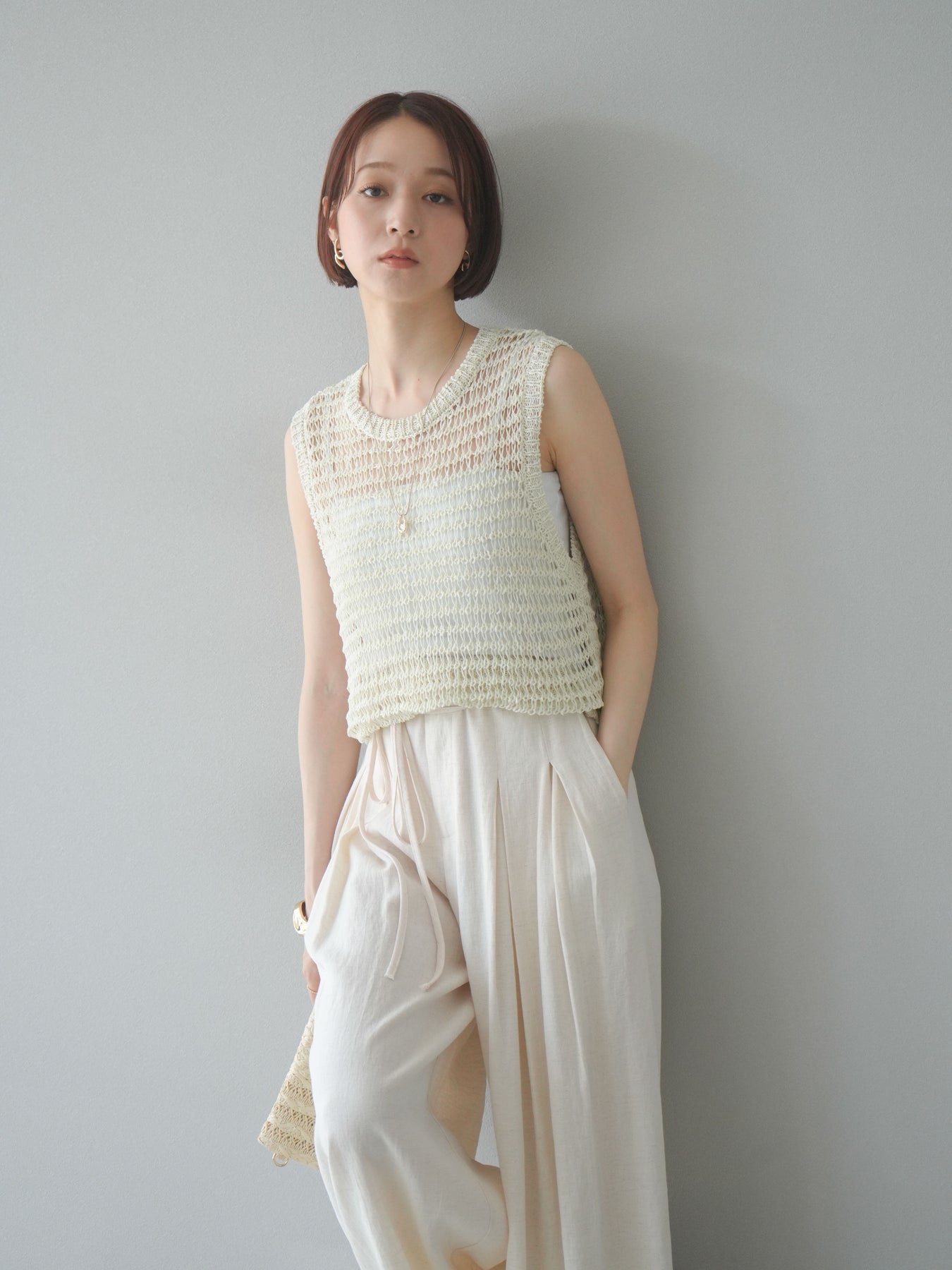 表情豊かなミックスヤーンで編み上げた、透かし編みデザインのニットタンクトップ。ざっくりとした編み地とナチュラルな透け感が、シーズンムードを高める一着です。コンパクトな丈感でバランスが取りやすく、ワイドパンツやスカートとも好相性。インナーとのレイヤードを楽しめるデザインで、カジュアルにもフェミニンにもスタイリングが可能です。春夏の着こなしに抜け感をプラスしてくれる、涼しげなサマーニットです。 ※ボトムス、キャミソール(インナー)以外の商品は一律でインナーは付属していません。