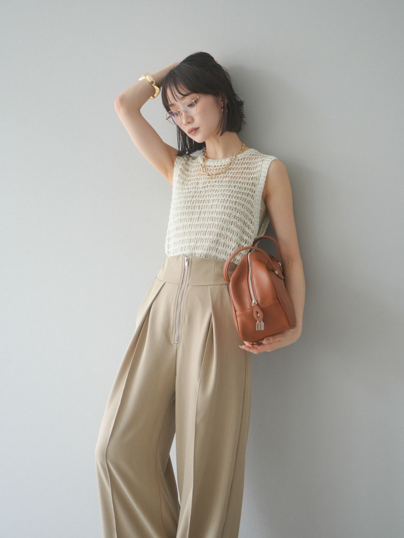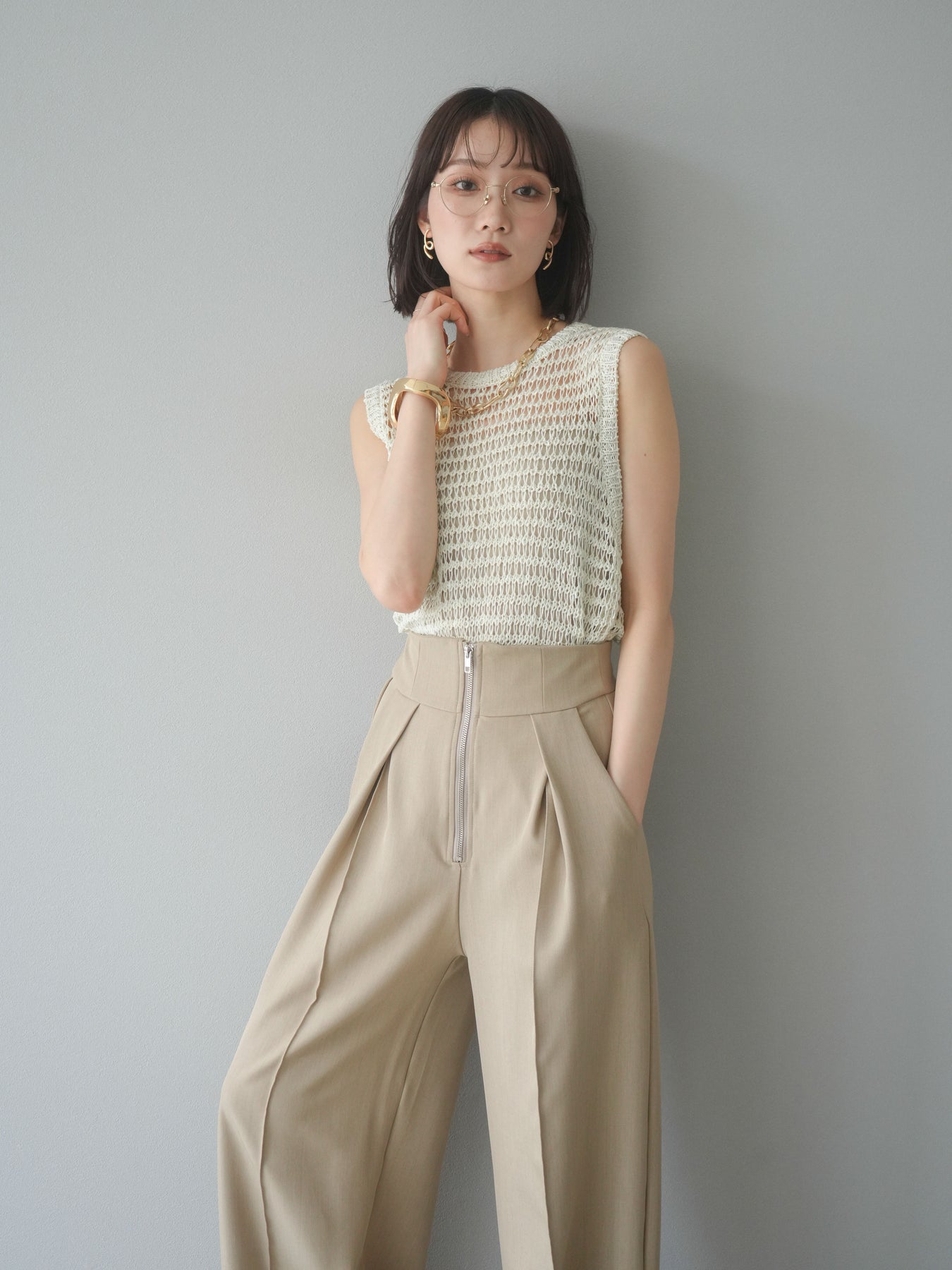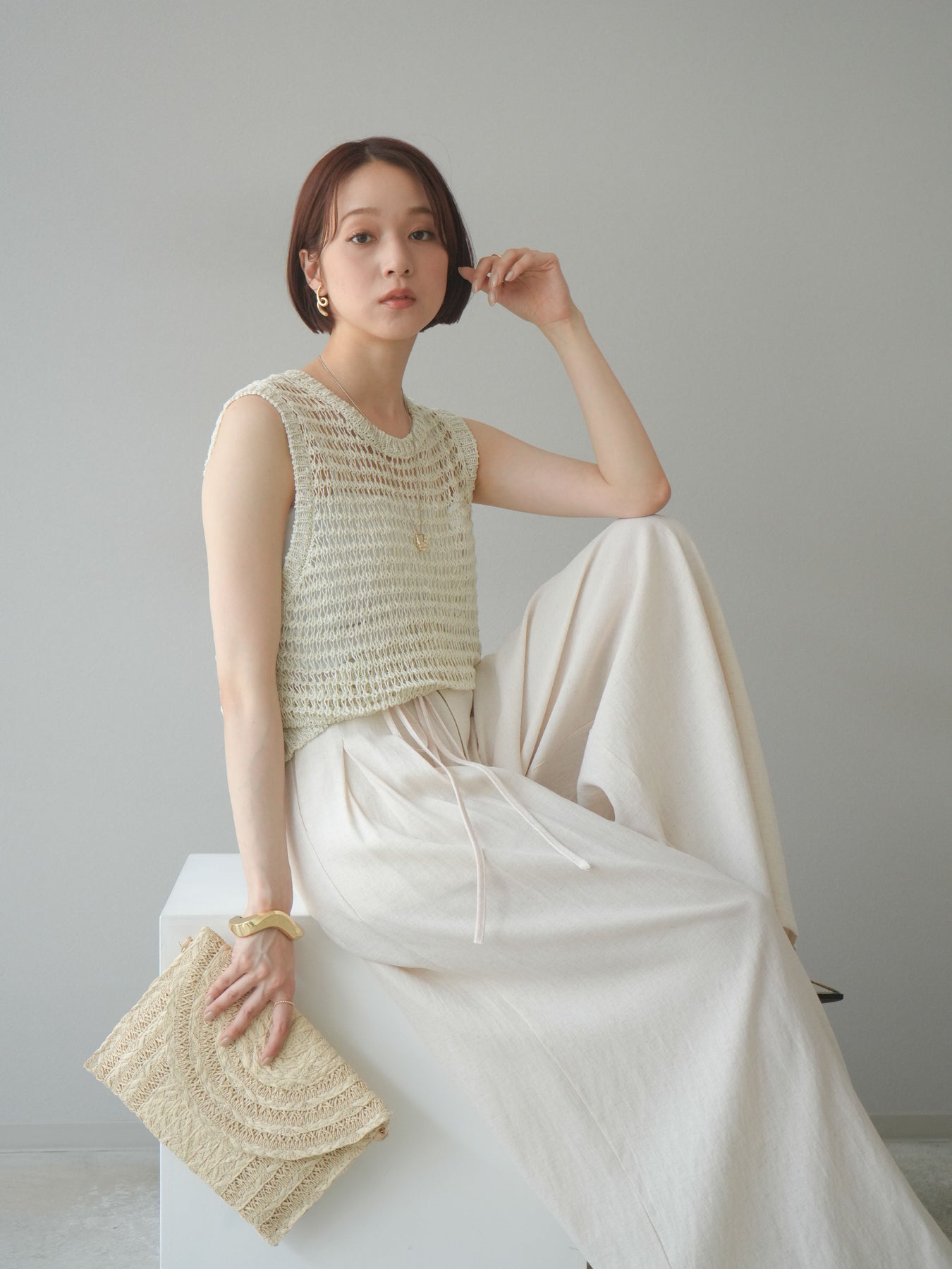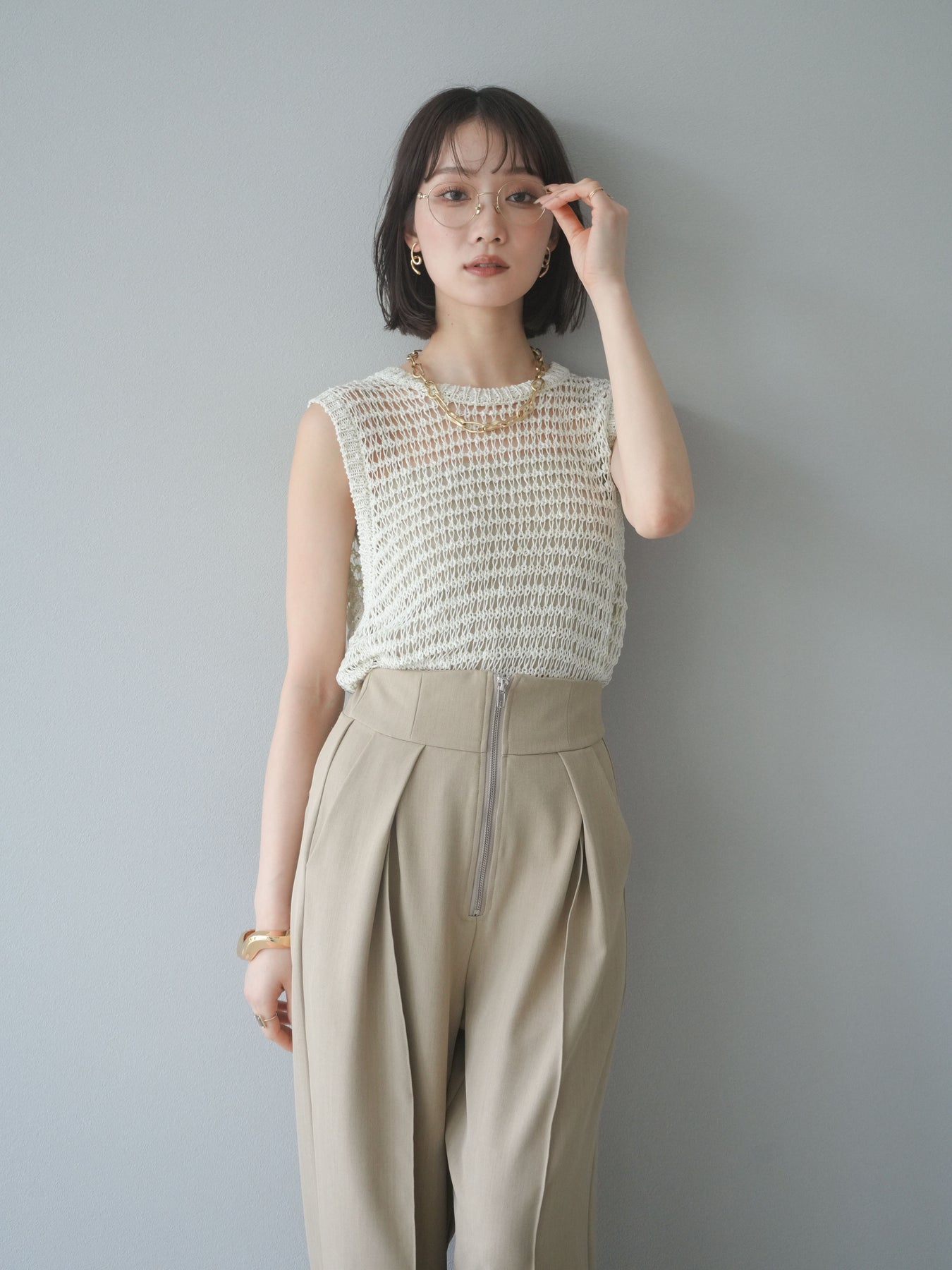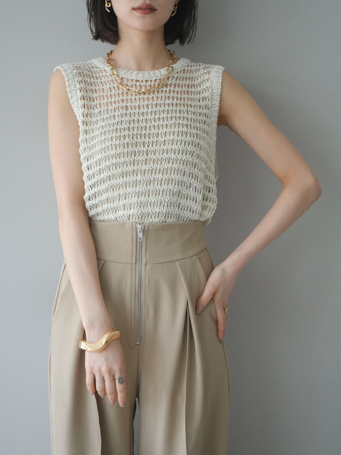 表情豊かなミックスヤーンで編み上げた、透かし編みデザインのニットタンクトップ。ざっくりとした編み地とナチュラルな透け感が、シーズンムードを高める一着です。コンパクトな丈感でバランスが取りやすく、ワイドパンツやスカートとも好相性。インナーとのレイヤードを楽しめるデザインで、カジュアルにもフェミニンにもスタイリングが可能です。春夏の着こなしに抜け感をプラスしてくれる、涼しげなサマーニットです。 ※ボトムス、キャミソール(インナー)以外の商品は一律でインナーは付属していません。