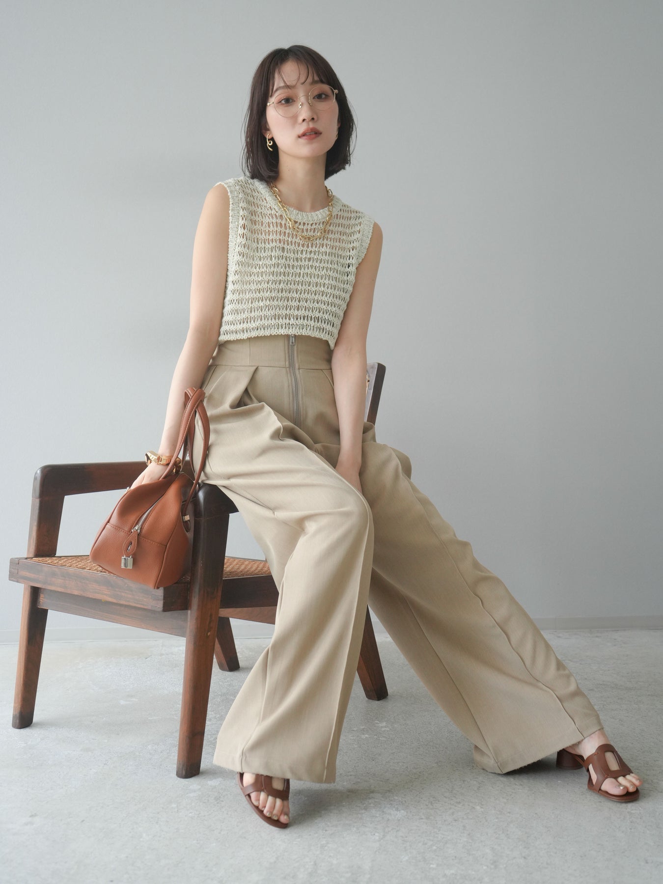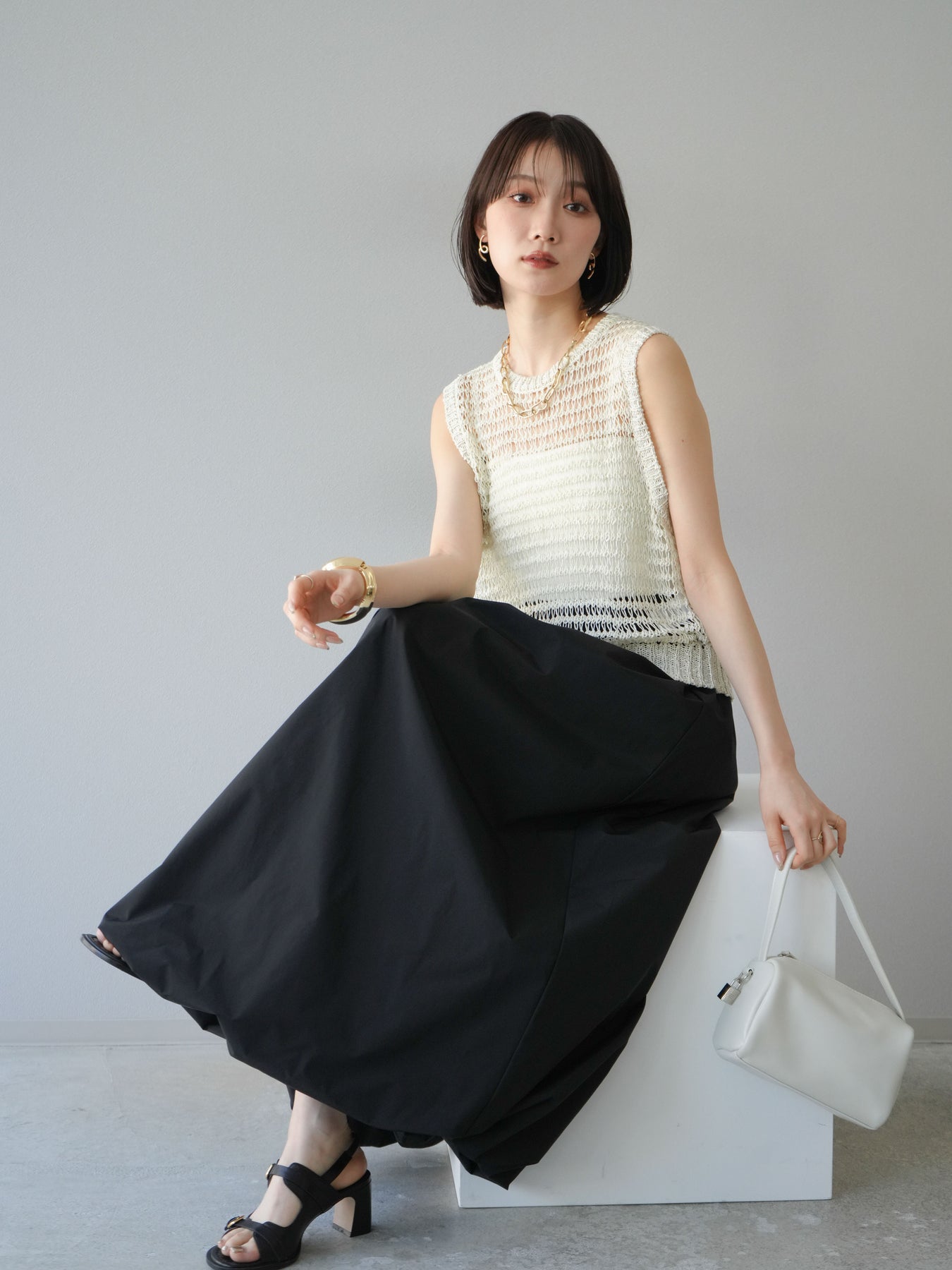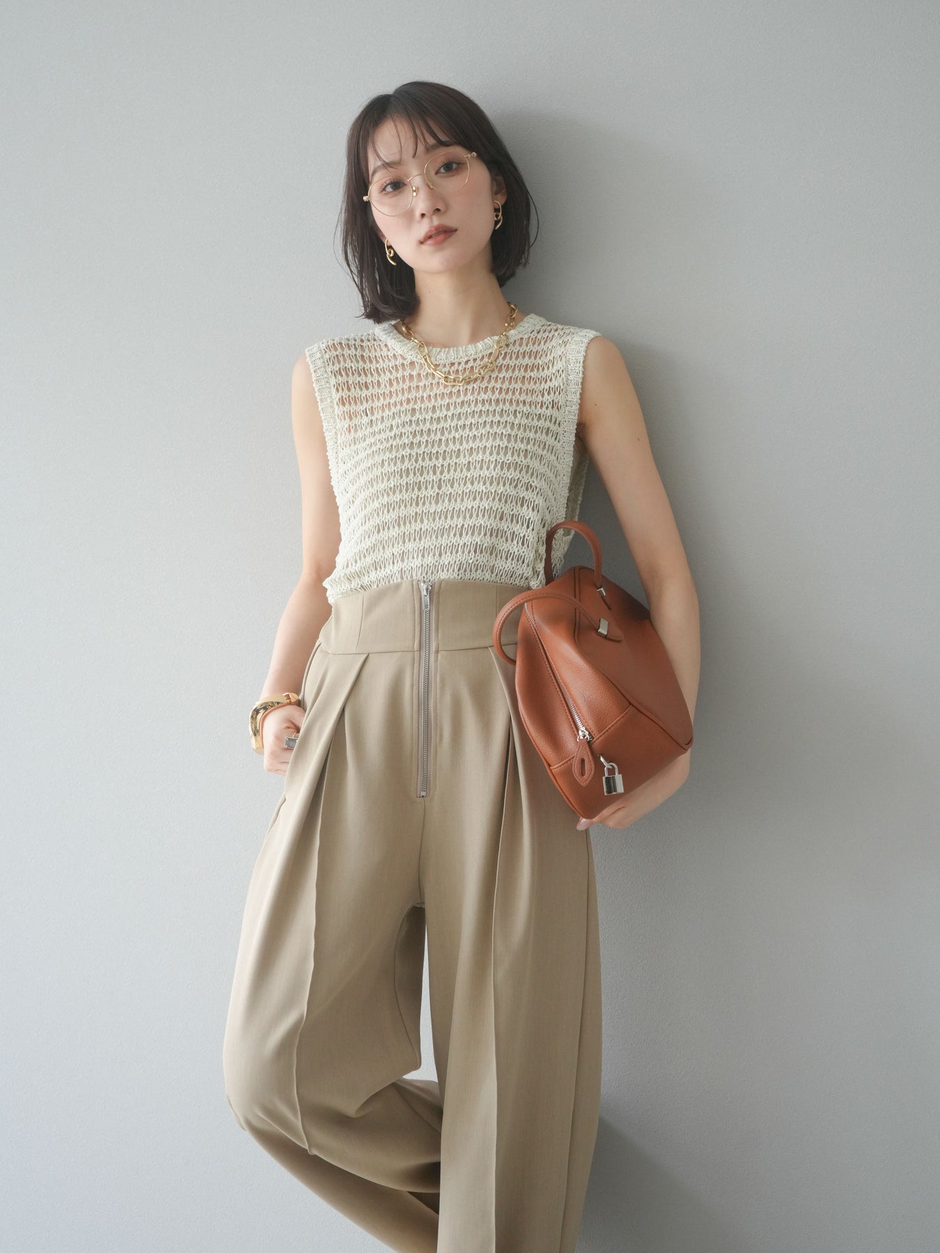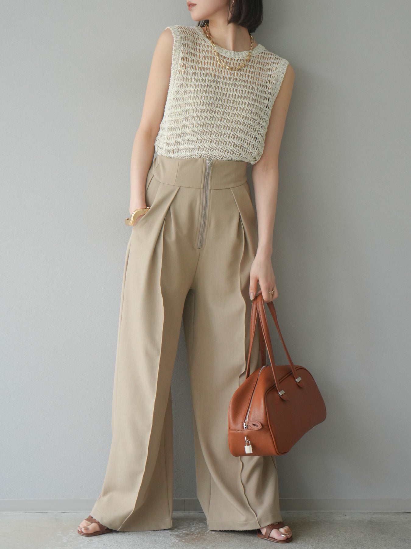 表情豊かなミックスヤーンで編み上げた、透かし編みデザインのニットタンクトップ。ざっくりとした編み地とナチュラルな透け感が、シーズンムードを高める一着です。コンパクトな丈感でバランスが取りやすく、ワイドパンツやスカートとも好相性。インナーとのレイヤードを楽しめるデザインで、カジュアルにもフェミニンにもスタイリングが可能です。春夏の着こなしに抜け感をプラスしてくれる、涼しげなサマーニットです。 ※ボトムス、キャミソール(インナー)以外の商品は一律でインナーは付属していません。