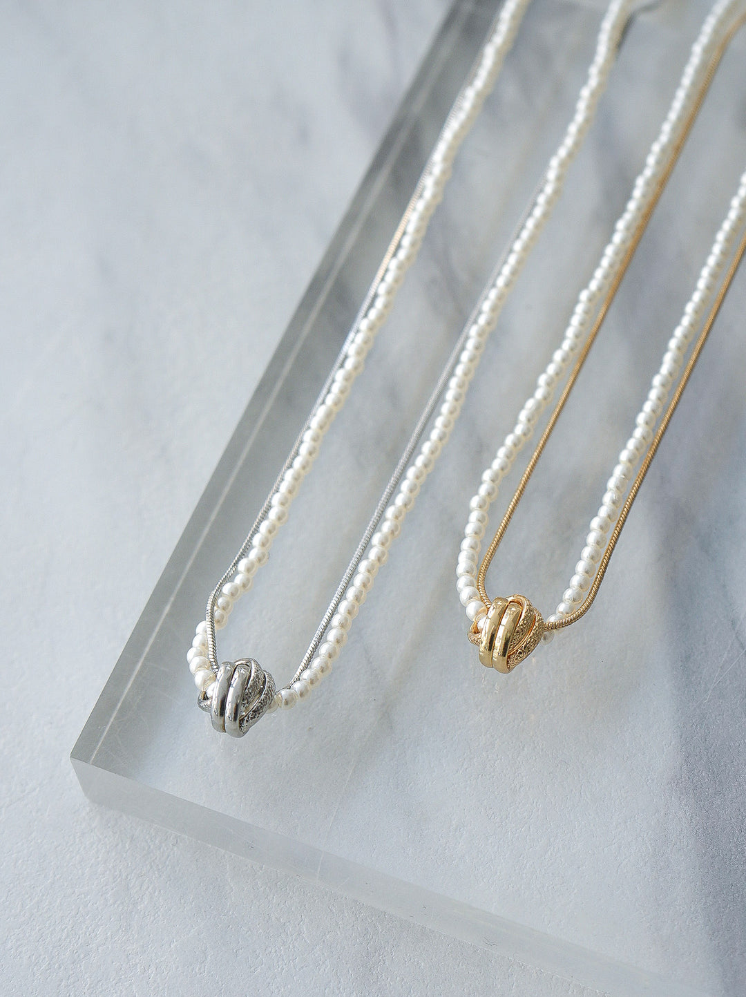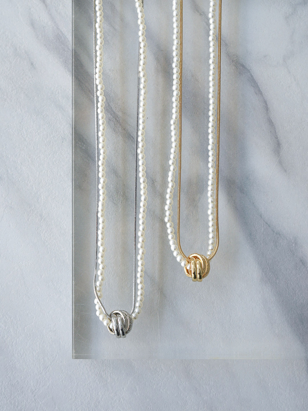 トレンド感のあるパールとチェーンを組み合わせたネックレス。繊細なパールの上品さと、華奢なチェーンのシンプルな輝きが絶妙にマッチ。リングモチーフがアクセントとなり、スタイリングに洗練された印象をプラス。2連デザインで程よいボリューム感があり、カジュアルからドレスアップまで幅広く活躍。