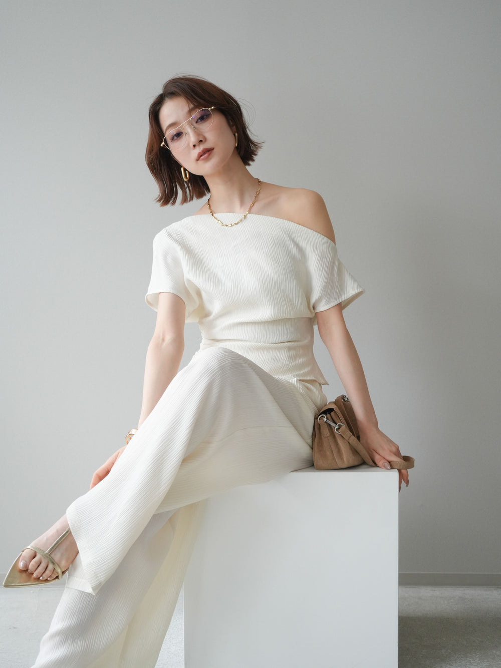 ヴィンテージライクなブロックレースを使用したワイドパンツ。ウエスト部分にタックが施されているためお腹まわりがスッキリと見え、バックゴムで穿き心地も快適です。ワイドレッグながらも素材によって膨張せず、裏地付きなので安心感があるのがポイント。コーディネートに清涼感をプラスことができ、同素材のワンピースとのレイヤードスタイルも素敵に決まります。