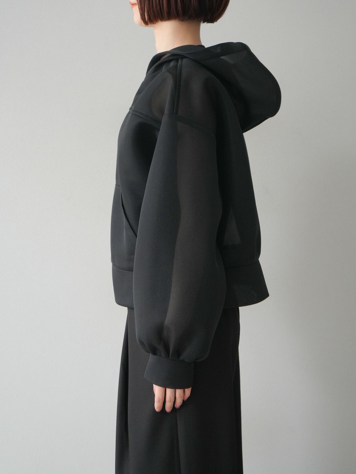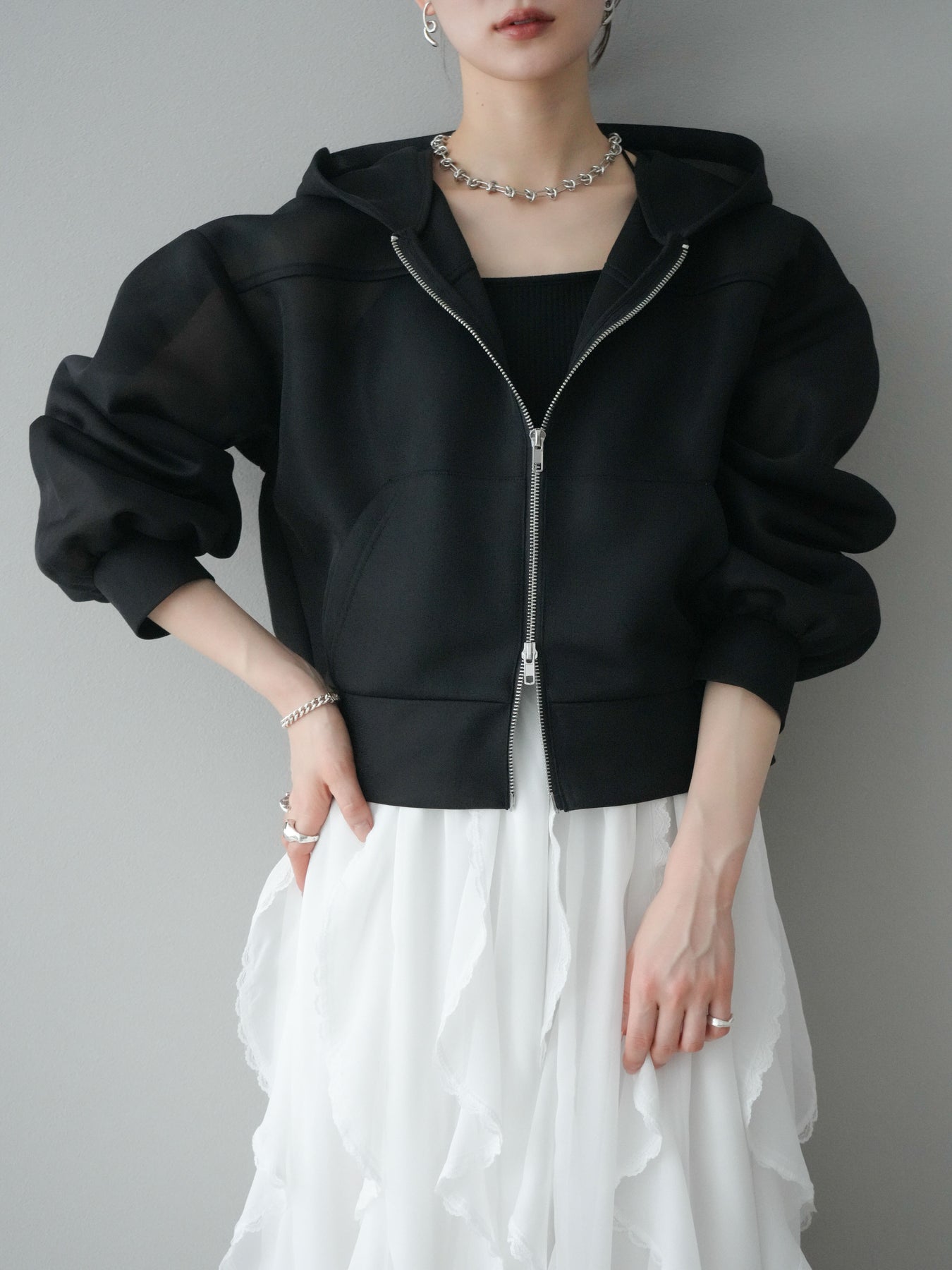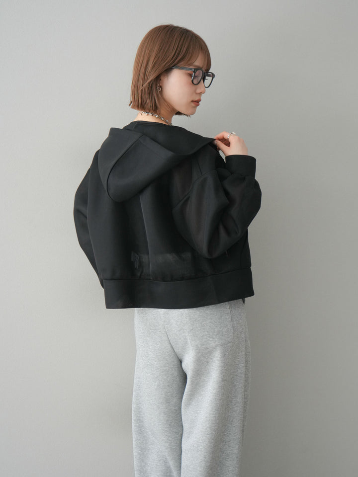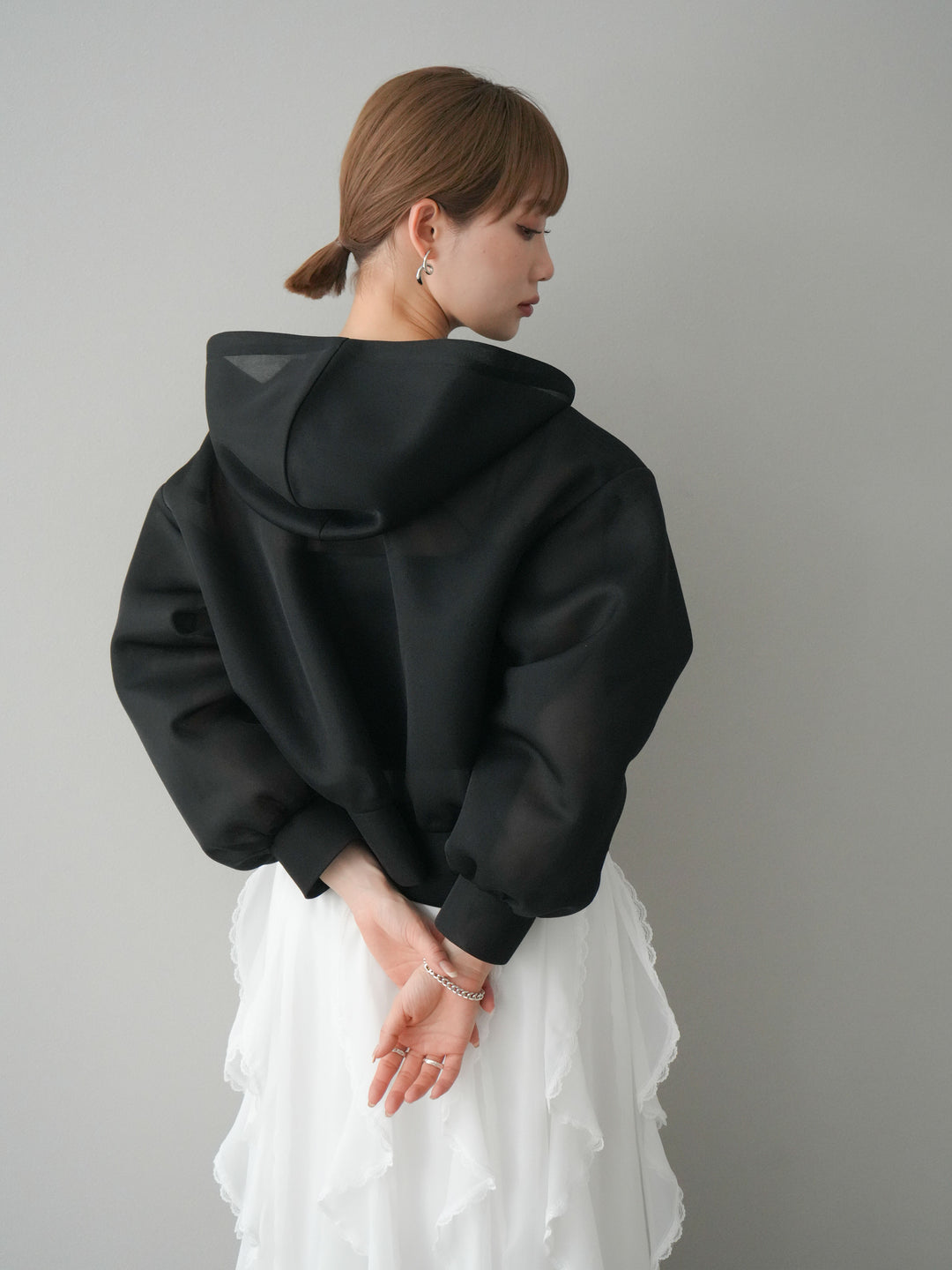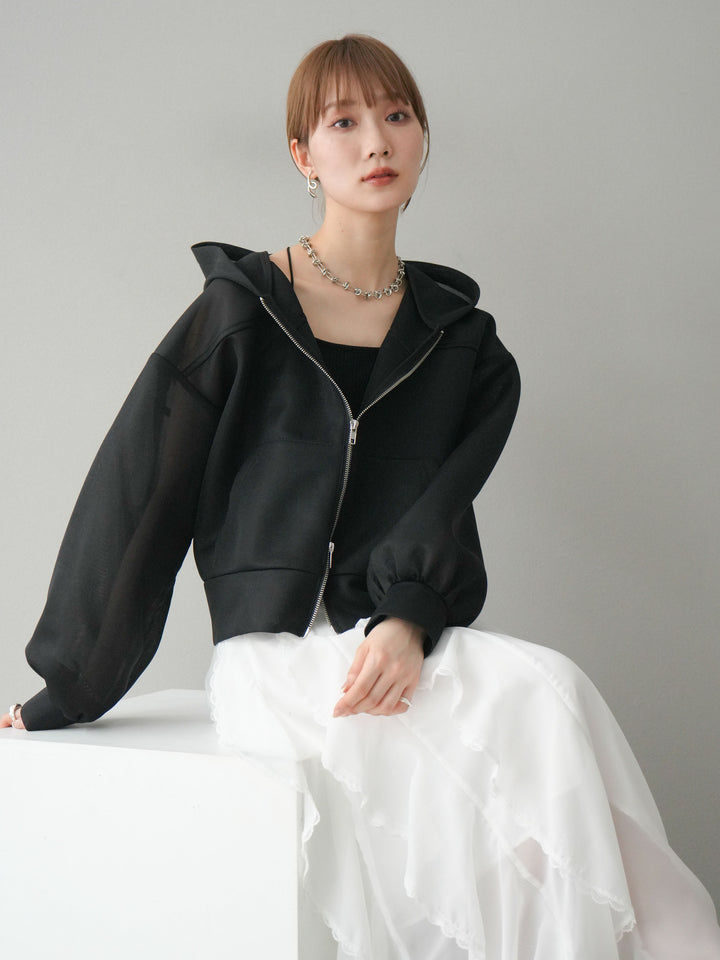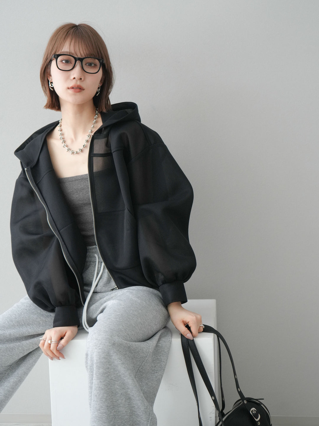 トレンドのシアー素材を取り入れたダンボールフーディー。軽やかな透け感がありながら、程よいハリ感でシルエットを美しくキープします。ボリュームスリーブとショート丈のデザインがバランスよく、カジュアルながらも洗練された印象に。羽織るだけでこなれたスタイリングが完成する、季節の変わり目にぴったりの一枚です。 ※ボトムス、キャミソール(インナー)以外の商品は一律でインナーは付属していません