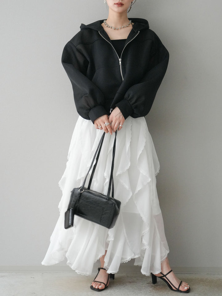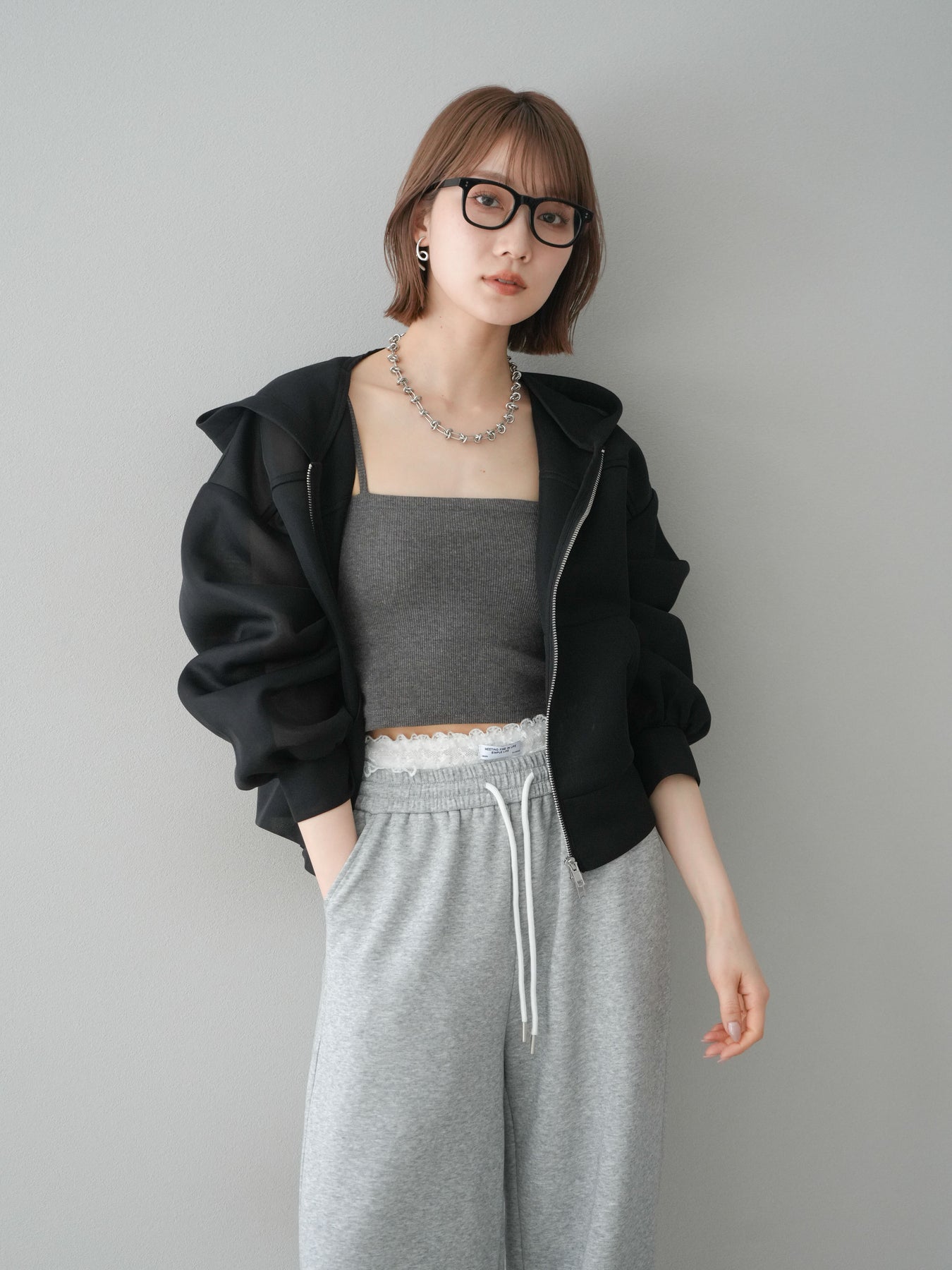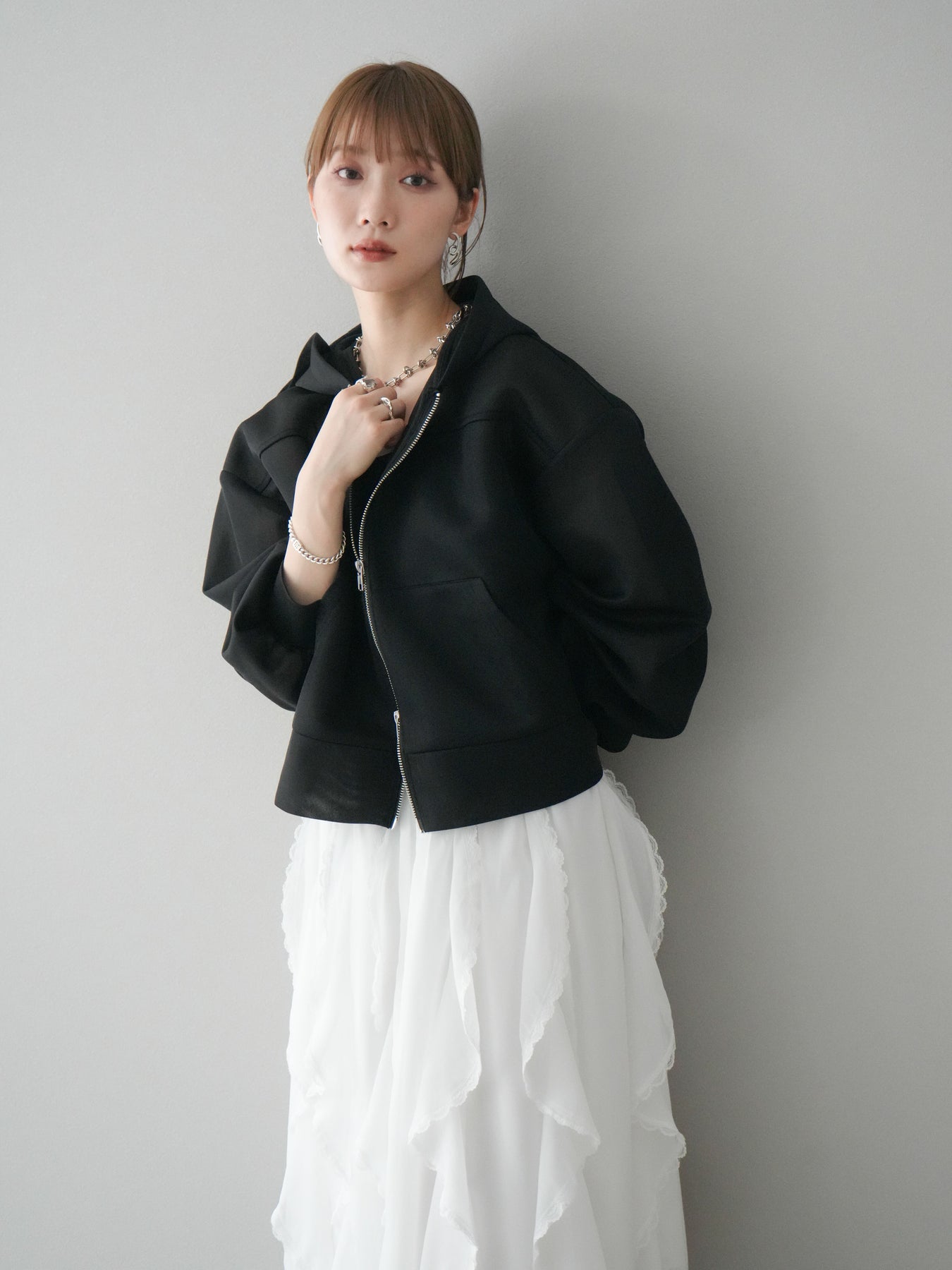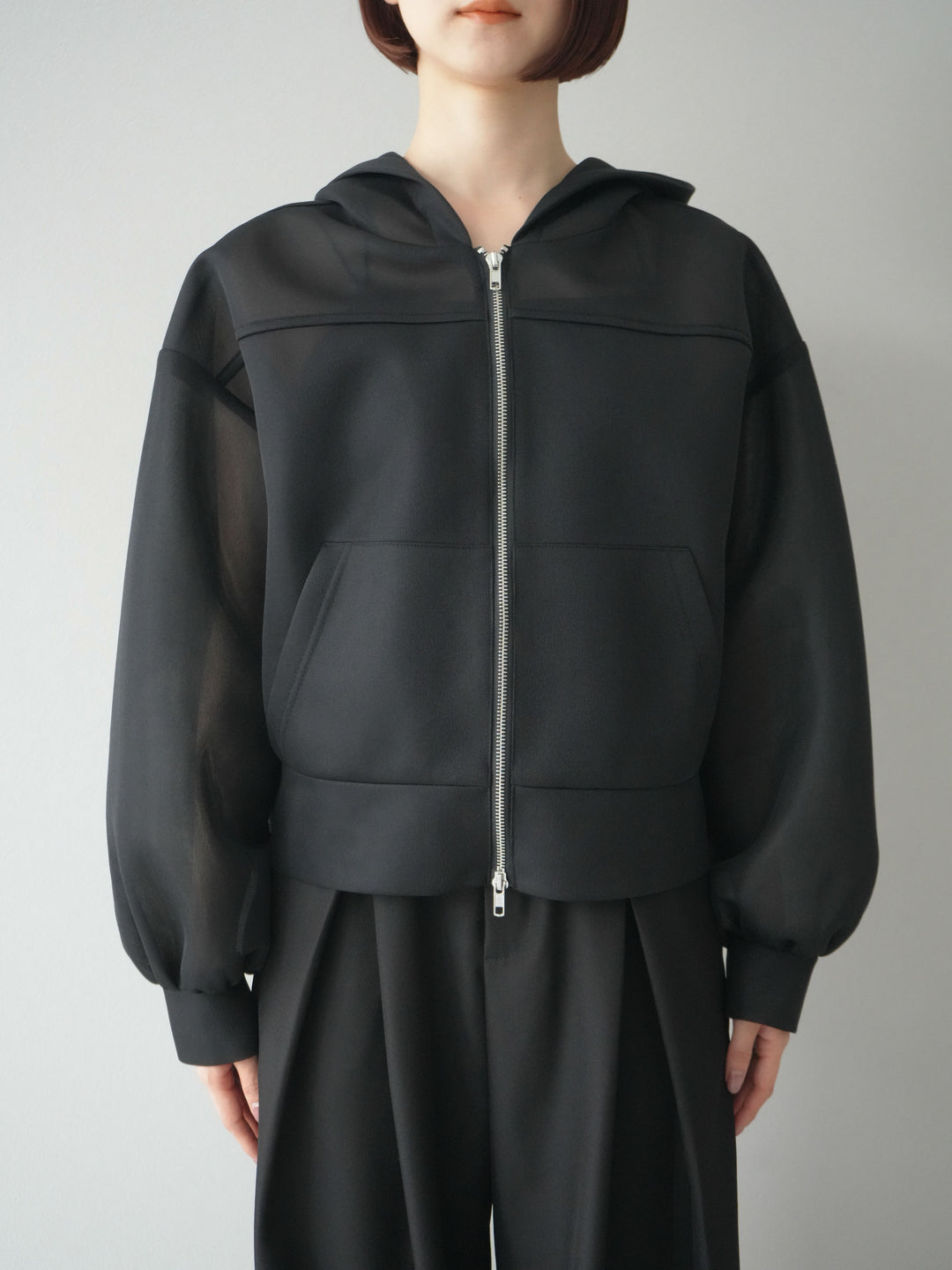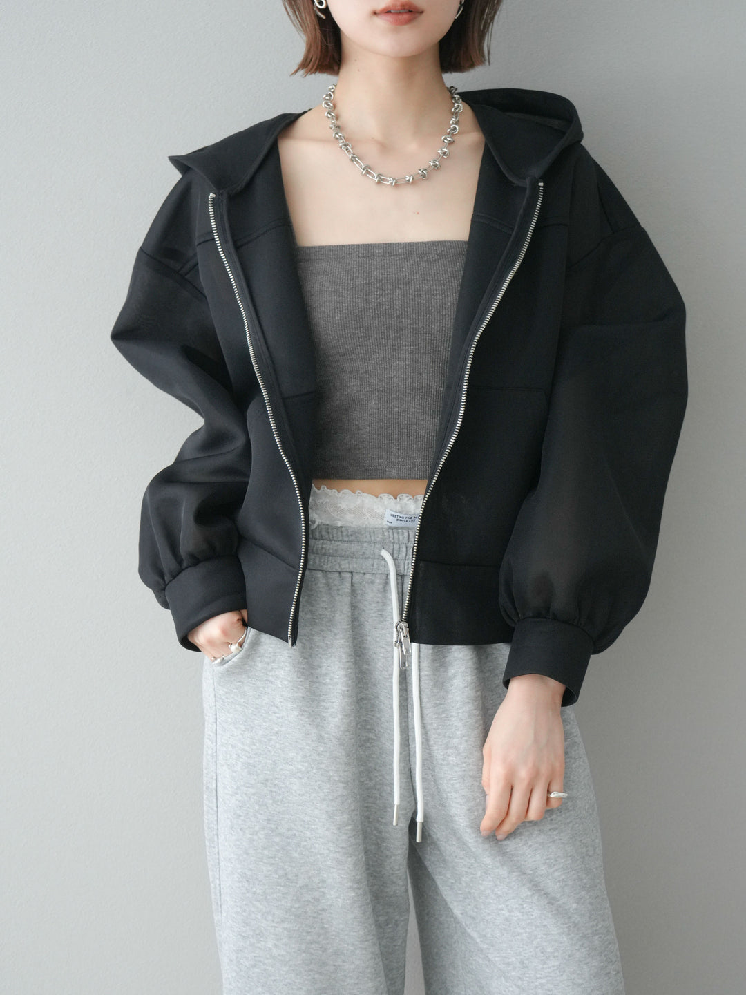 トレンドのシアー素材を取り入れたダンボールフーディー。軽やかな透け感がありながら、程よいハリ感でシルエットを美しくキープします。ボリュームスリーブとショート丈のデザインがバランスよく、カジュアルながらも洗練された印象に。羽織るだけでこなれたスタイリングが完成する、季節の変わり目にぴったりの一枚です。 ※ボトムス、キャミソール(インナー)以外の商品は一律でインナーは付属していません