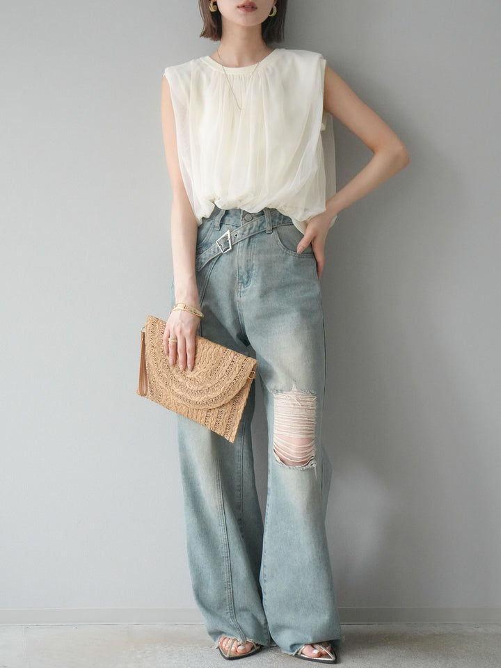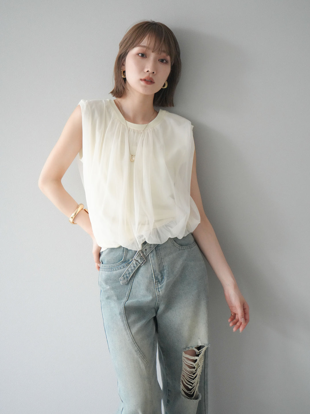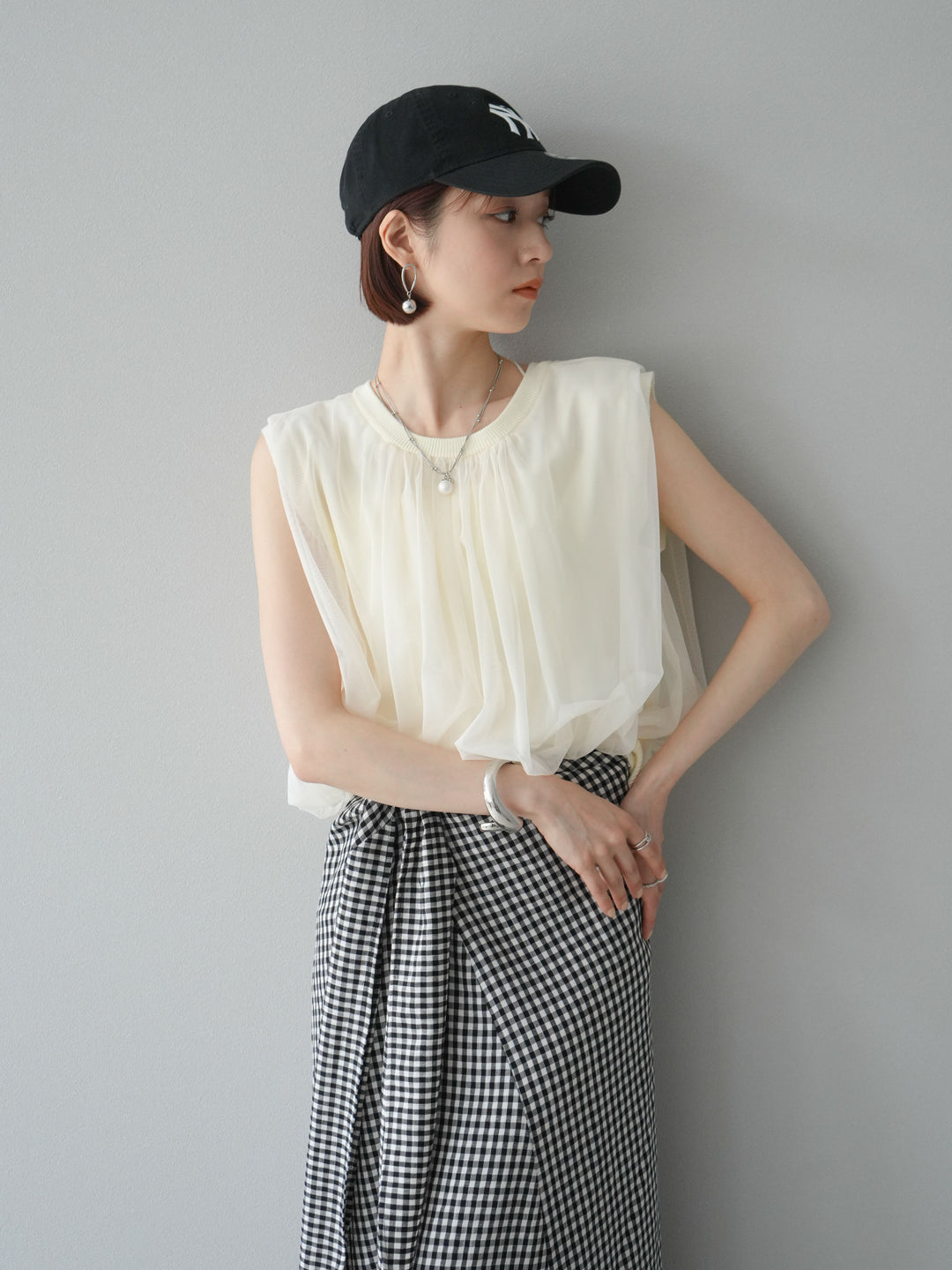 チュールの繊細さとカットソーのカジュアル感が絶妙にミックスされた、2WAY仕様のドッキングベスト。前後で着用できるデザインで、スタイリングの幅が広がります。たっぷりとギャザーを寄せたチュールが、立体感と軽やかさをプラス。トレンドライクなレイヤードスタイルが楽しめる、春夏にぴったりの一枚です。 ※ボトムス、キャミソール(インナー)以外の商品は一律でインナーは付属していません