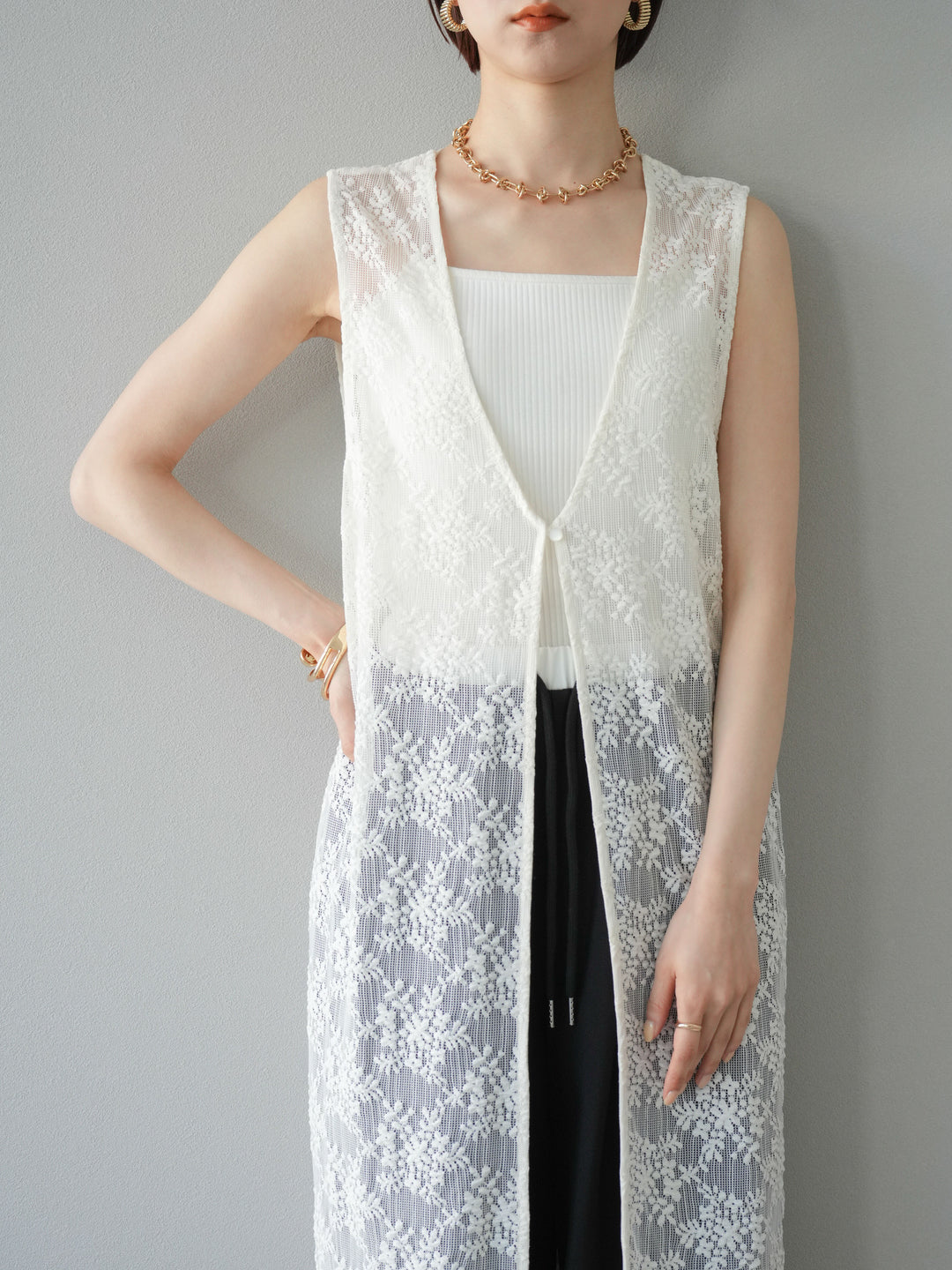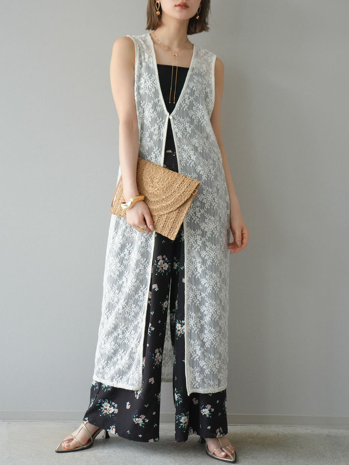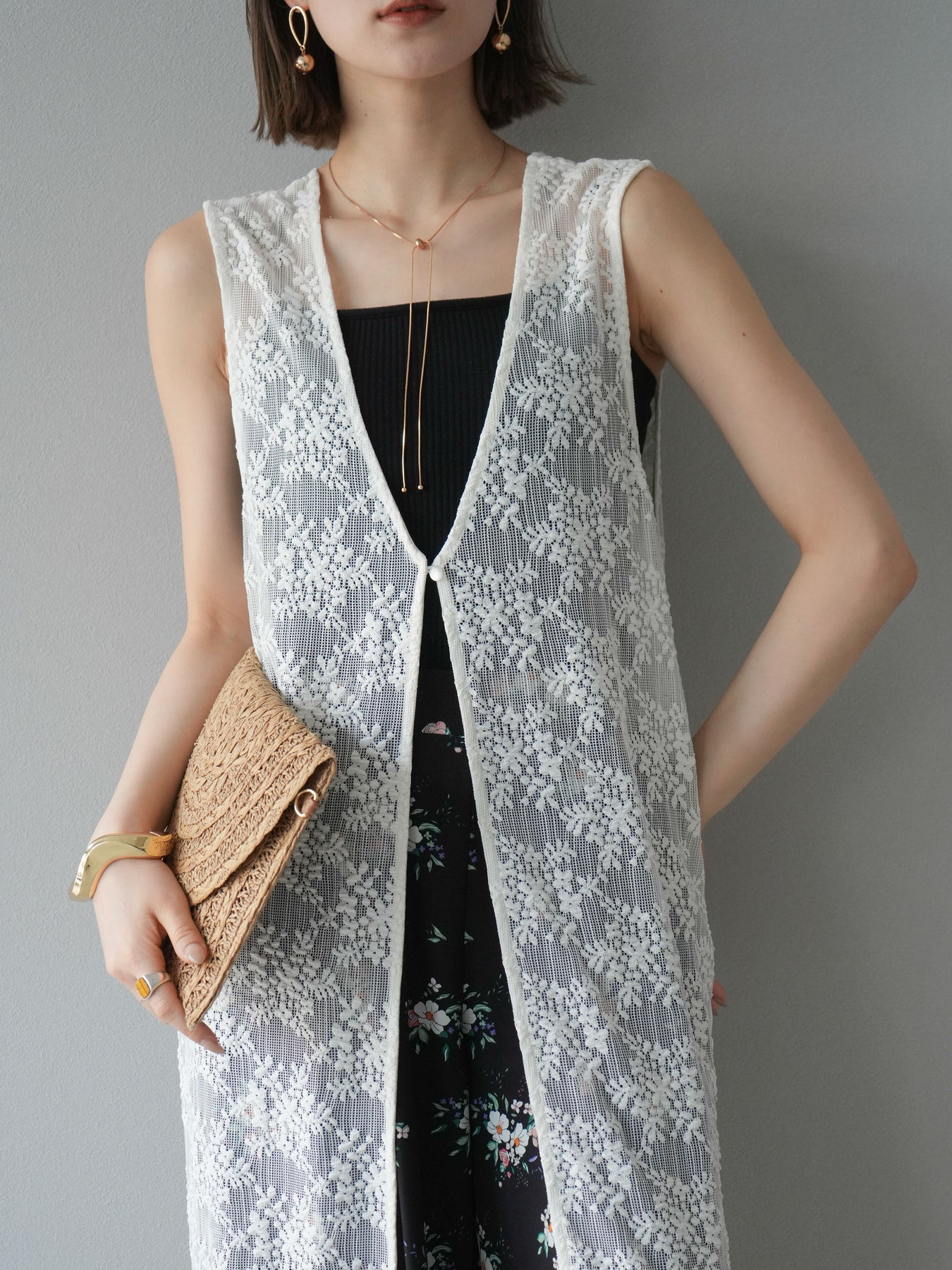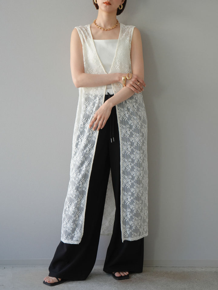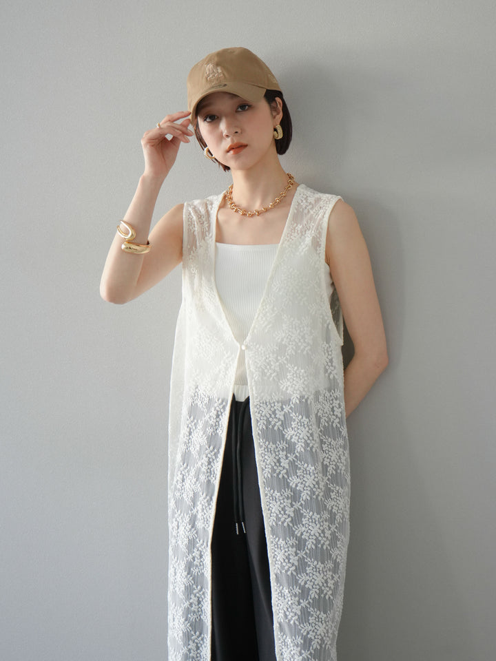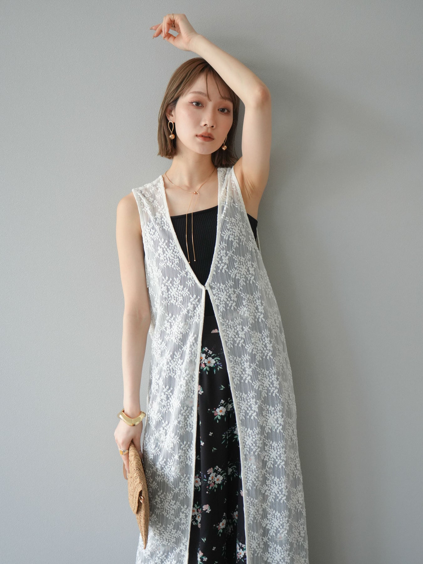 繊細なフラワーレースが目を惹くロングジレ。程よい透け感がスタイリングに抜け感を加え、レイヤードコーデを上品に演出。ノースリーブデザインと軽やかな素材感で、春夏の羽織りとしても重宝します。カジュアルからきれいめまで、幅広いコーデにマッチするトレンドアイテムです。 ※ボトムス、キャミソール(インナー)以外の商品は一律でインナーは付属していません