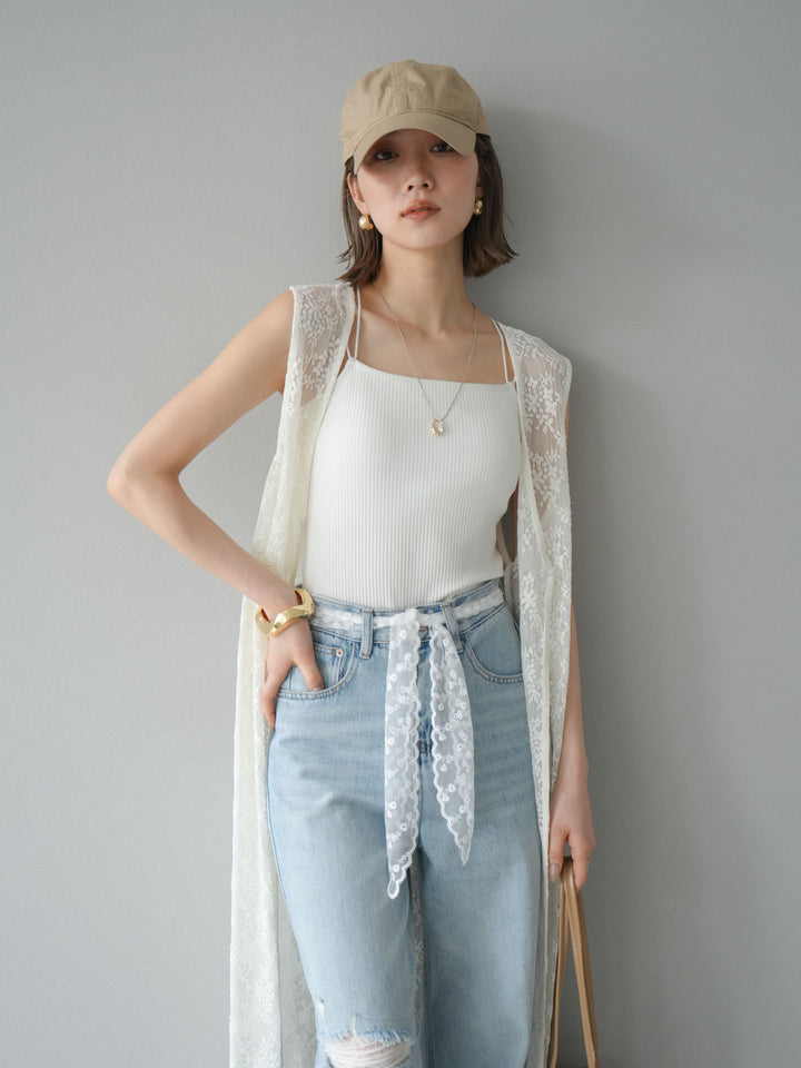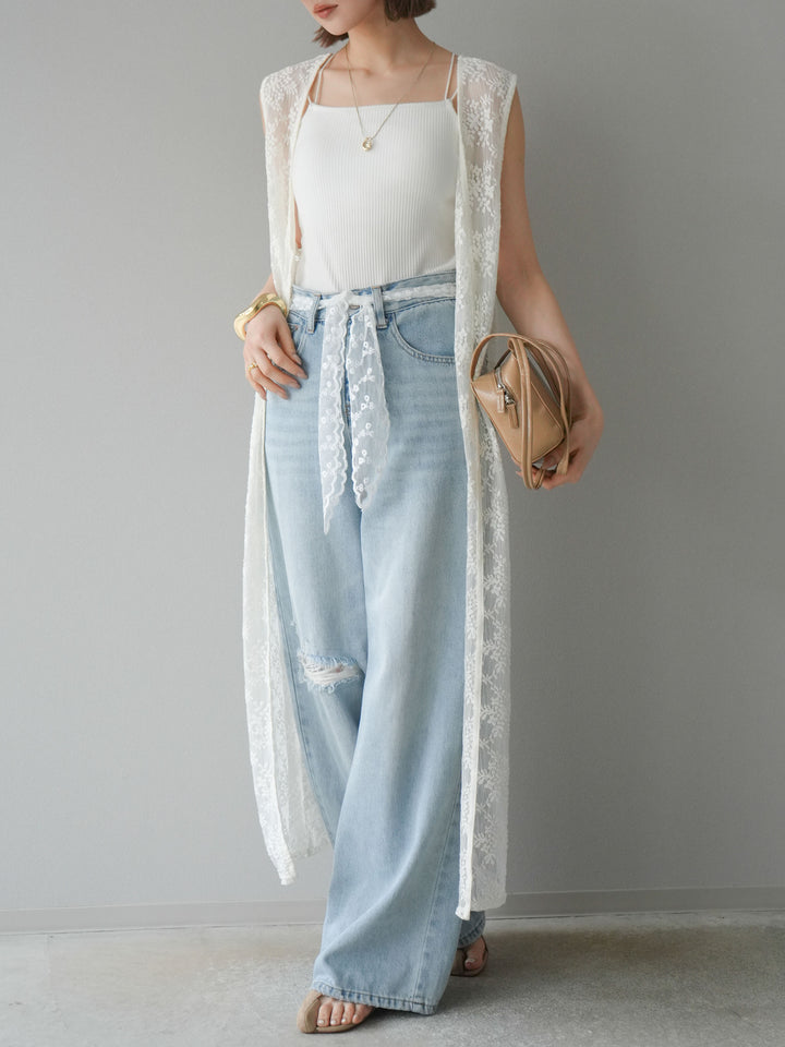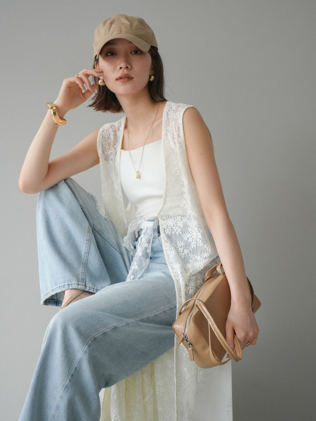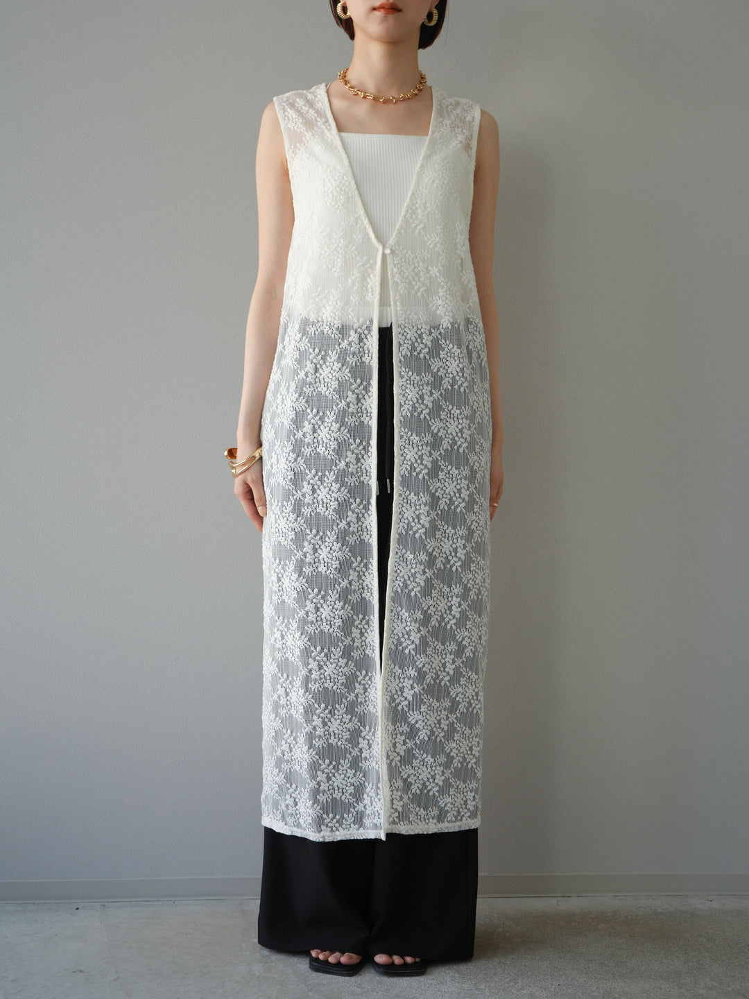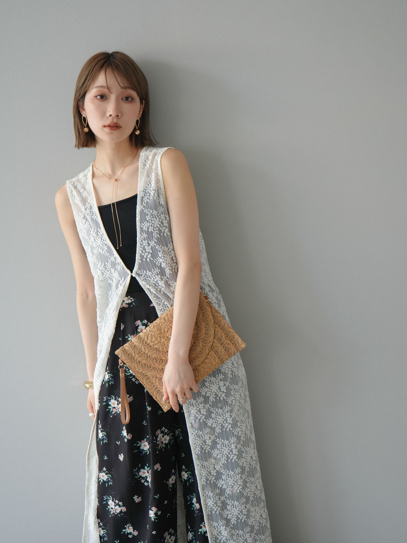 繊細なフラワーレースが目を惹くロングジレ。程よい透け感がスタイリングに抜け感を加え、レイヤードコーデを上品に演出。ノースリーブデザインと軽やかな素材感で、春夏の羽織りとしても重宝します。カジュアルからきれいめまで、幅広いコーデにマッチするトレンドアイテムです。 ※ボトムス、キャミソール(インナー)以外の商品は一律でインナーは付属していません