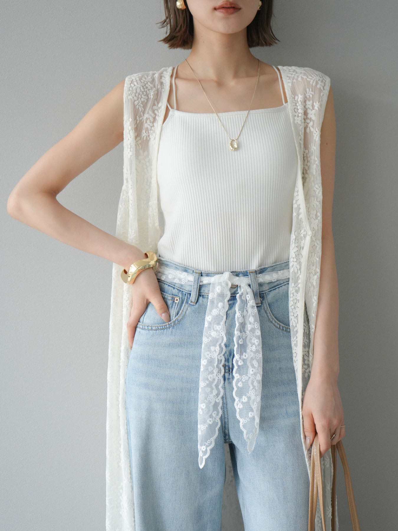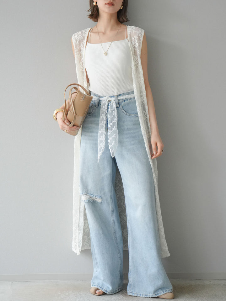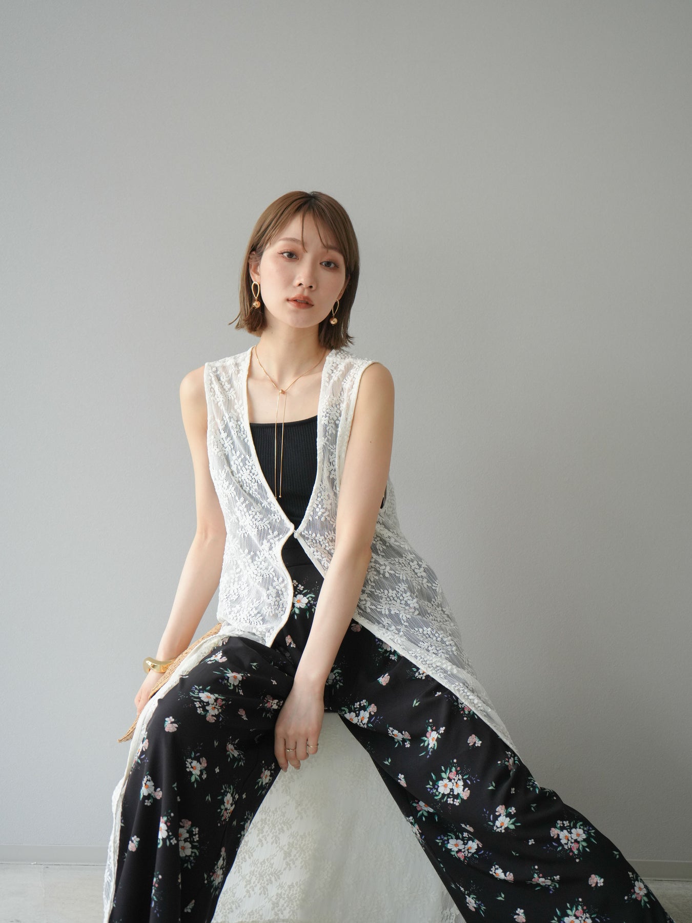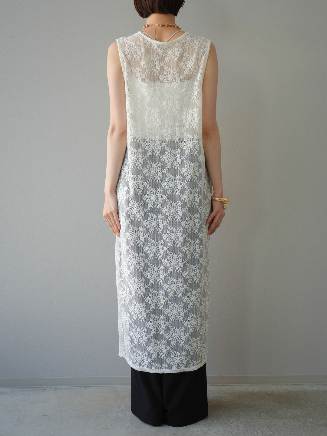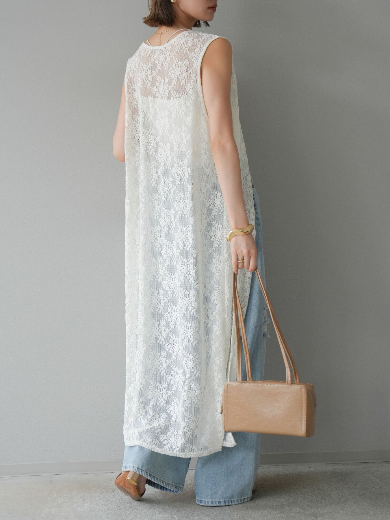 繊細なフラワーレースが目を惹くロングジレ。程よい透け感がスタイリングに抜け感を加え、レイヤードコーデを上品に演出。ノースリーブデザインと軽やかな素材感で、春夏の羽織りとしても重宝します。カジュアルからきれいめまで、幅広いコーデにマッチするトレンドアイテムです。 ※ボトムス、キャミソール(インナー)以外の商品は一律でインナーは付属していません