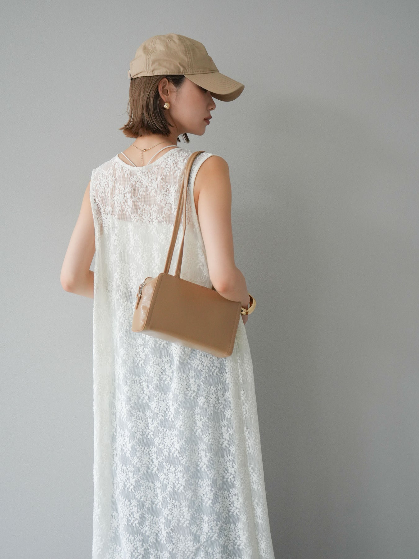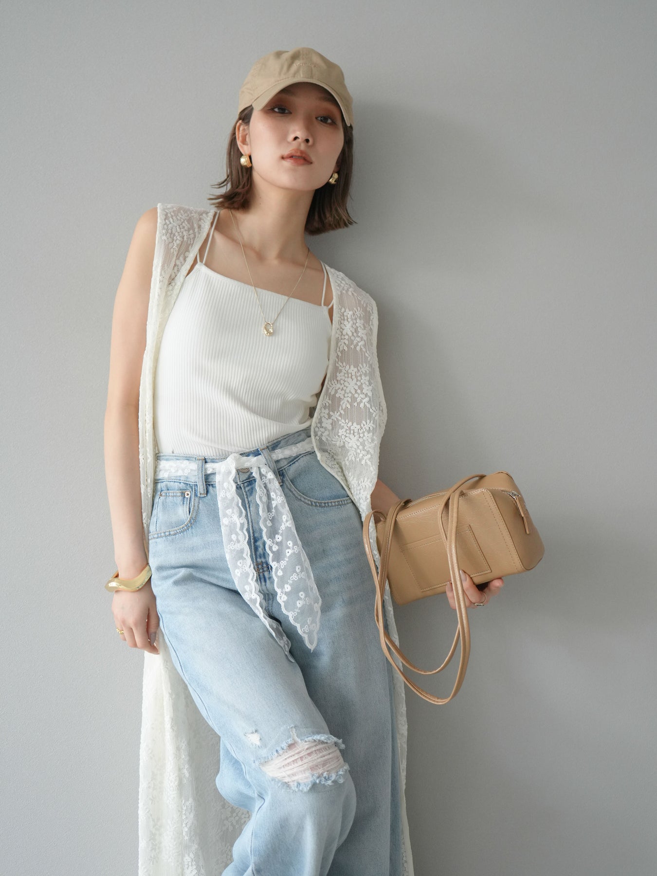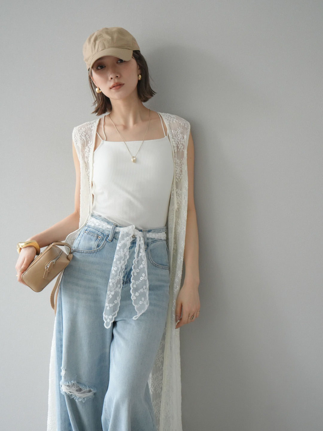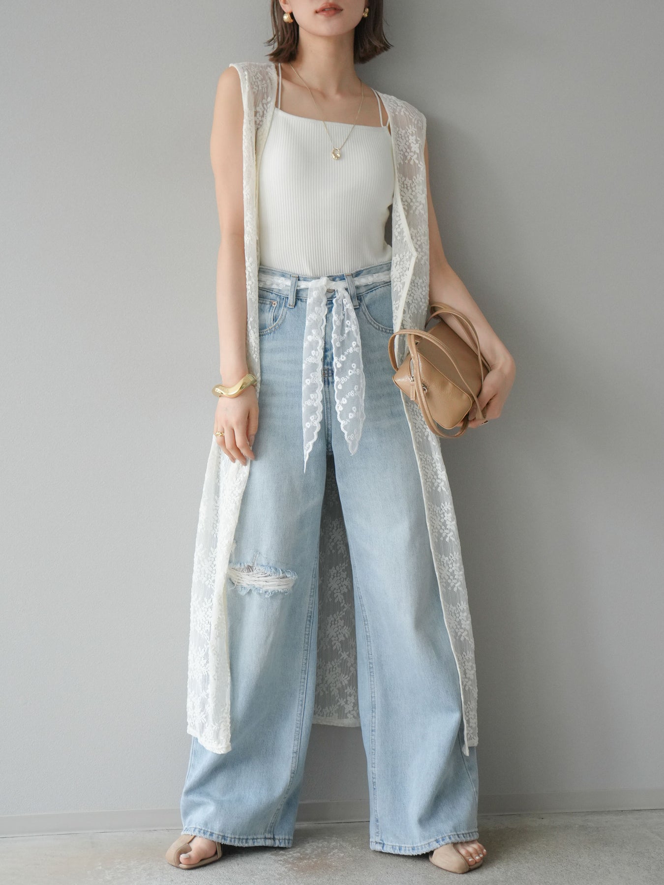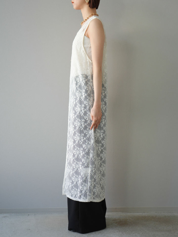 繊細なフラワーレースが目を惹くロングジレ。程よい透け感がスタイリングに抜け感を加え、レイヤードコーデを上品に演出。ノースリーブデザインと軽やかな素材感で、春夏の羽織りとしても重宝します。カジュアルからきれいめまで、幅広いコーデにマッチするトレンドアイテムです。 ※ボトムス、キャミソール(インナー)以外の商品は一律でインナーは付属していません