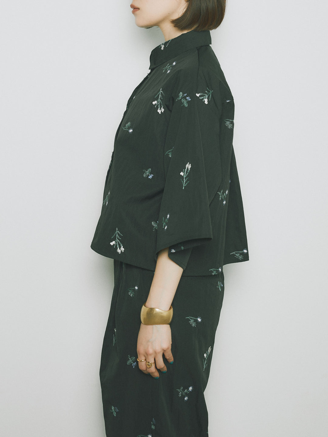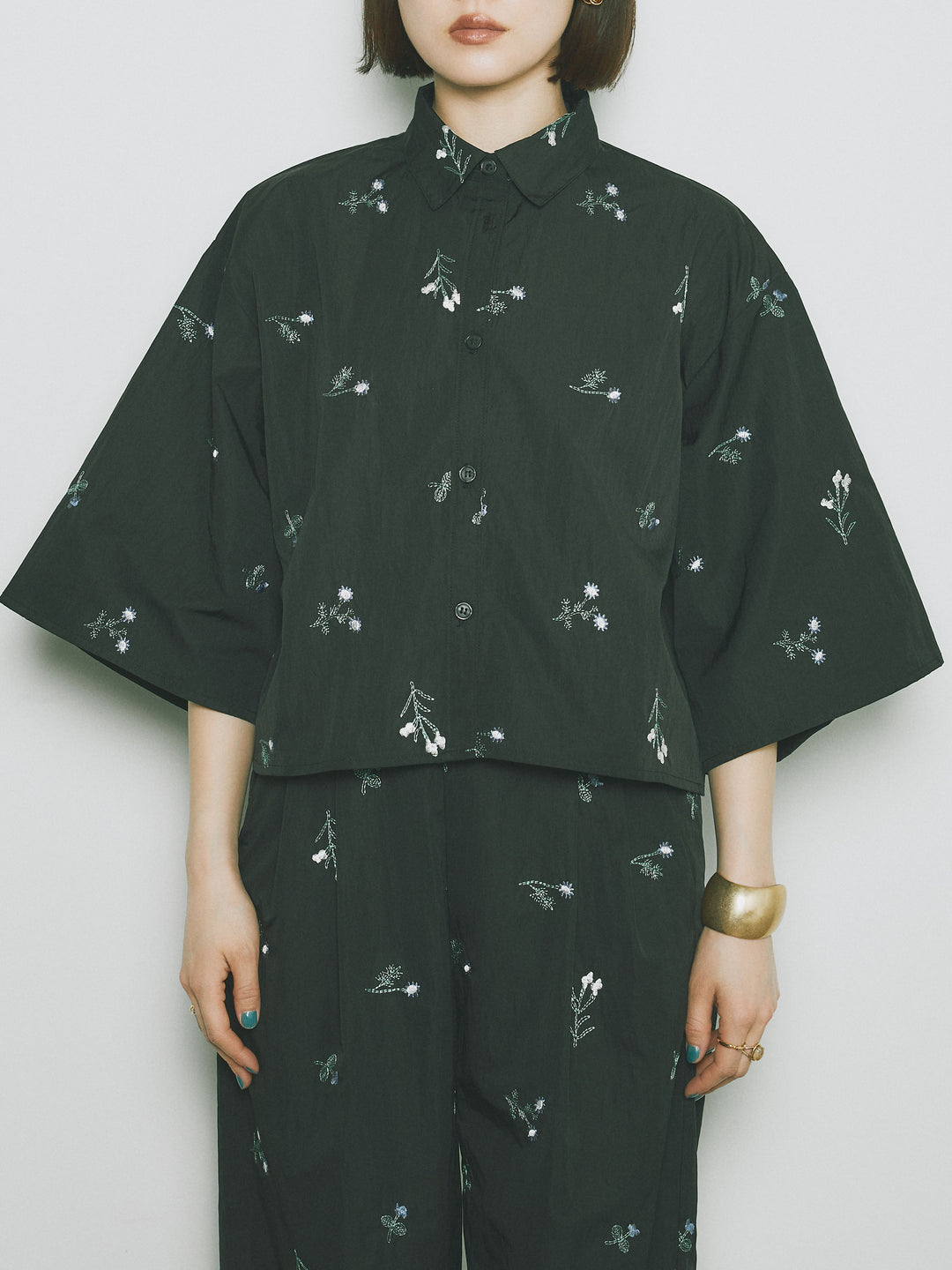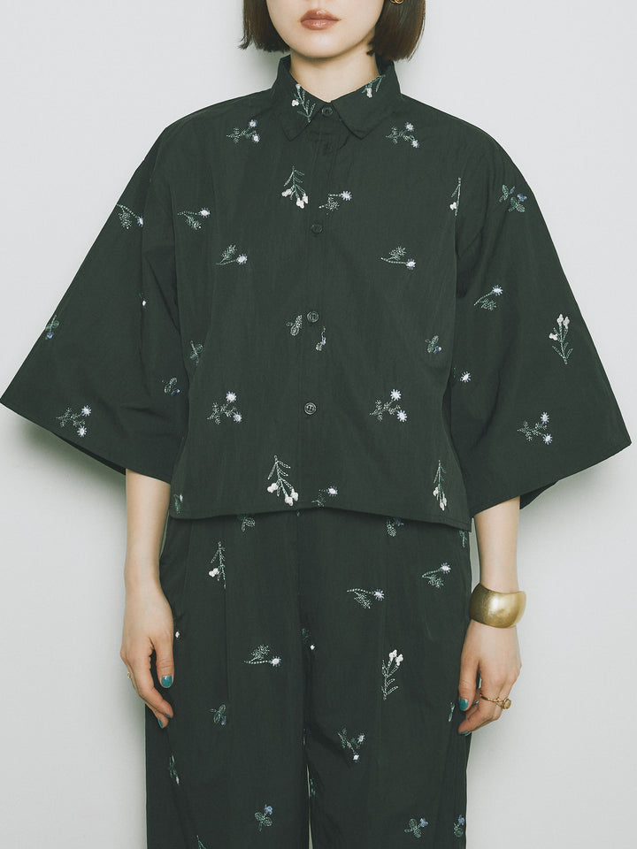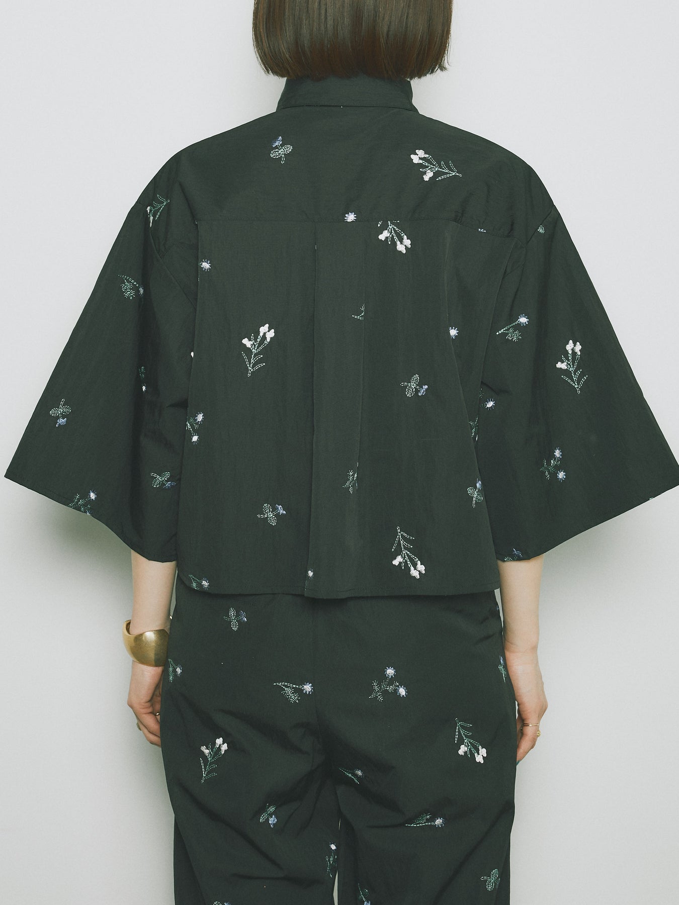 [予約]フラワー刺繍タフタハーフシャツ/ブラック