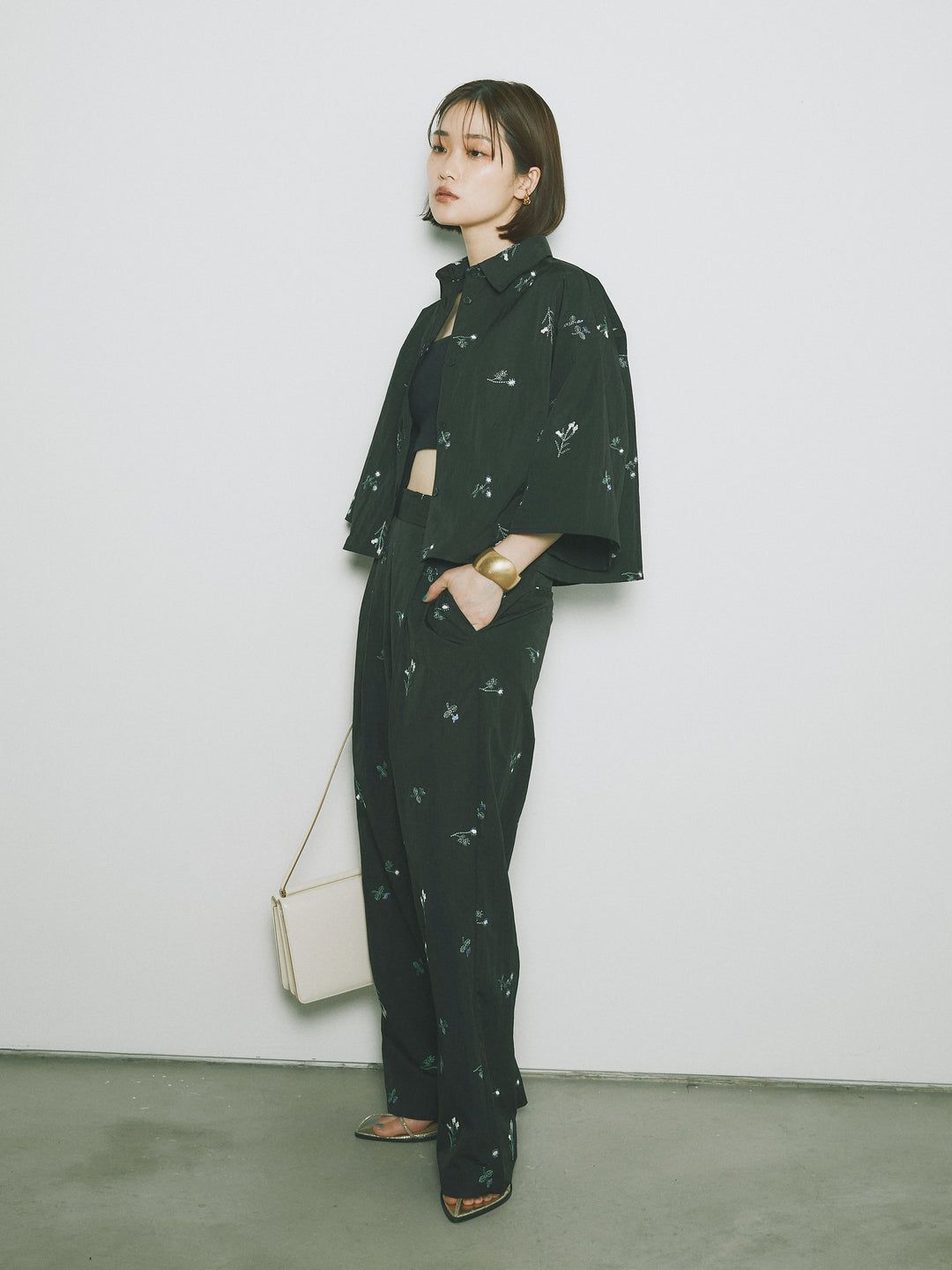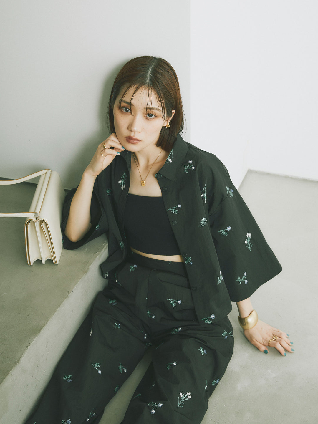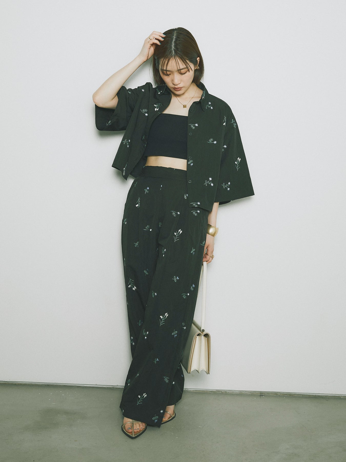 [予約]フラワー刺繍タフタハーフシャツ/ブラック