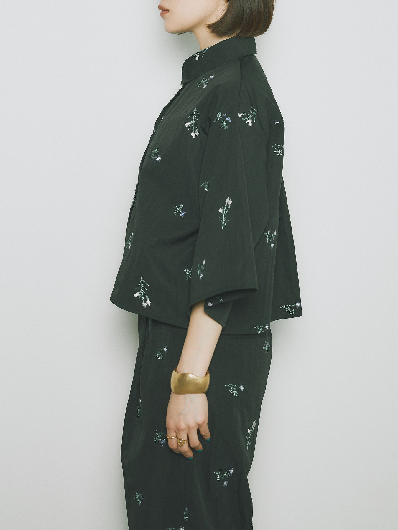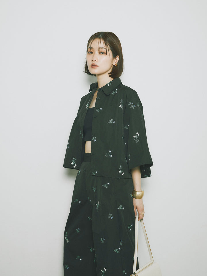 軽やかなタフタ素材に繊細なフラワー刺繍が施された、ハーフ丈のシャツ。フラワーデザインがアクセントとなり、シンプルな中にも華やかさを加えます。ゆったりとしたシルエットでリラックス感のある着心地ながら、刺繍とタフタ素材が上品な印象を演出。カジュアルなデザインの中にエレガントさを感じさせる一枚です。 ※ボトムス、キャミソール(インナー)以外の商品は一律でインナーは付属していません。