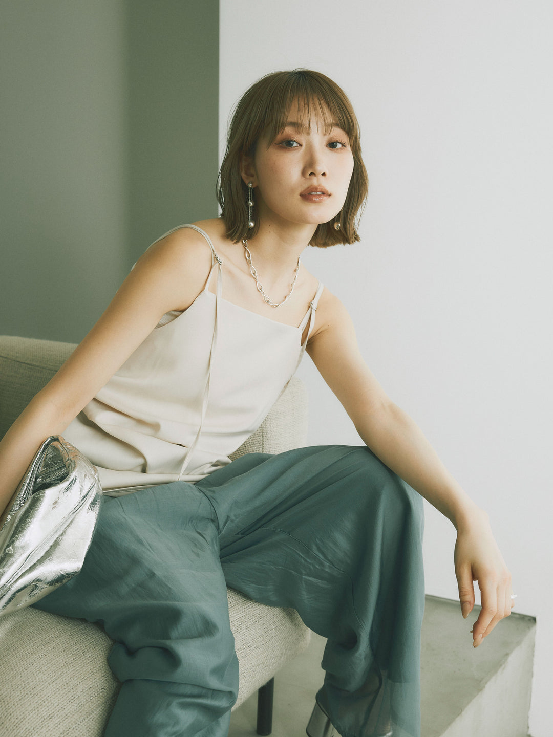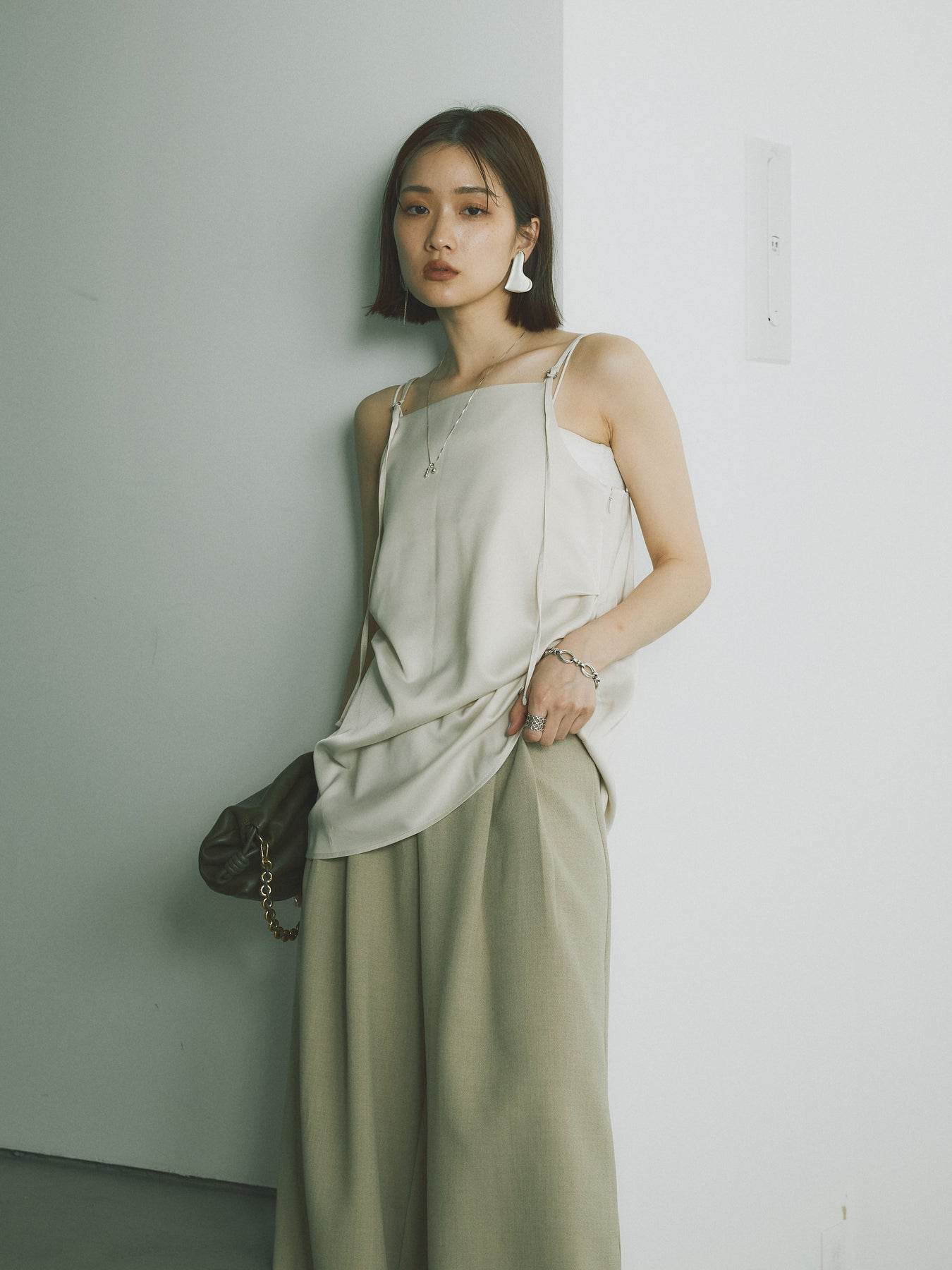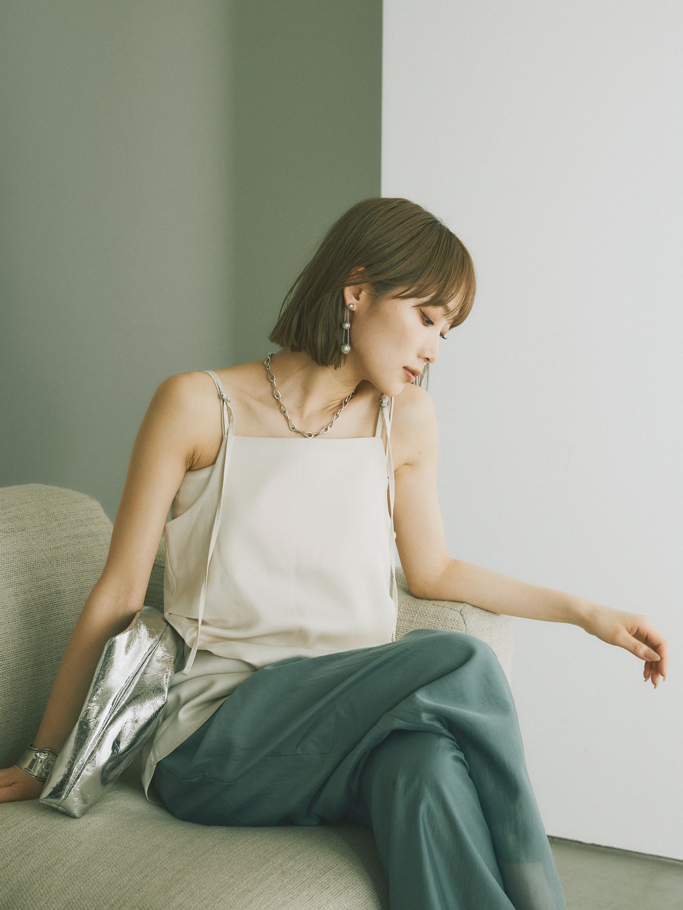 しなやかなマットサテン素材で仕立てたタックデザインのキャミソール。落ち着いた光沢感が上品さを引き立て、タックを施すことで立体的で美しいシルエットを作り出します。肩紐の調整が可能で、ぴったりとフィットしながらもリラックスした着心地を提供。シンプルながらもエレガントな印象を与え、デイリーコーディネートから特別な日まで幅広く活躍します。 ※ボトムス、キャミソール(インナー)以外の商品は一律でインナーは付属していません。