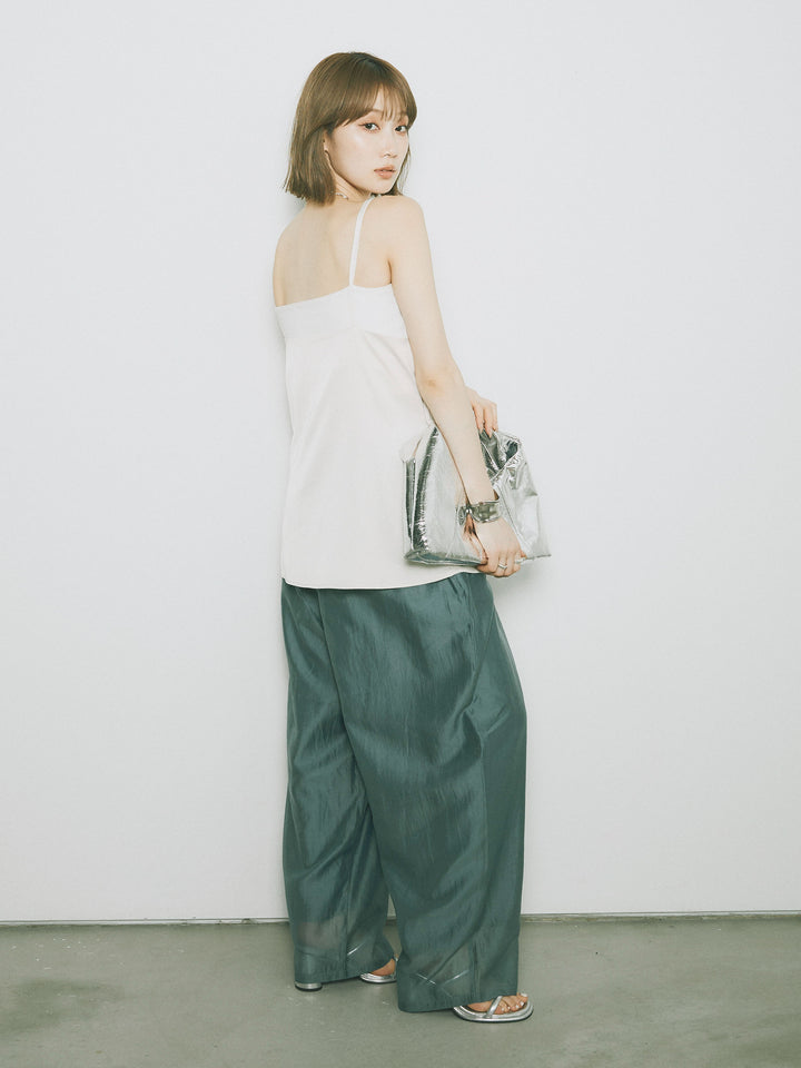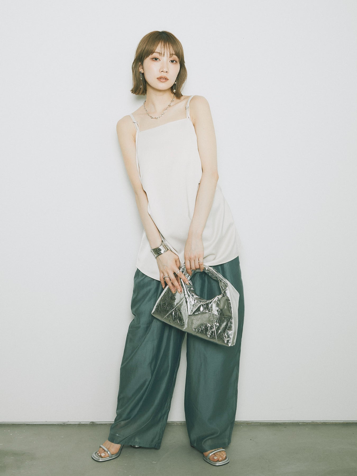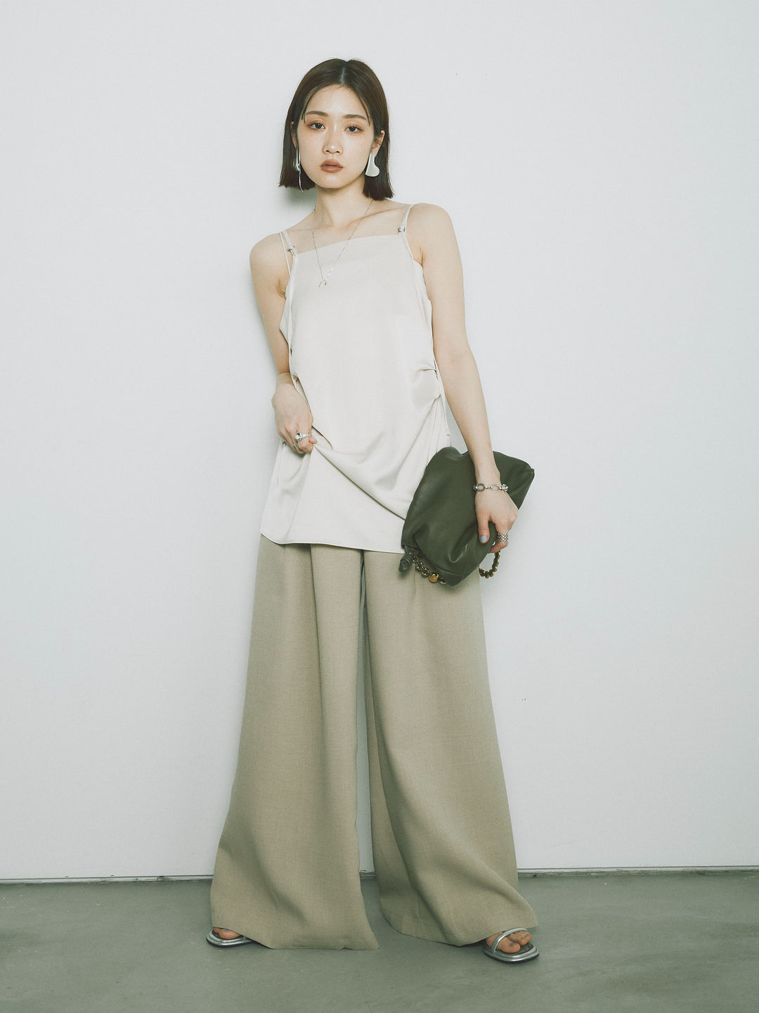しなやかなマットサテン素材で仕立てたタックデザインのキャミソール。落ち着いた光沢感が上品さを引き立て、タックを施すことで立体的で美しいシルエットを作り出します。肩紐の調整が可能で、ぴったりとフィットしながらもリラックスした着心地を提供。シンプルながらもエレガントな印象を与え、デイリーコーディネートから特別な日まで幅広く活躍します。 ※ボトムス、キャミソール(インナー)以外の商品は一律でインナーは付属していません。