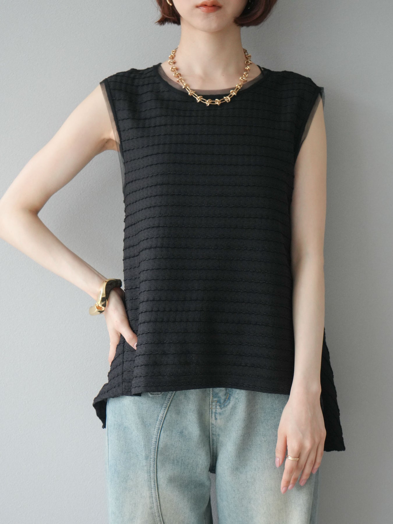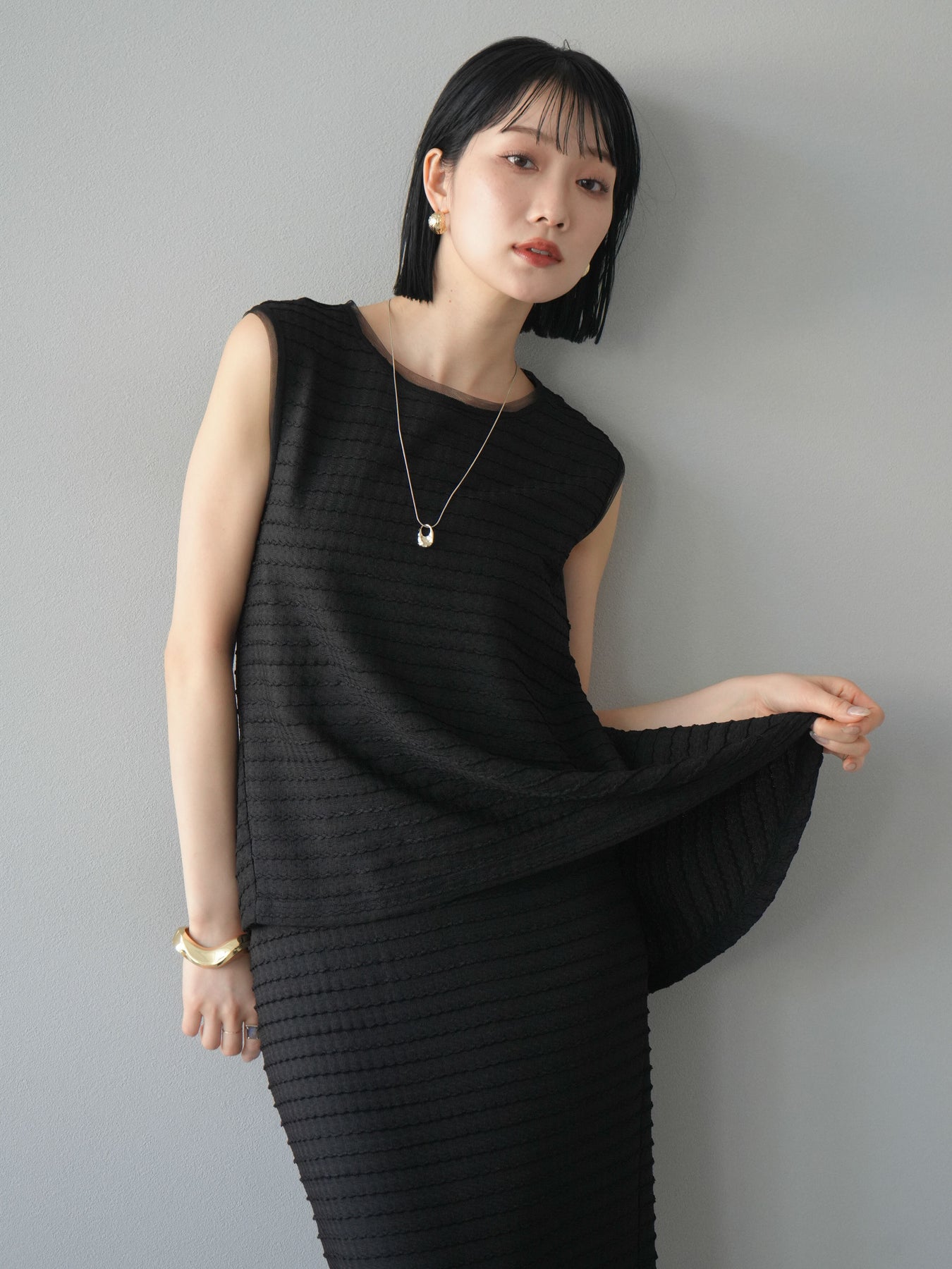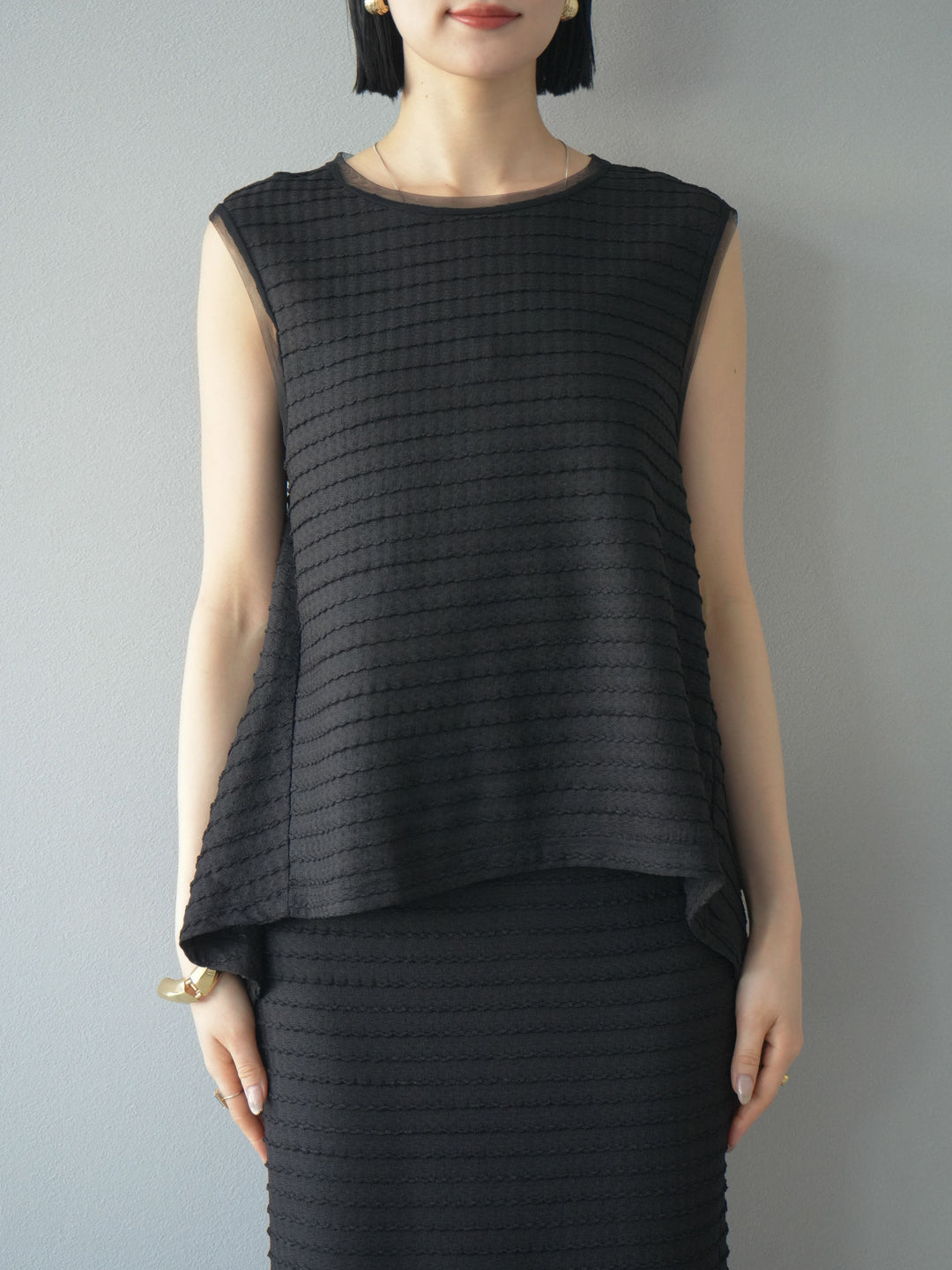 [予約]ジャガードウェーブぺプラムノースリーブ/ブラック