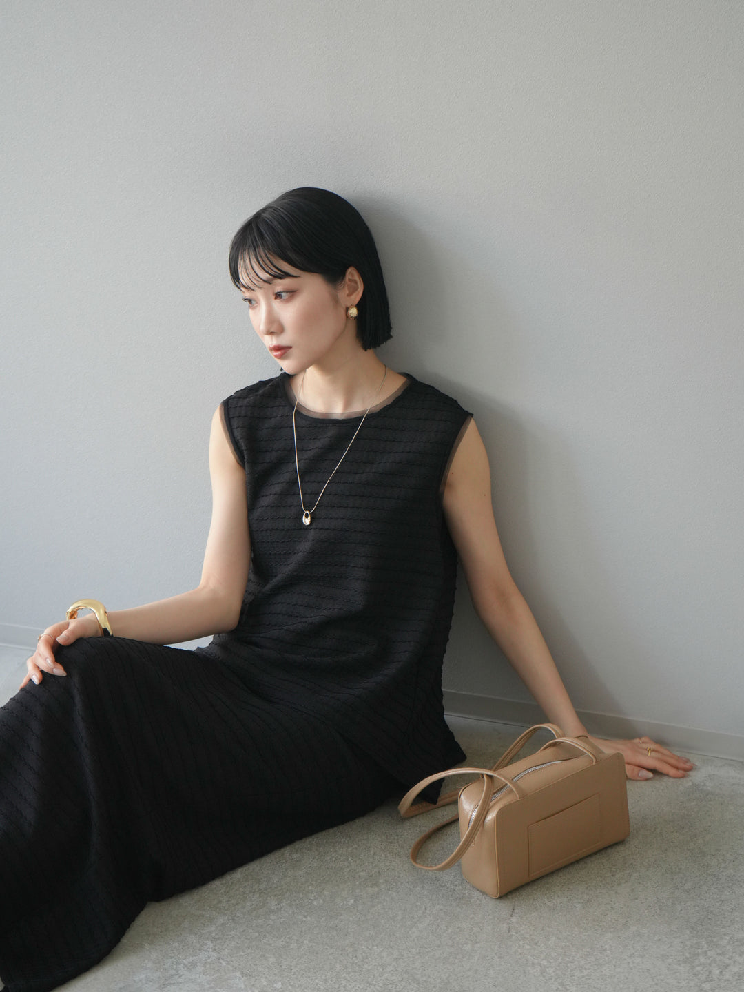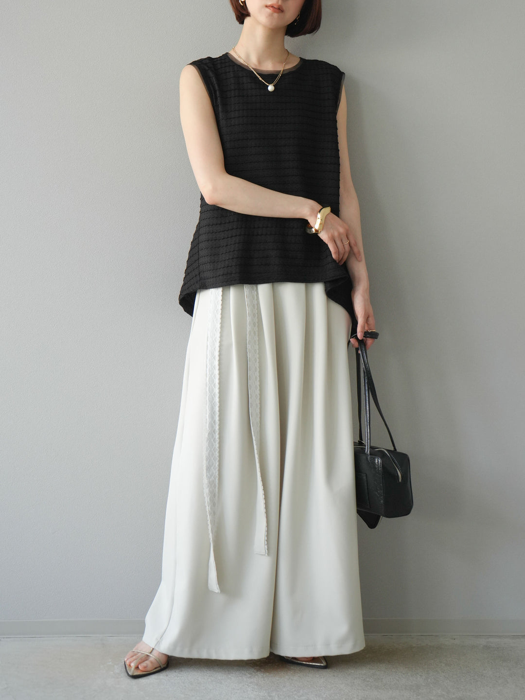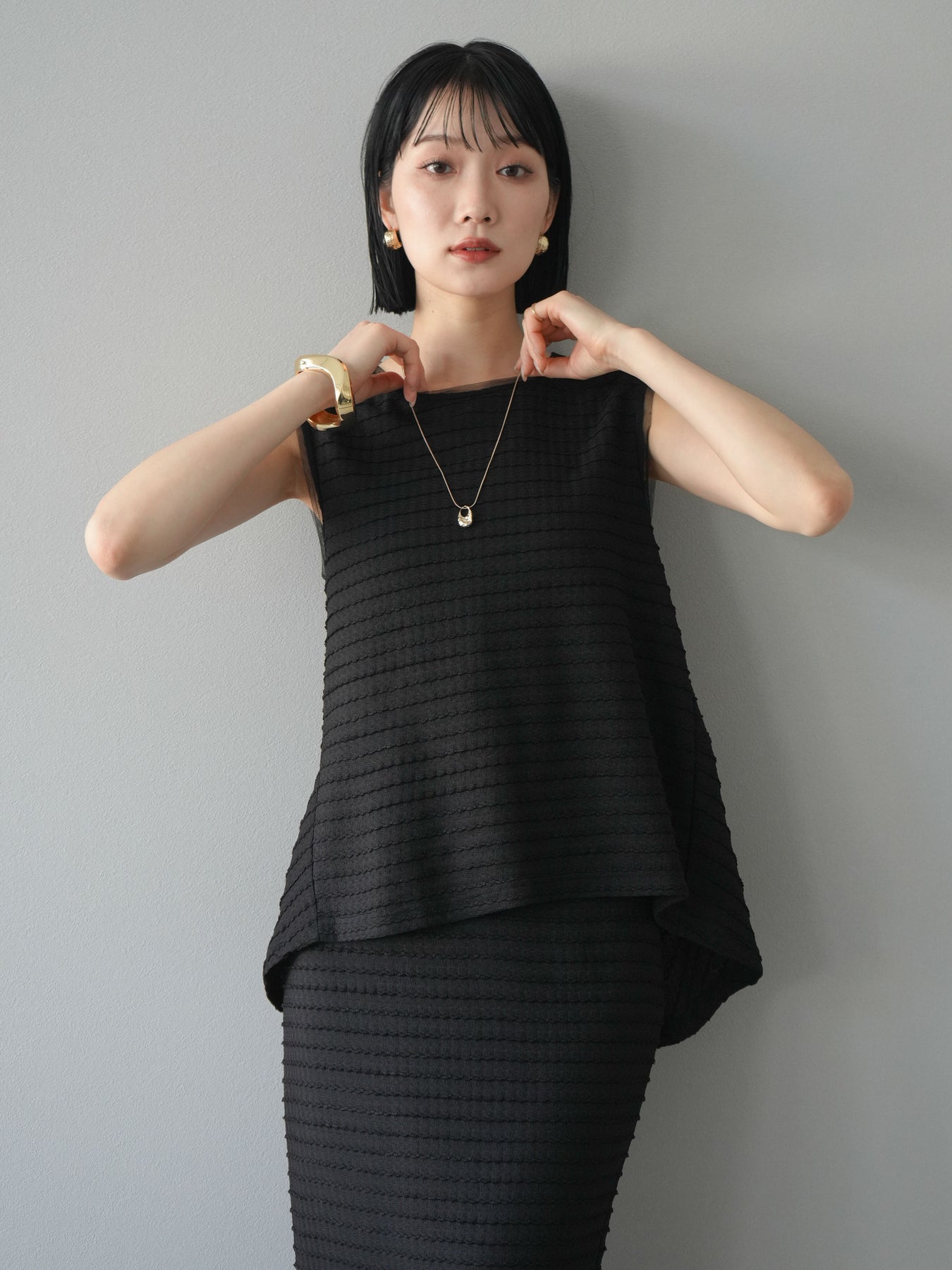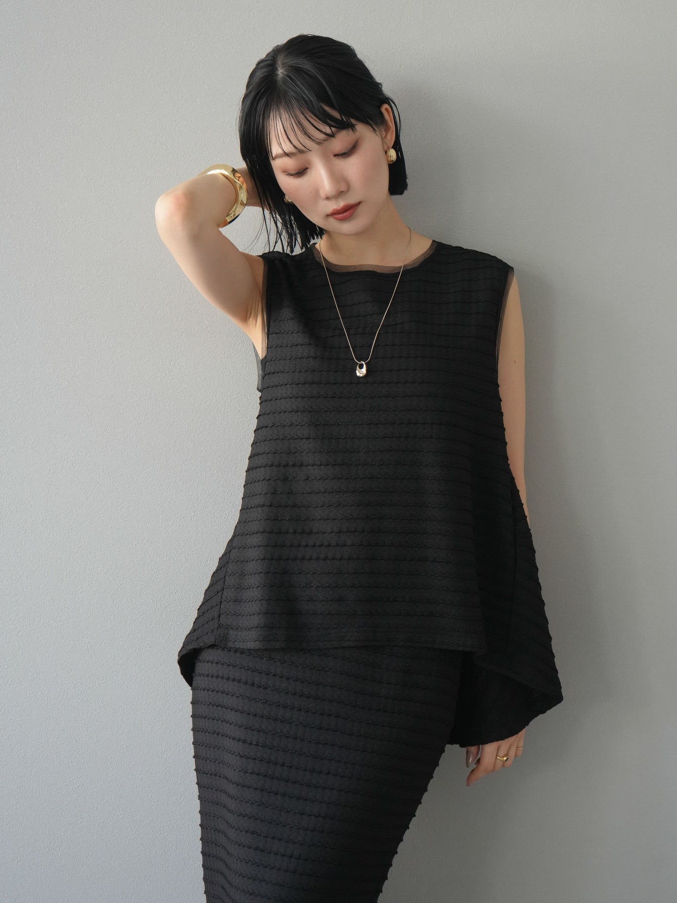 [予約]ジャガードウェーブぺプラムノースリーブ/ブラック