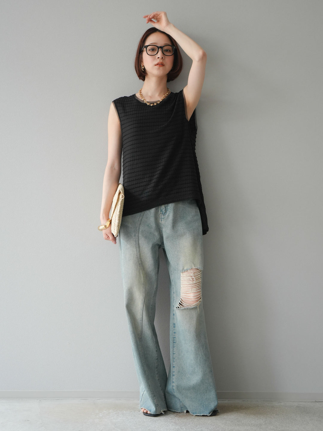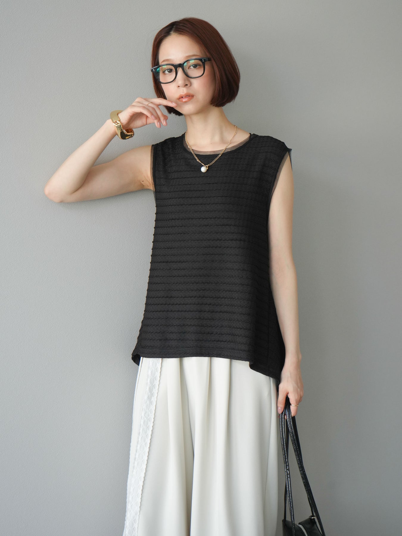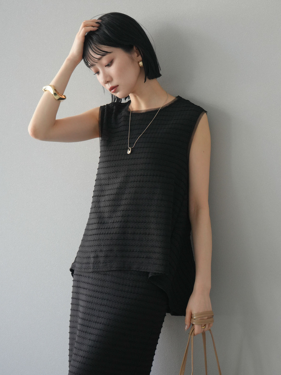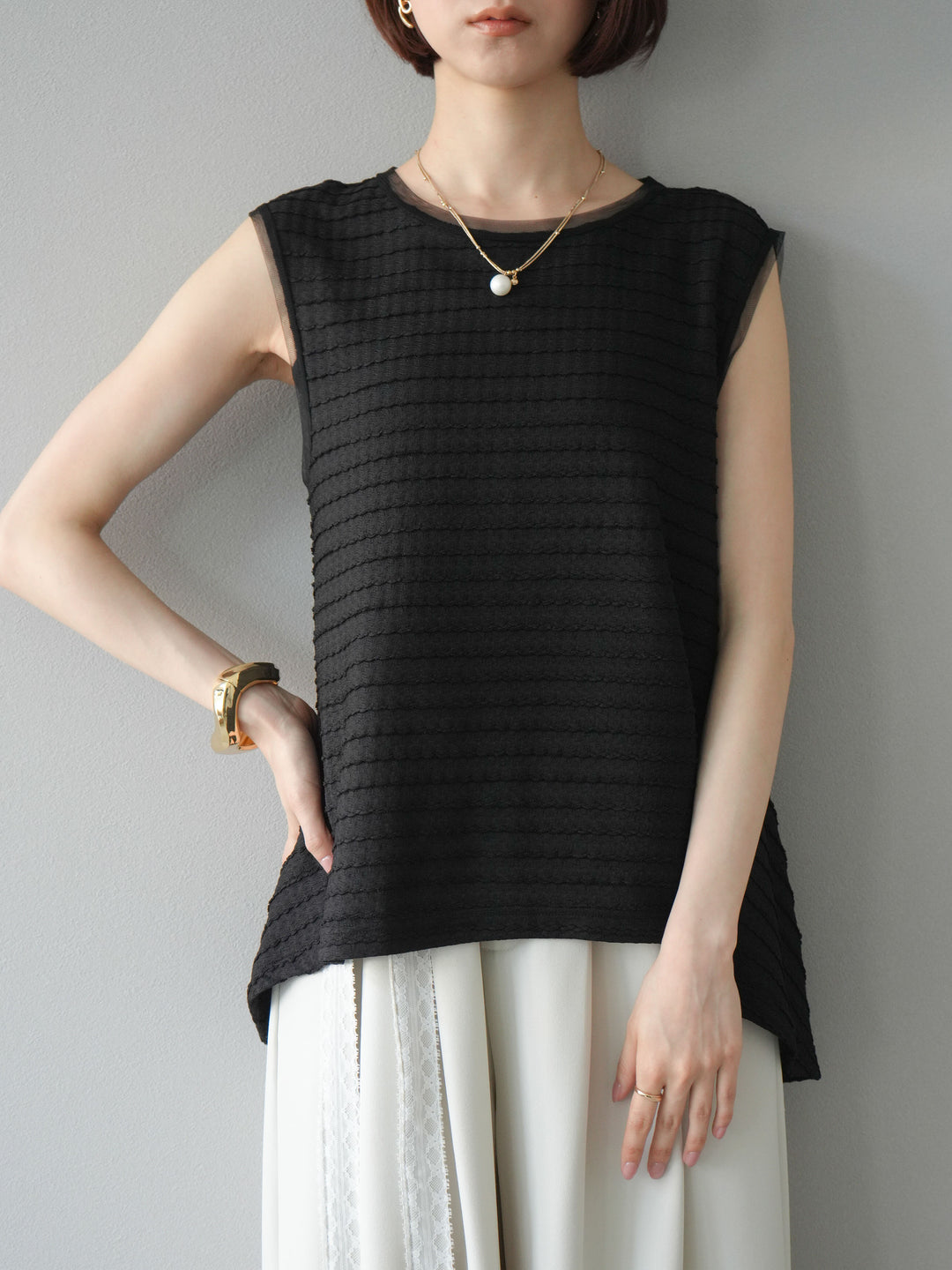 立体感のあるウェーブジャガード素材が魅力のノースリーブトップス。裾にかけて自然に広がるぺプラムシルエットが、スタイルアップを叶えつつ女性らしいニュアンスを演出します。軽やかな素材感で着心地も抜群。シンプルながらも存在感があり、デニムやワイドパンツと合わせるだけで旬のスタイリングが完成します。 ※ボトムス、キャミソール(インナー)以外の商品は一律でインナーは付属していません