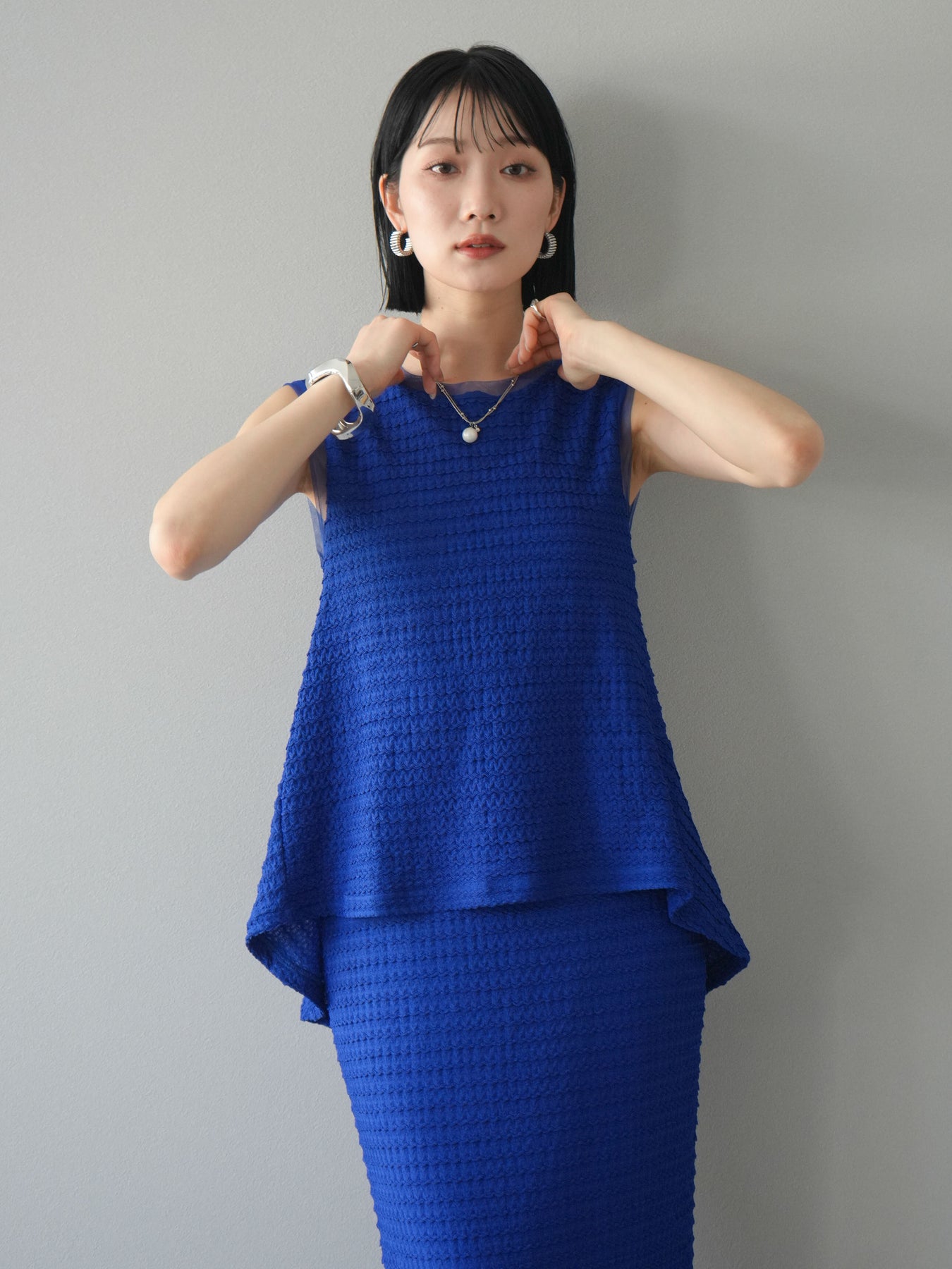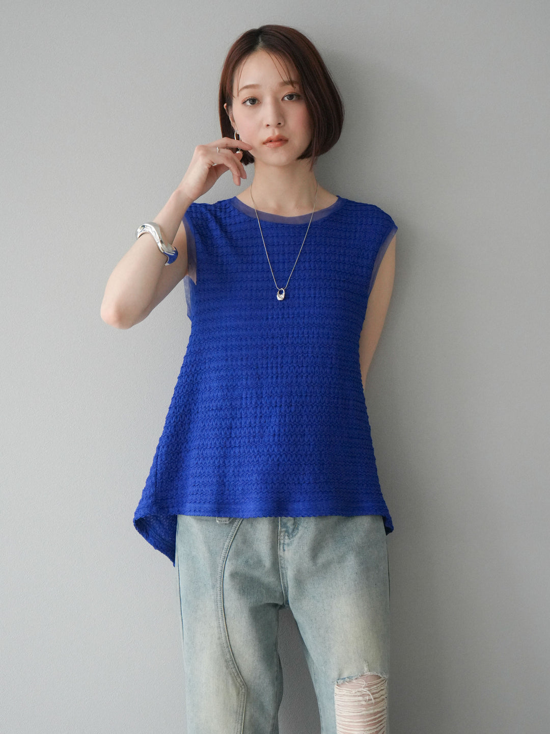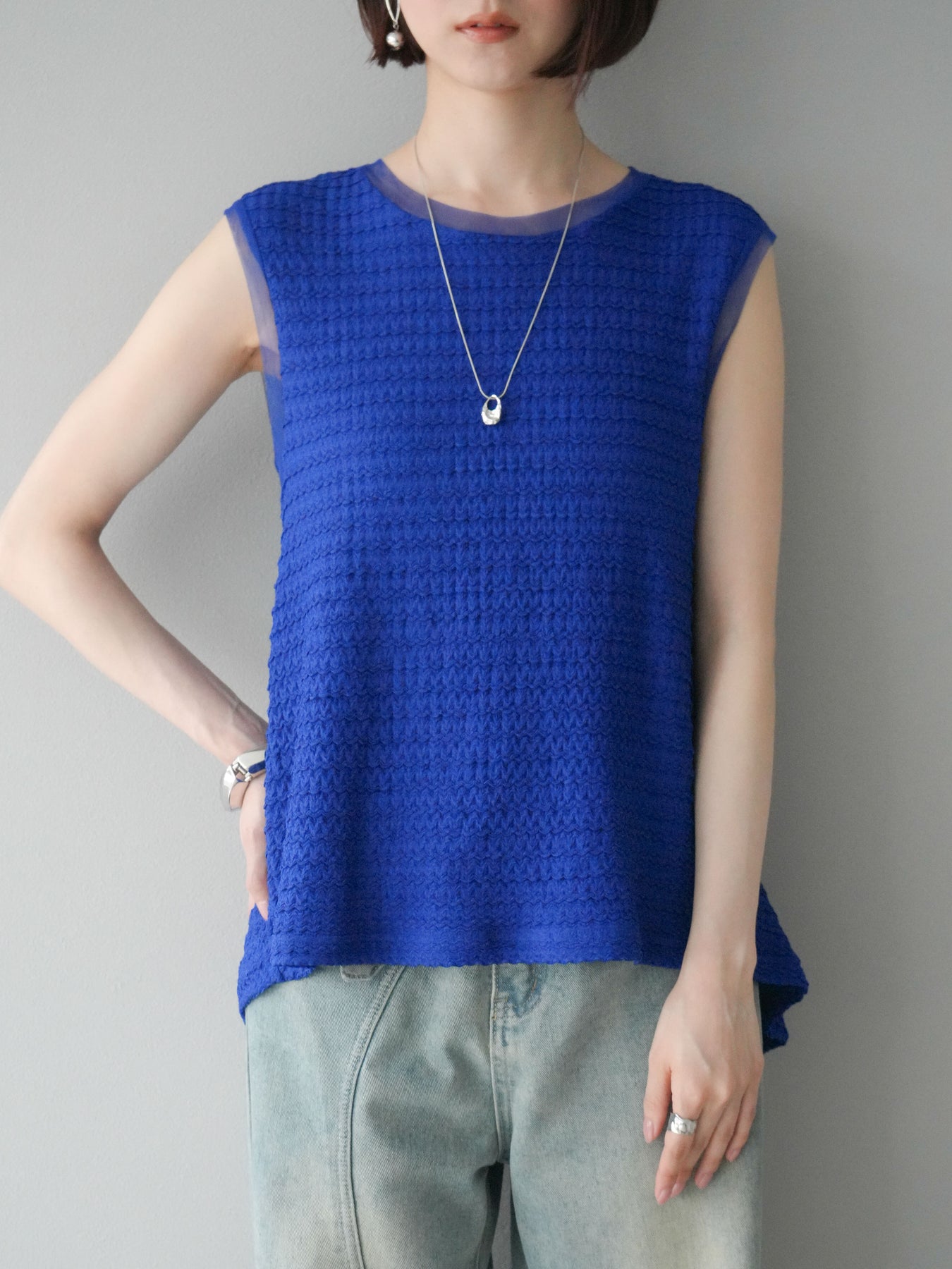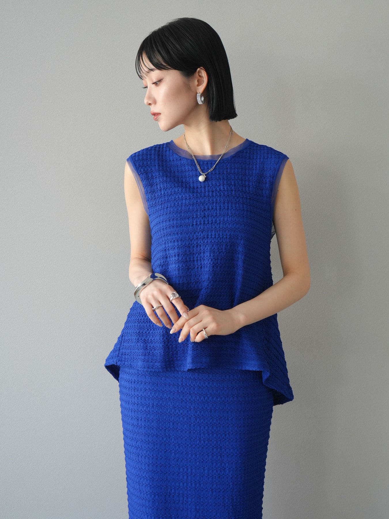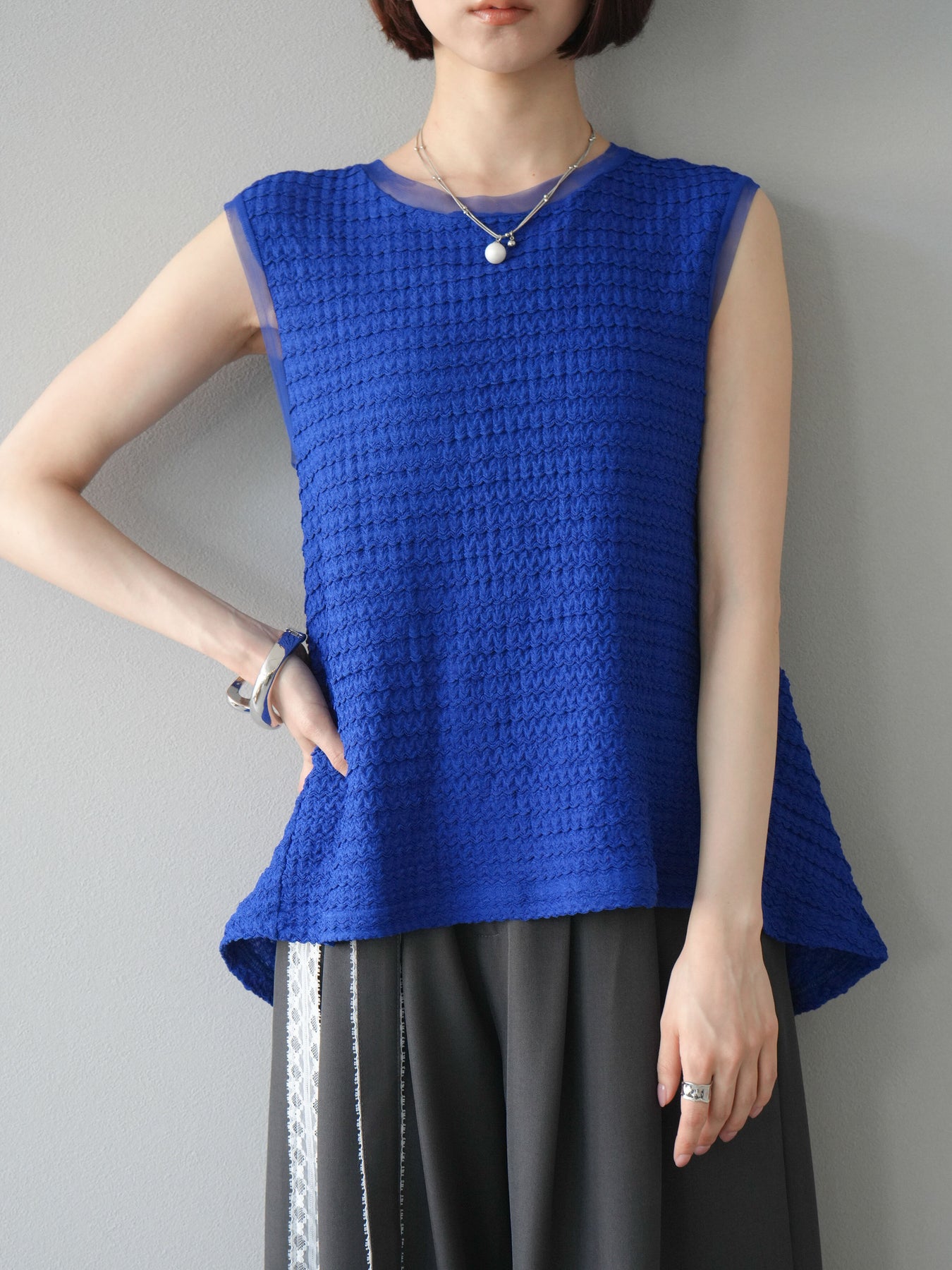 [予約]ジャガードウェーブぺプラムノースリーブ/ブルー