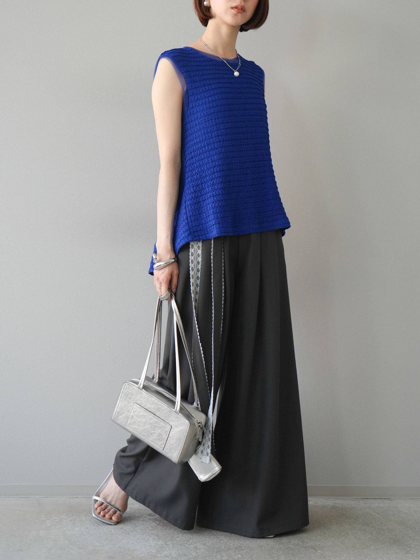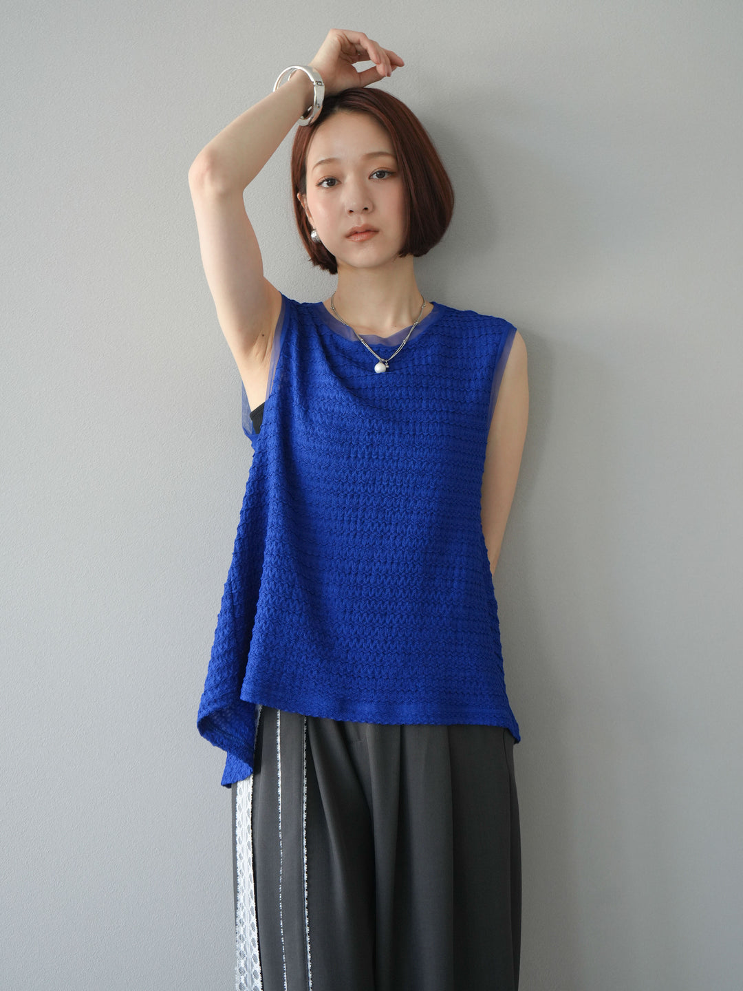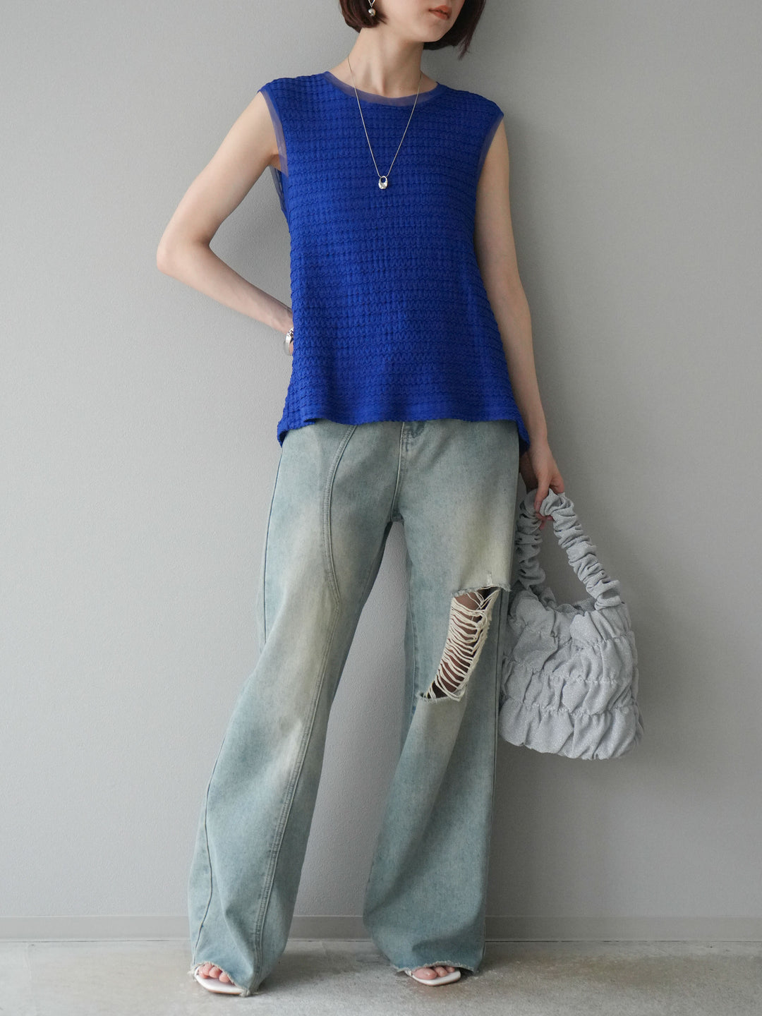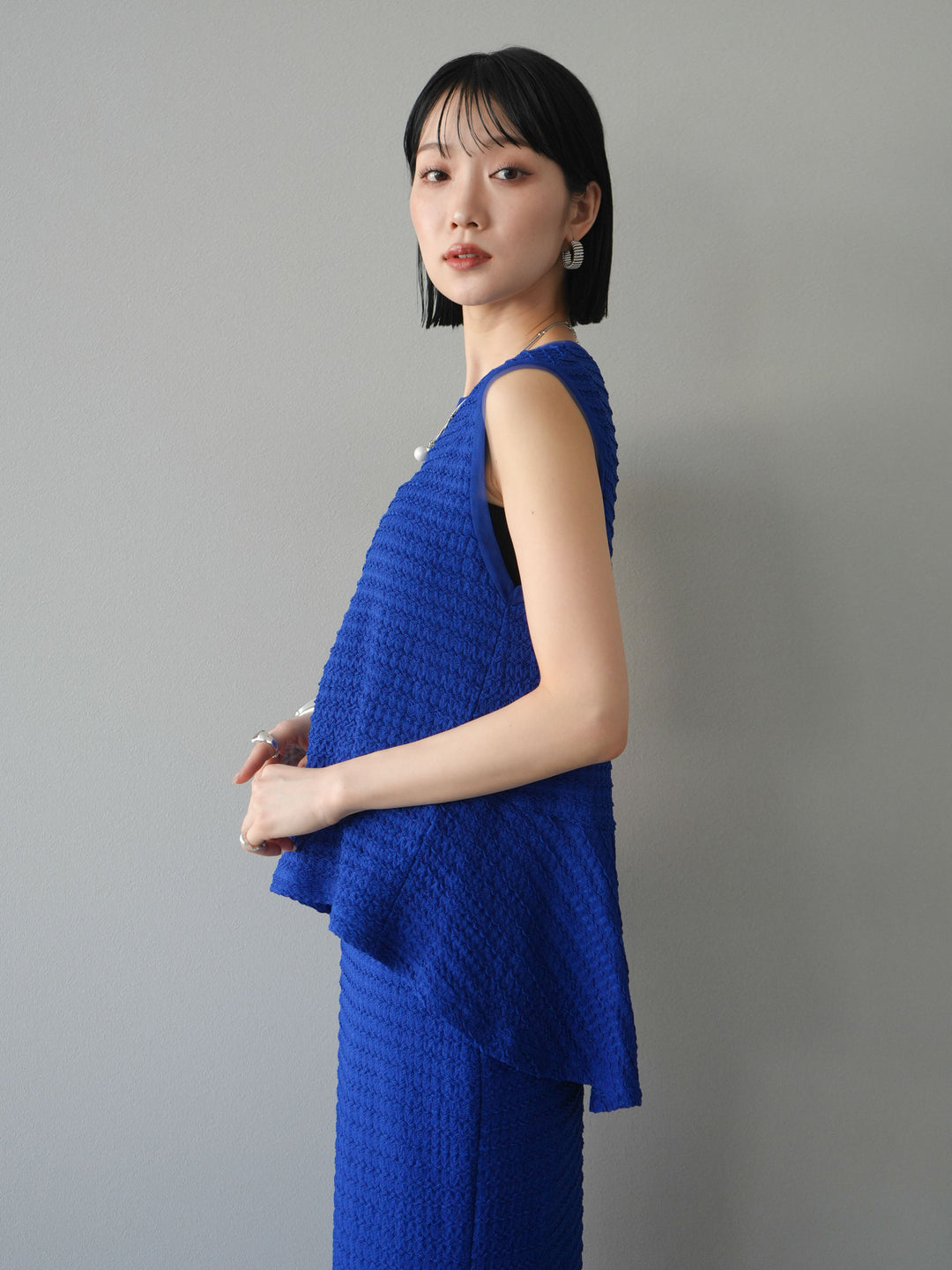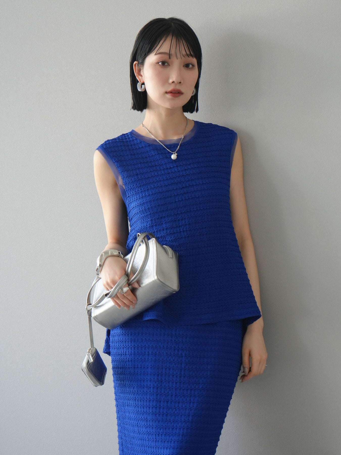 [予約]ジャガードウェーブぺプラムノースリーブ/ブルー
