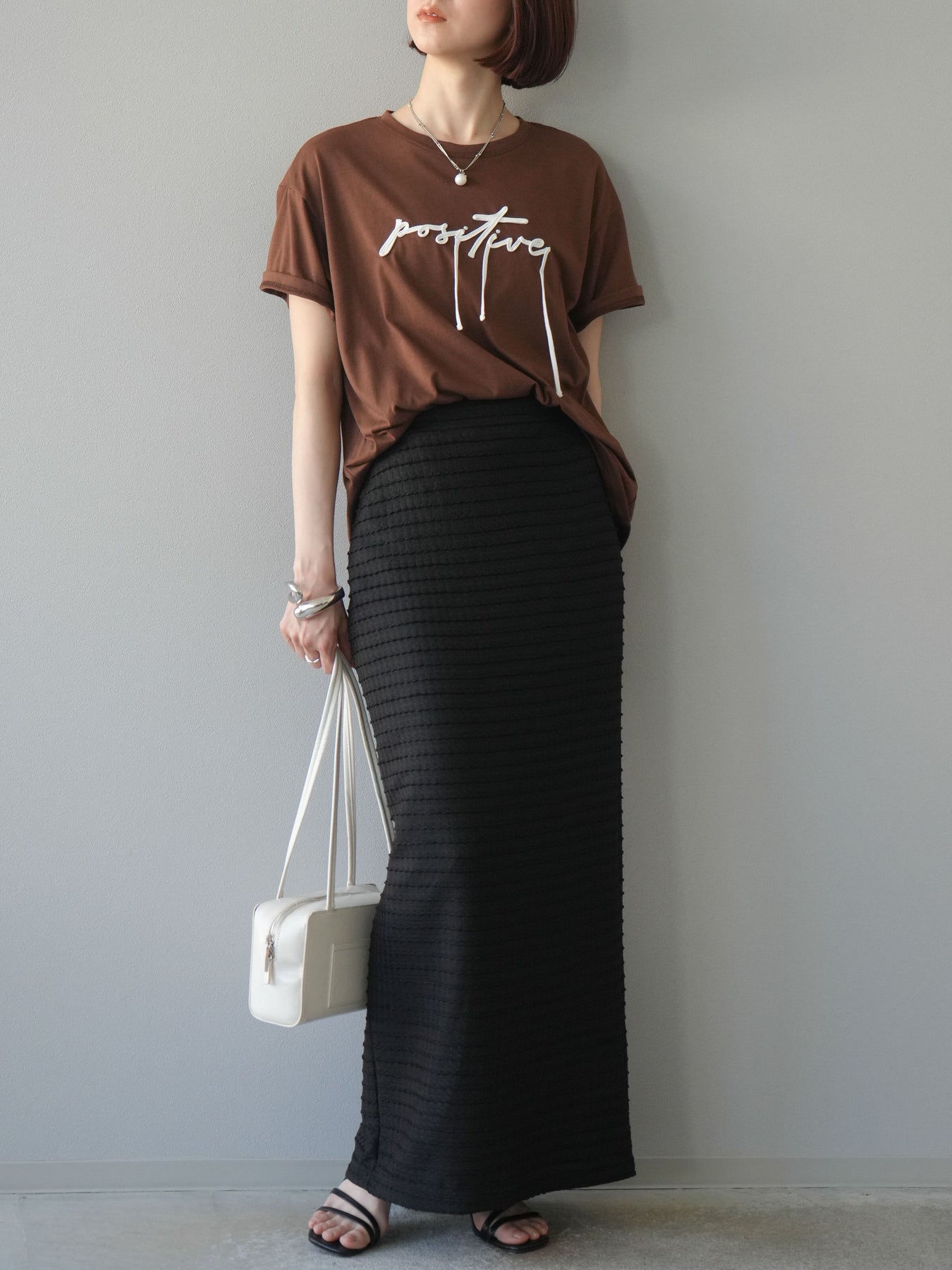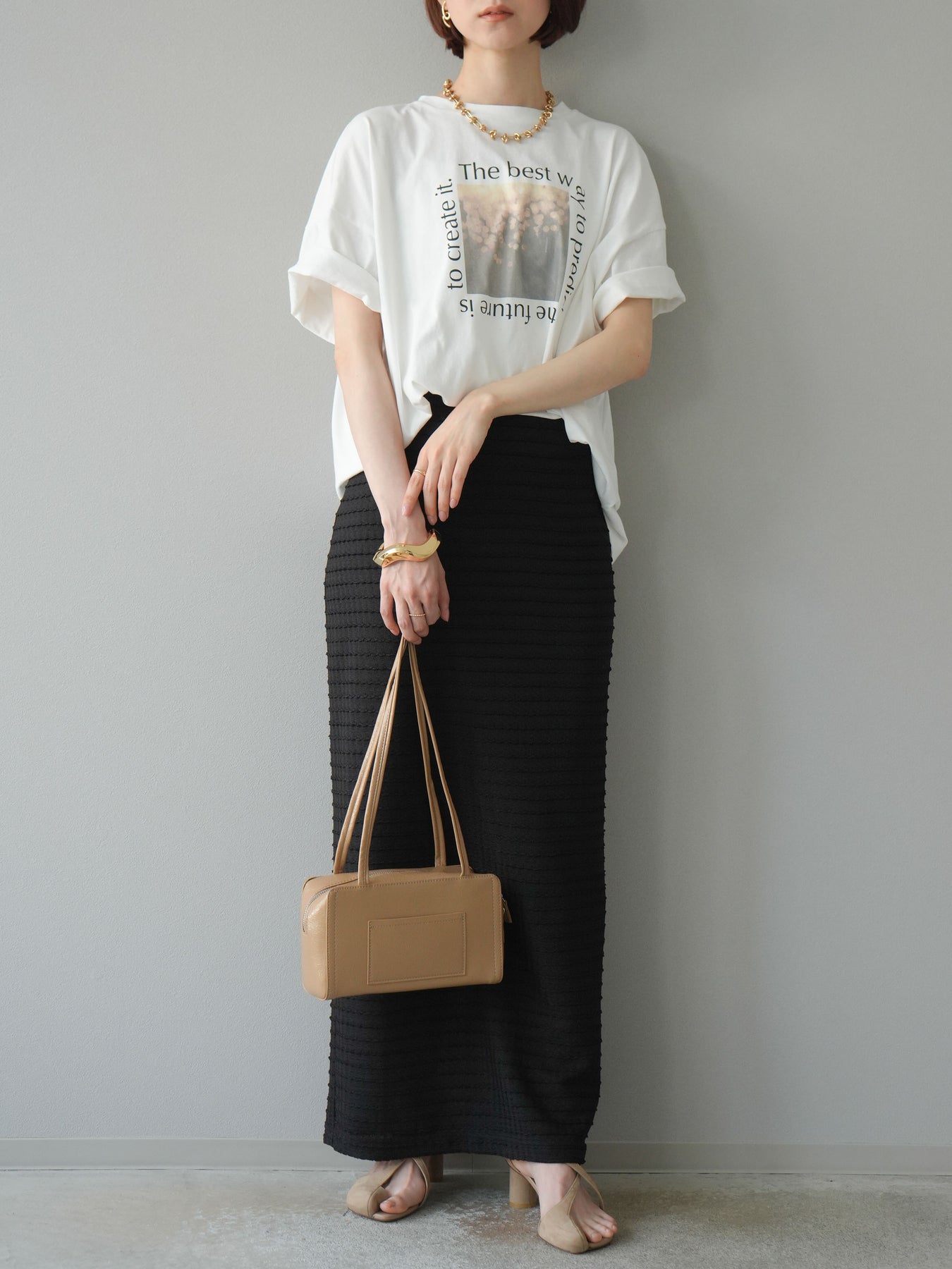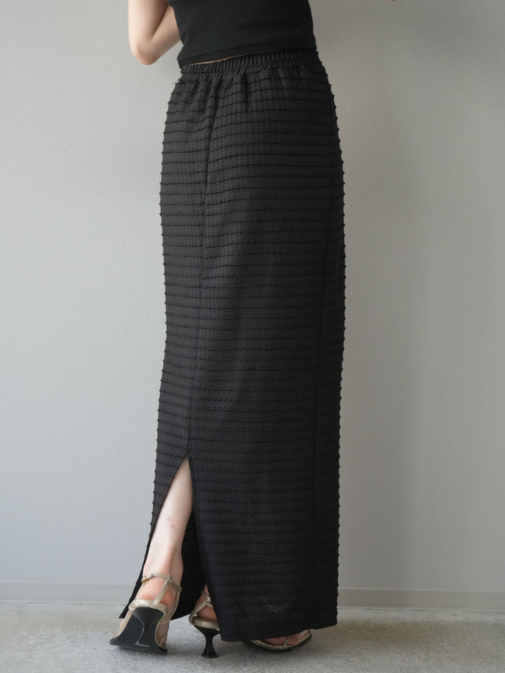 立体感のあるウェーブジャガード素材が目を惹くタイトスカート。シンプルながらも存在感のある表情が、スタイリングをアップデートしてくれます。すっきりとしたIラインシルエットで、トップスを選ばず幅広い着こなしが可能。トレンド感を押さえつつ、きれいめにもカジュアルにもマッチする万能アイテムです。 ※ボトムス、キャミソール(インナー)以外の商品は一律でインナーは付属していません