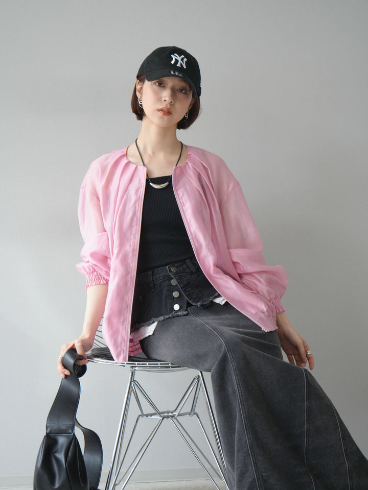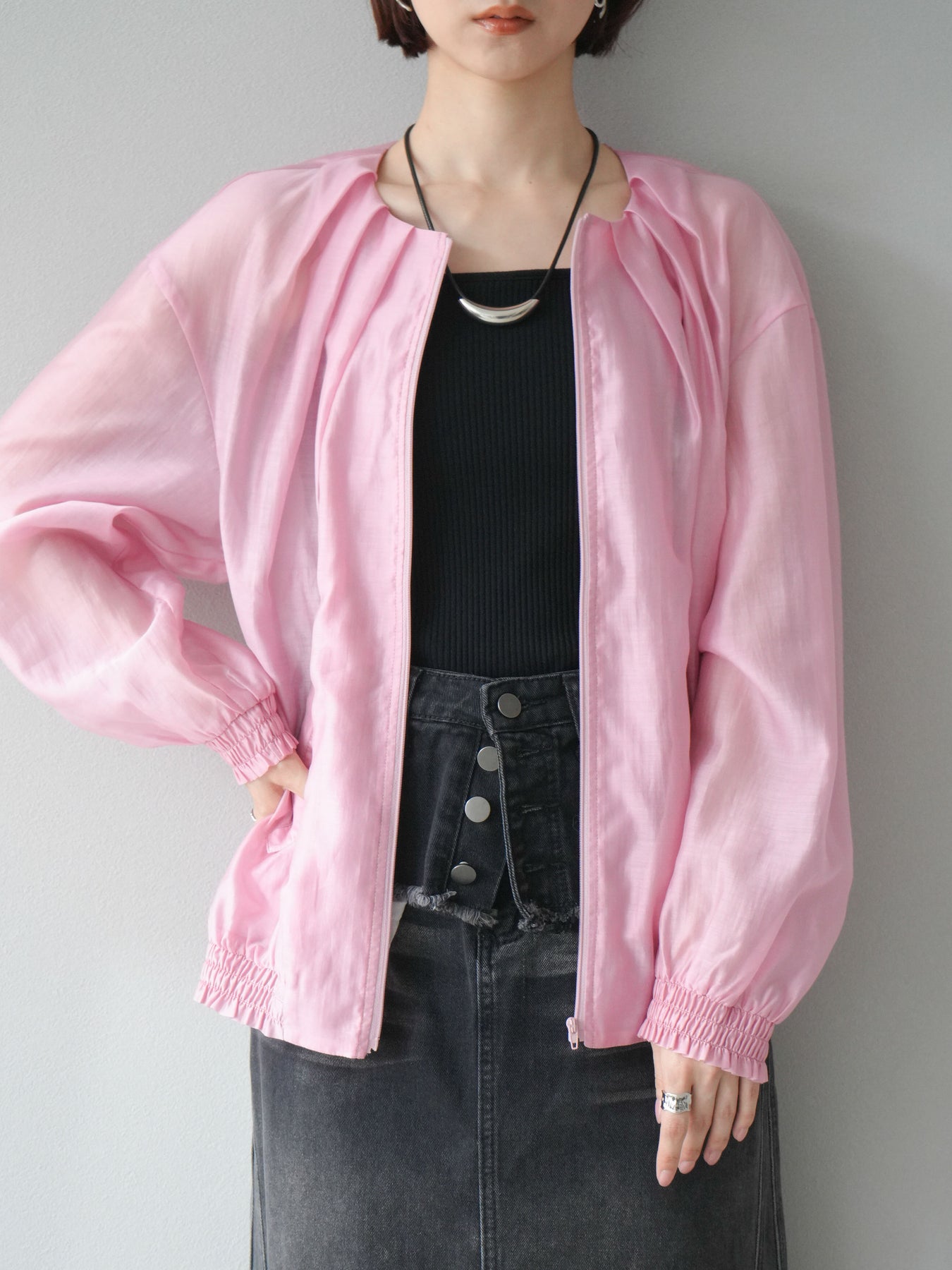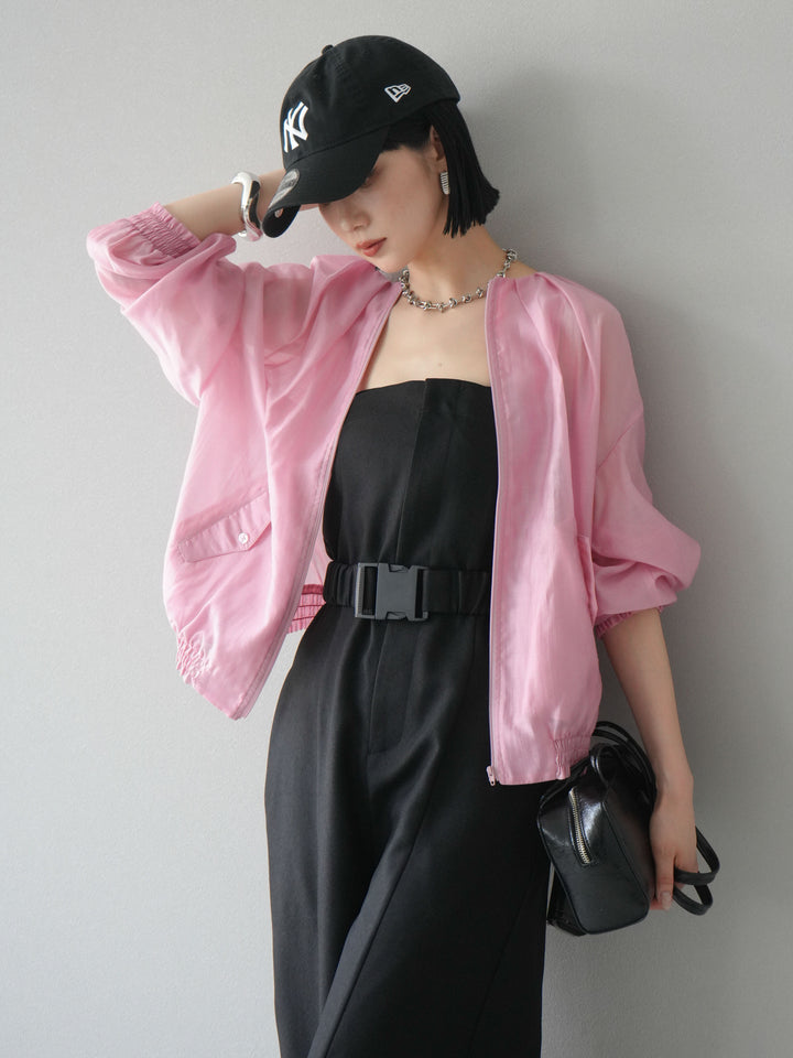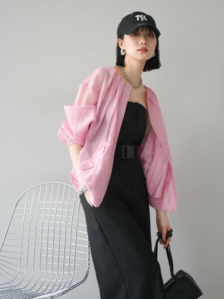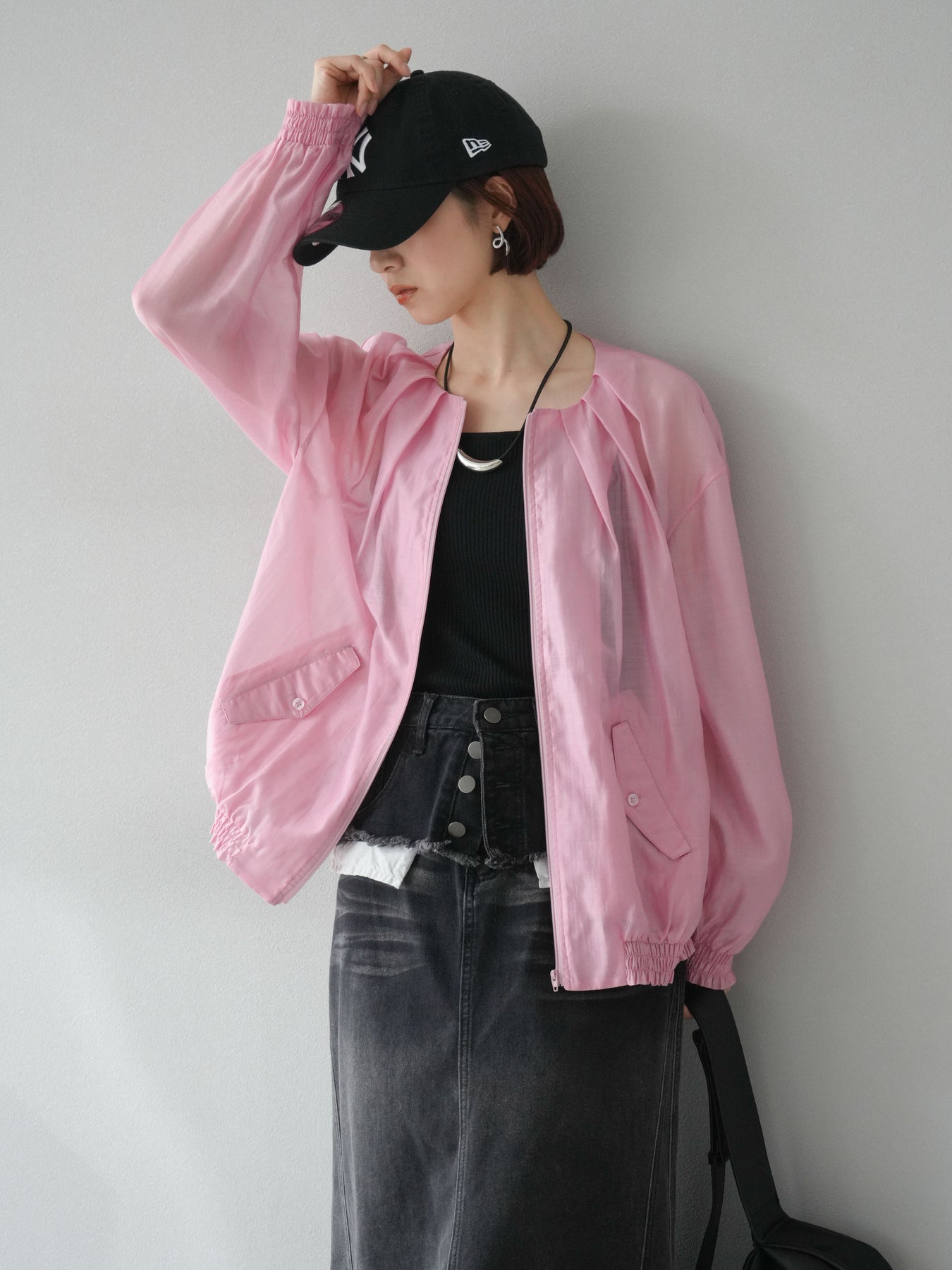 軽やかなシアー素材にタックを施し、立体感を演出したトレンド感たっぷりのブルゾン。ふんわりとしたシルエットで、羽織るだけで女性らしい抜け感をプラスします。袖口にはゴムを入れて、程よいボリューム感をキープ。カジュアルからきれいめまで幅広いスタイリングにマッチする万能アイテムです。 ※ボトムス、キャミソール(インナー)以外の商品は一律でインナーは付属していません
