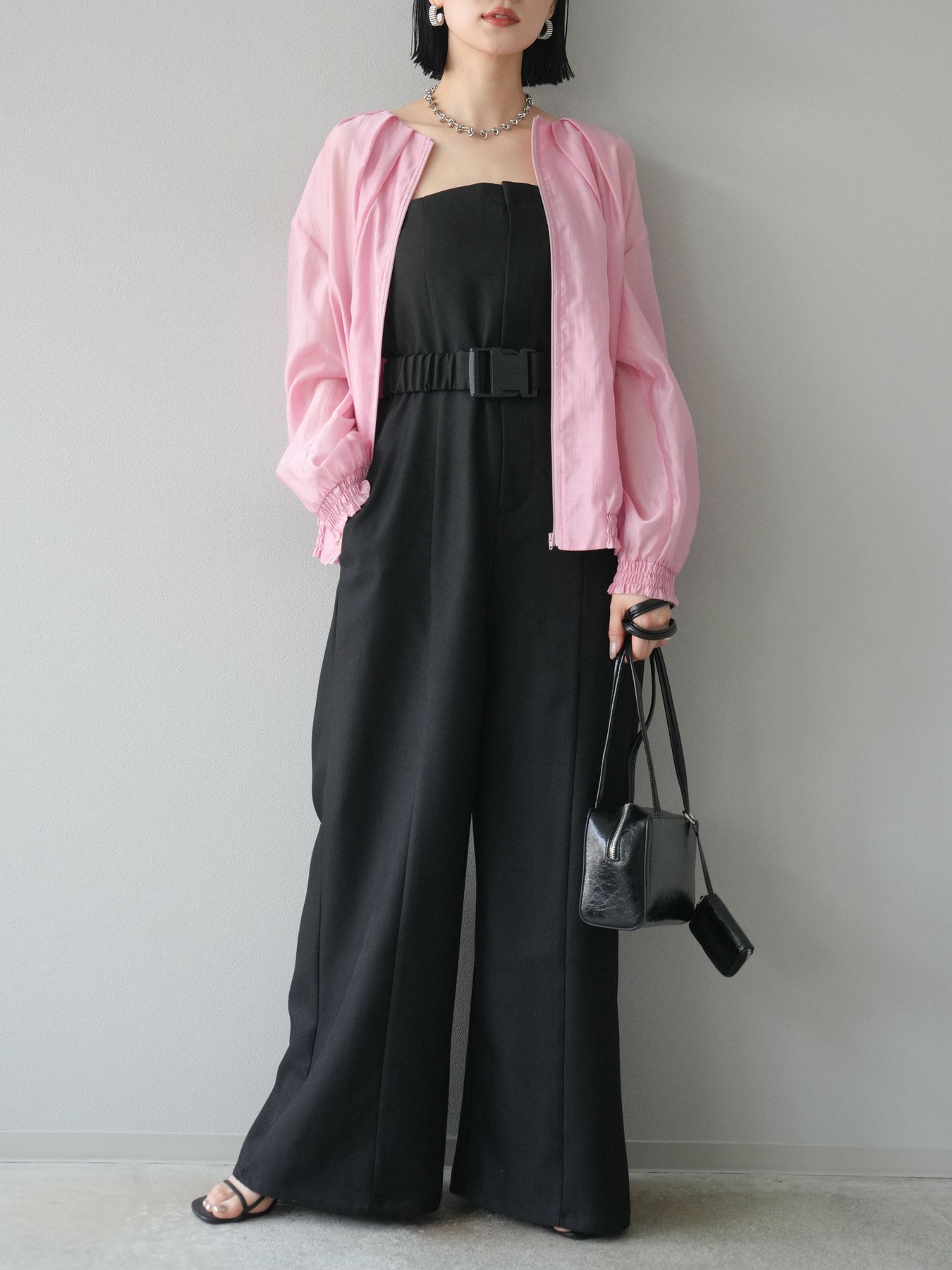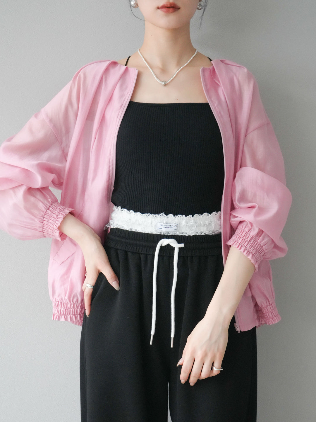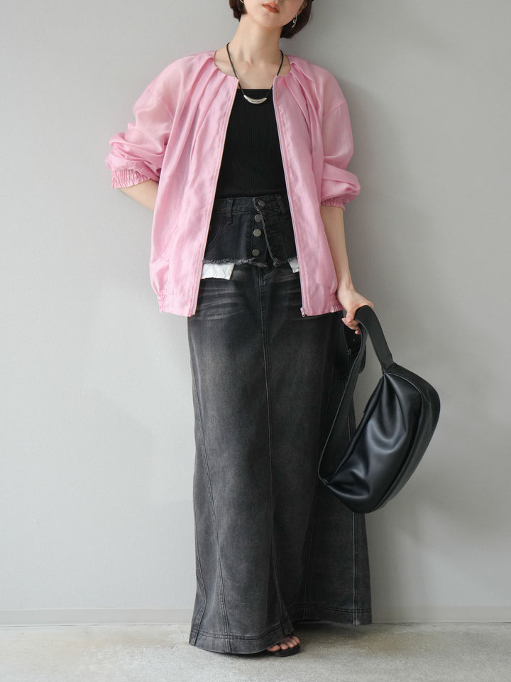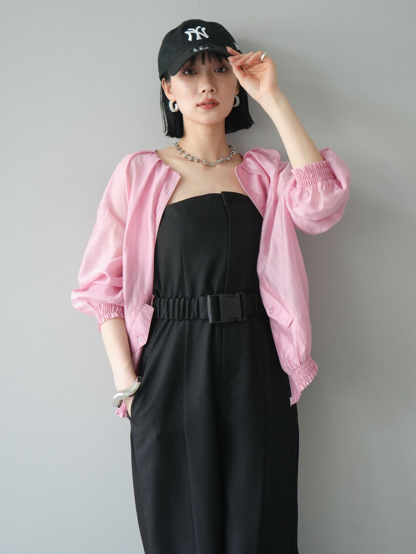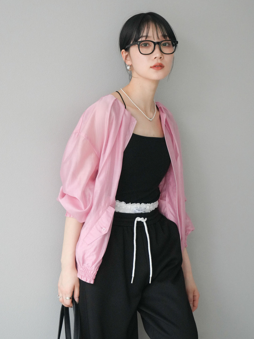 軽やかなシアー素材にタックを施し、立体感を演出したトレンド感たっぷりのブルゾン。ふんわりとしたシルエットで、羽織るだけで女性らしい抜け感をプラスします。袖口にはゴムを入れて、程よいボリューム感をキープ。カジュアルからきれいめまで幅広いスタイリングにマッチする万能アイテムです。 ※ボトムス、キャミソール(インナー)以外の商品は一律でインナーは付属していません