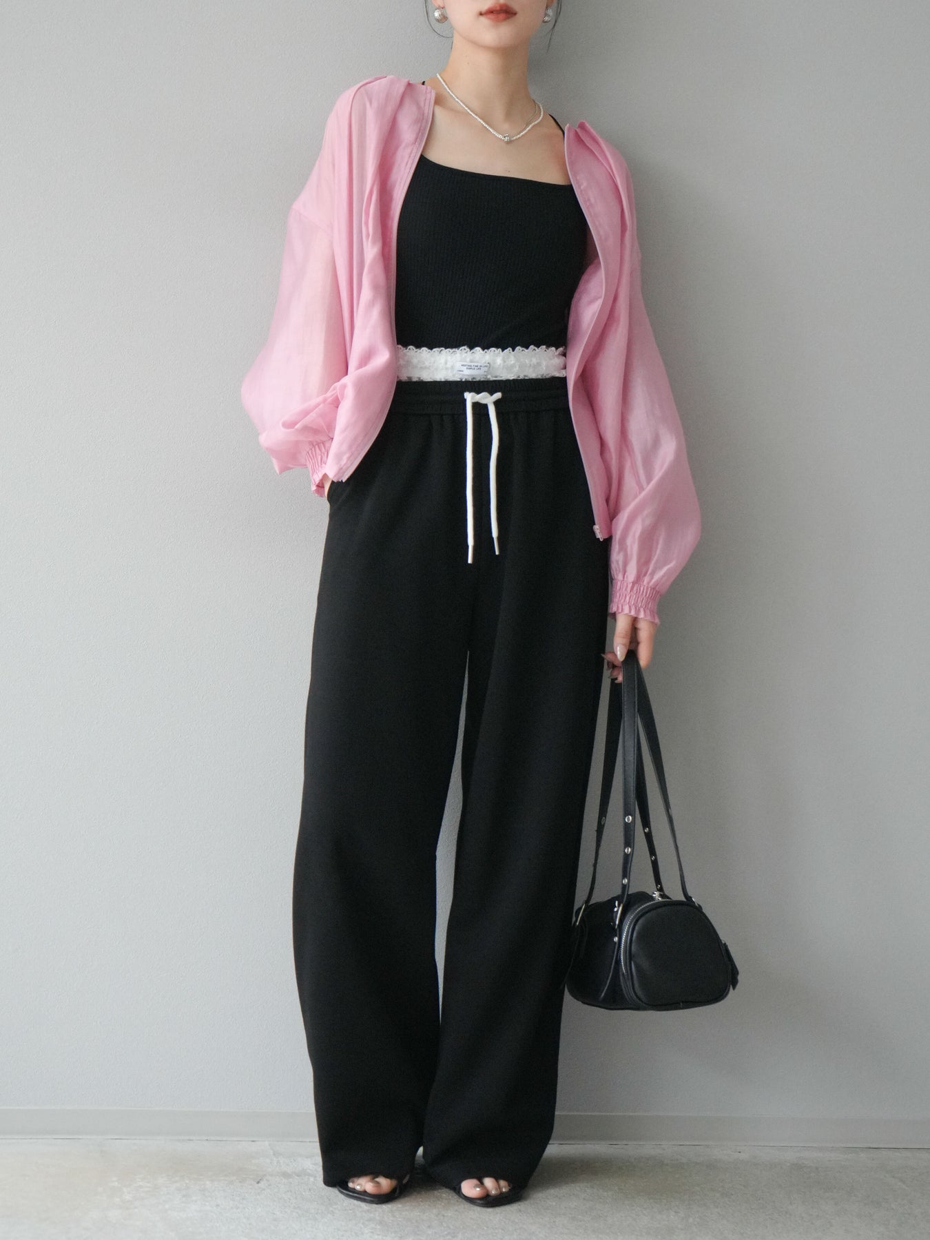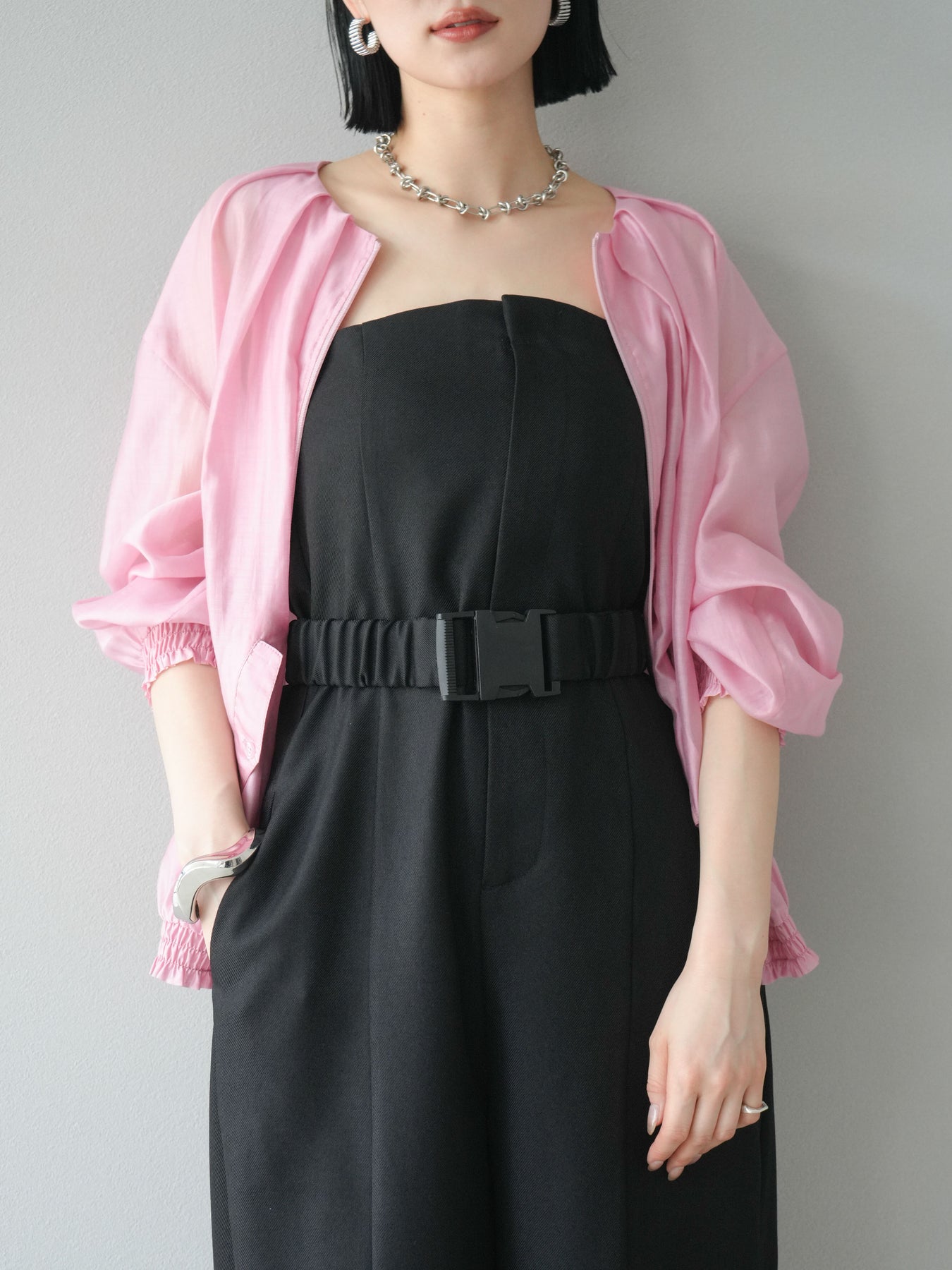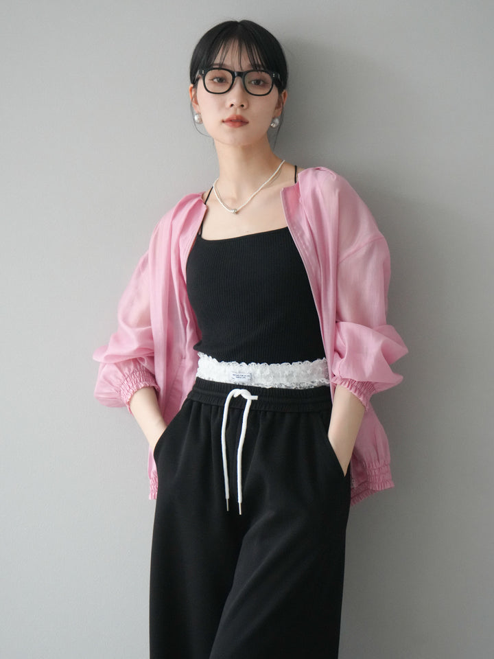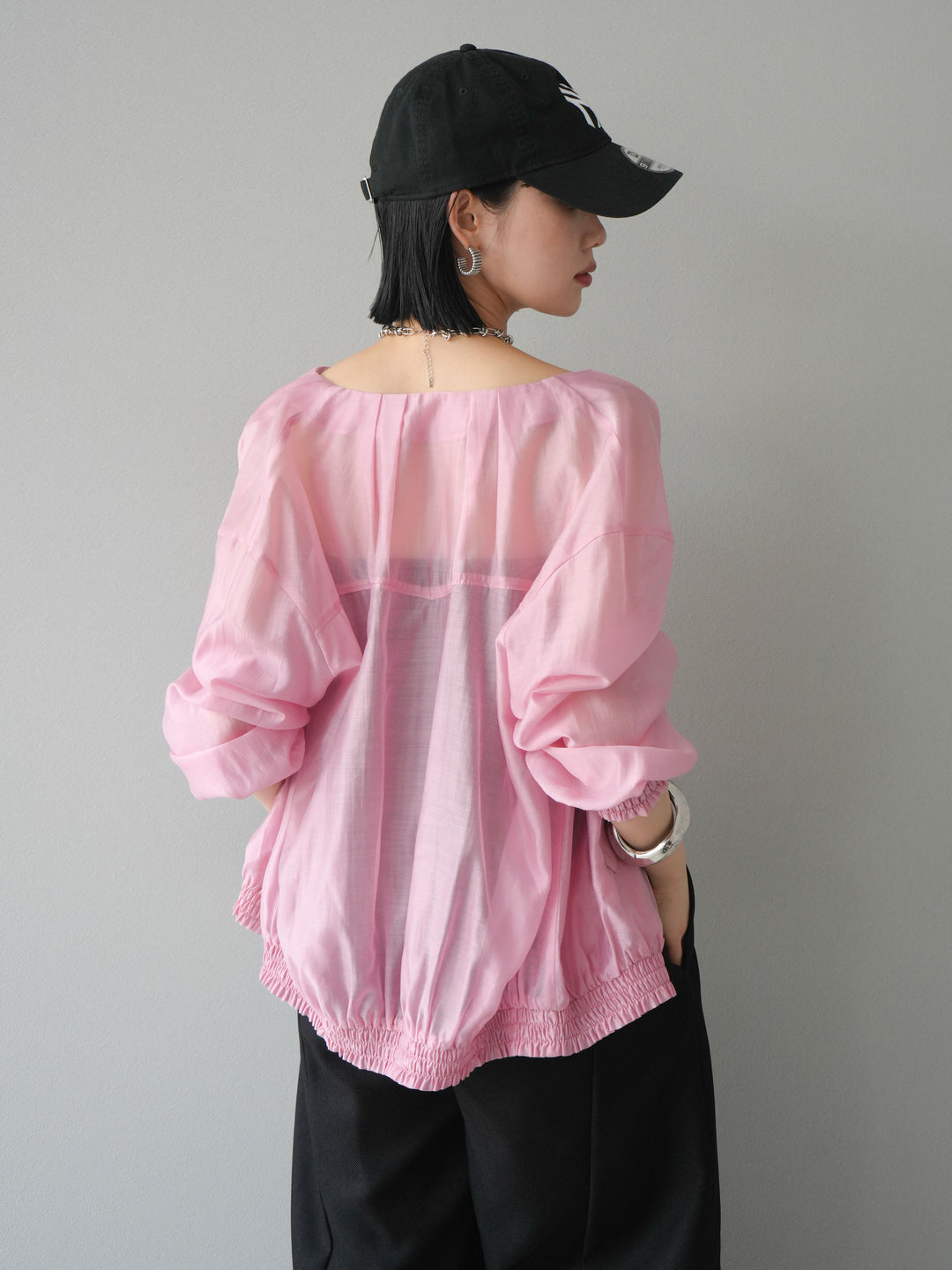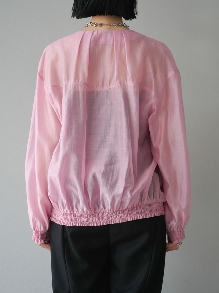 軽やかなシアー素材にタックを施し、立体感を演出したトレンド感たっぷりのブルゾン。ふんわりとしたシルエットで、羽織るだけで女性らしい抜け感をプラスします。袖口にはゴムを入れて、程よいボリューム感をキープ。カジュアルからきれいめまで幅広いスタイリングにマッチする万能アイテムです。 ※ボトムス、キャミソール(インナー)以外の商品は一律でインナーは付属していません