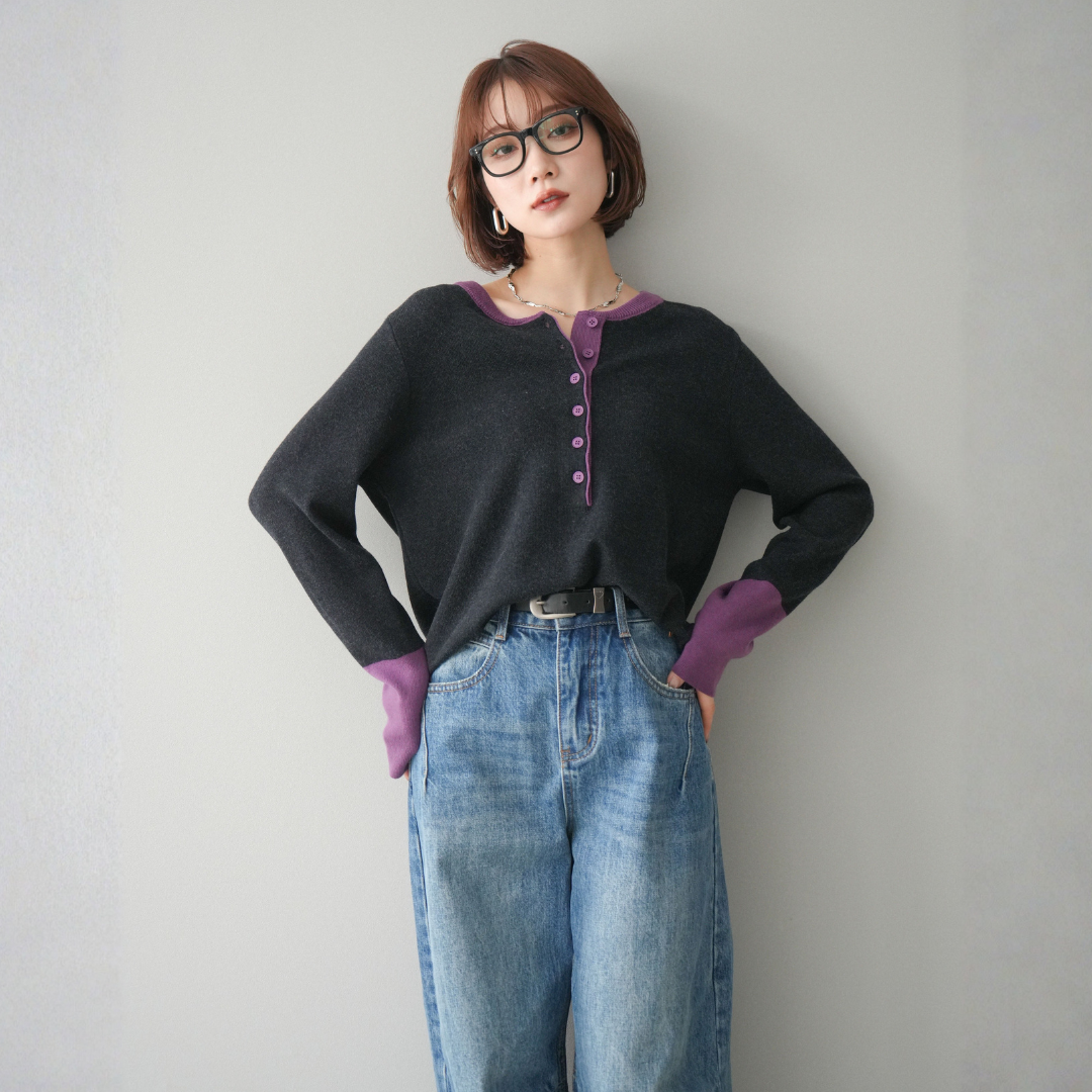 [SET]ヘンリーネック配色レイヤードニットプルオーバー+ベルトデザインループコールテンワイドパンツ(ベルト付き)(2set)