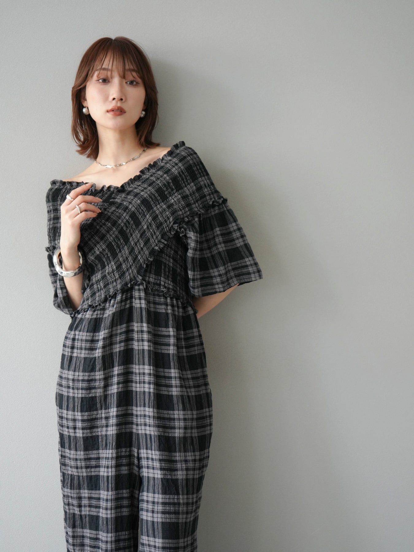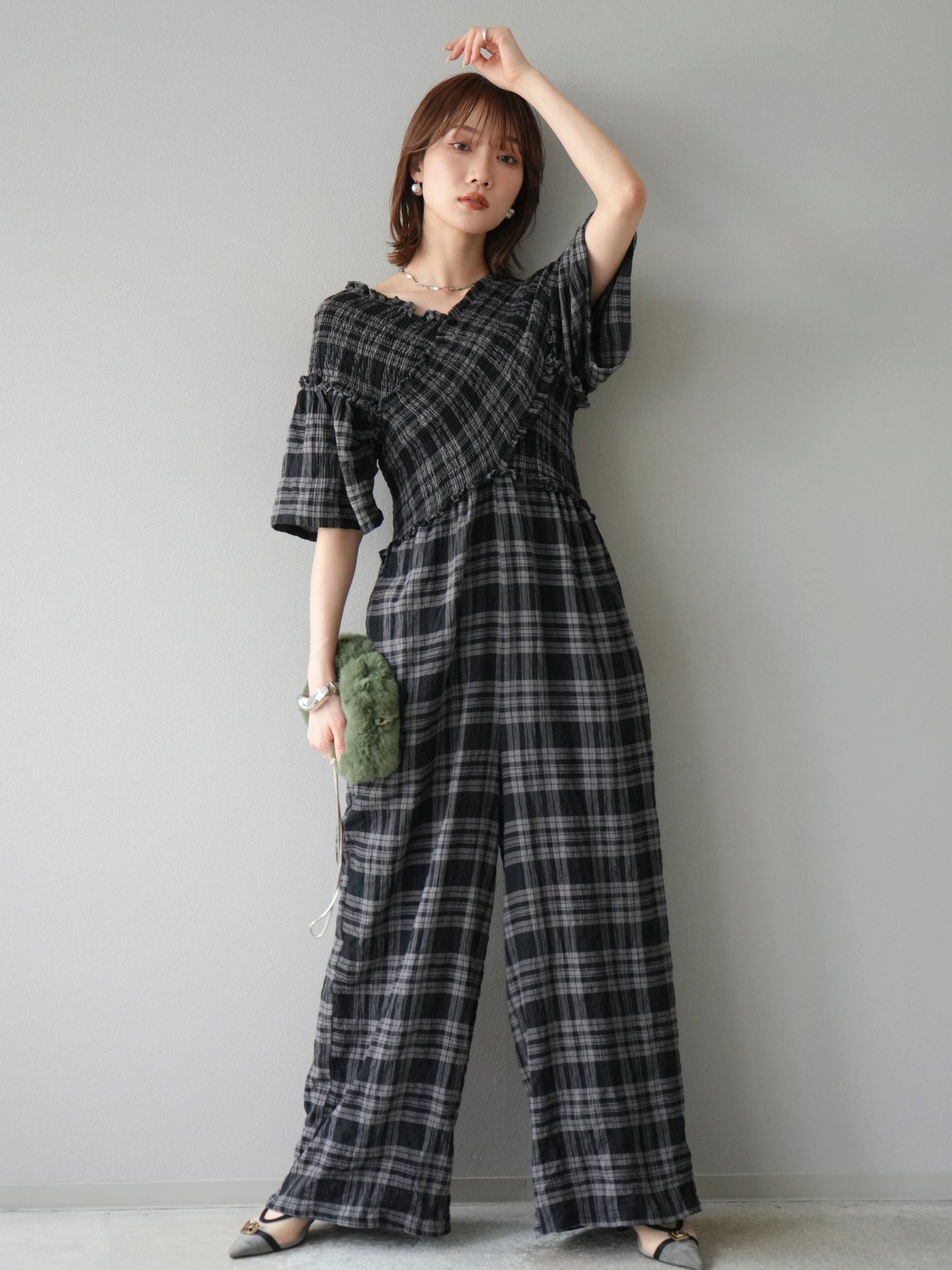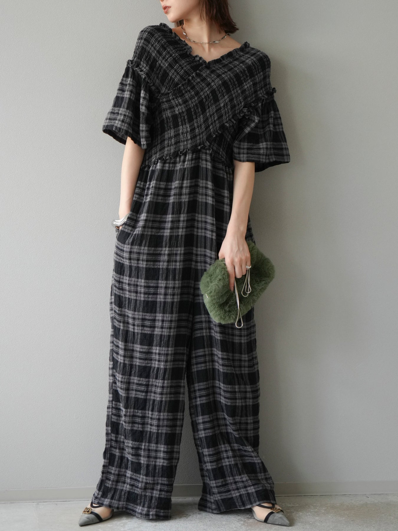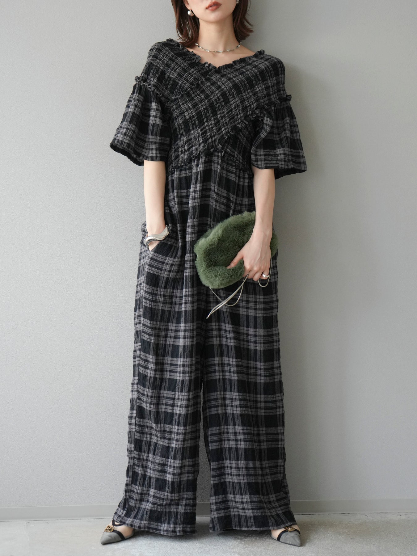 チェック柄が目を惹くハーフスリーブのサロペット。胸元に施したクロスデザインとシャーリングが立体感を生み、女性らしいシルエットを演出します。ゆとりのあるワイドシルエットでリラクシーな着心地ながら、スタイルアップも叶うバランスの良さが魅力。1枚でコーディネートが完成し、カジュアルからお出かけまで幅広く活躍するアイテムです。