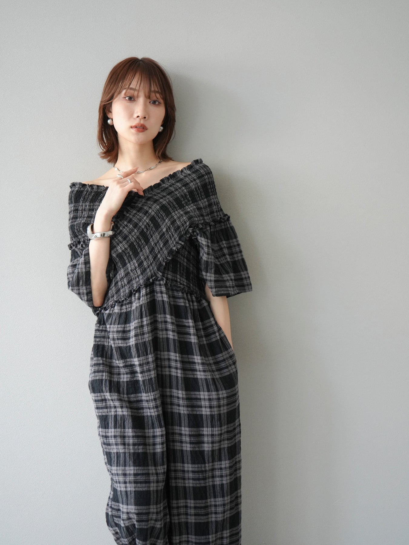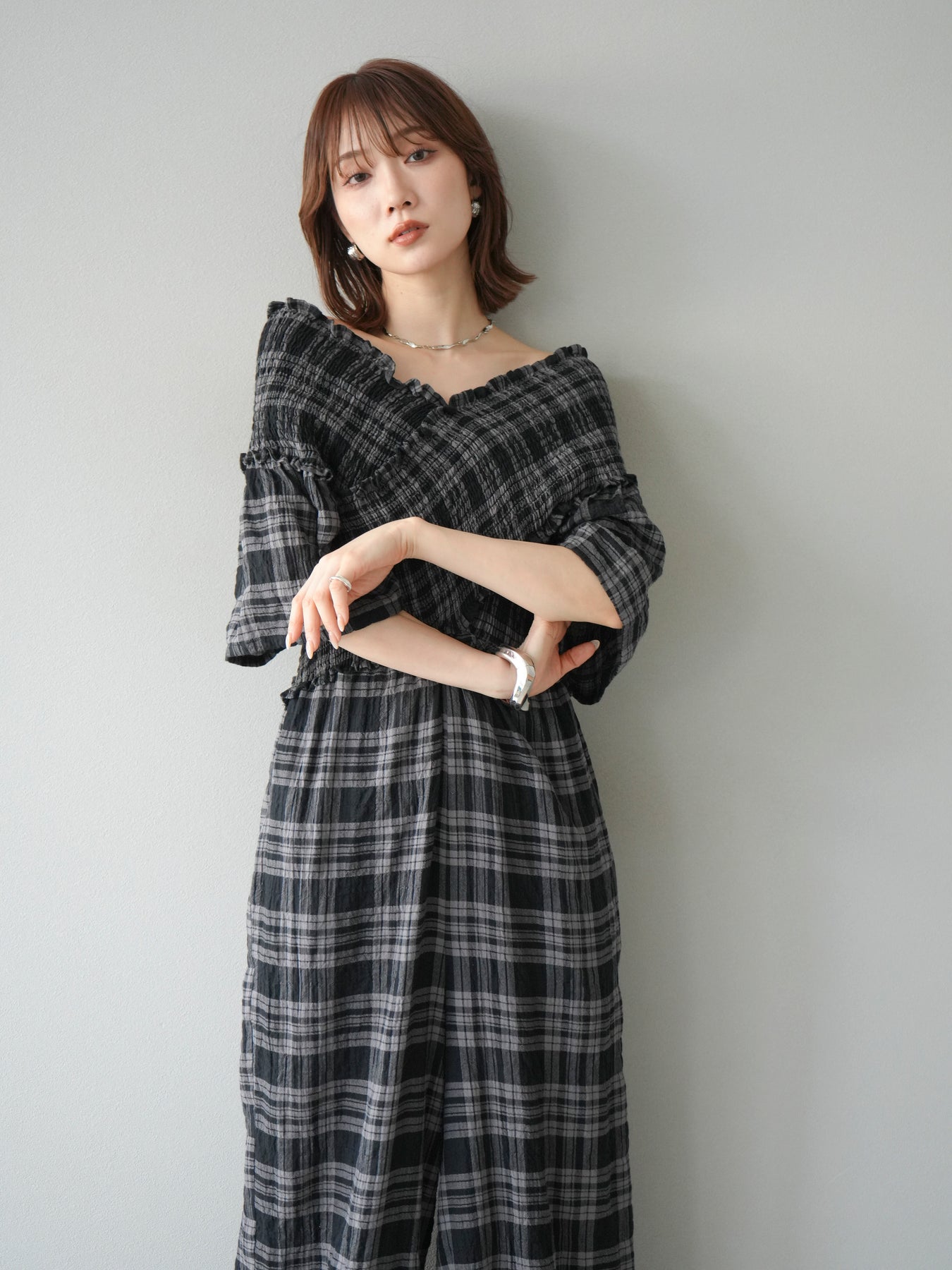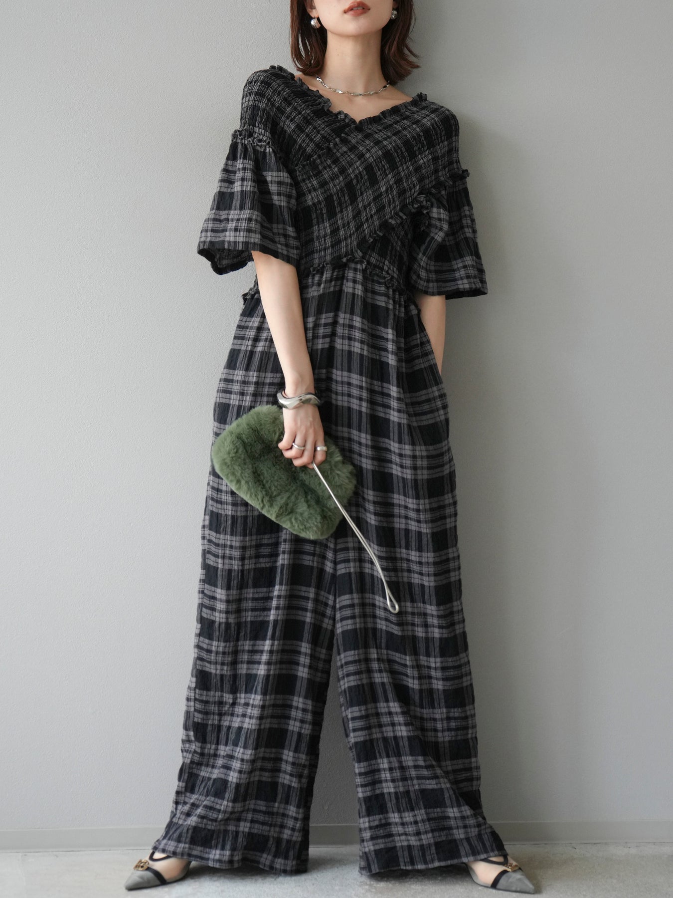 チェック柄が目を惹くハーフスリーブのサロペット。胸元に施したクロスデザインとシャーリングが立体感を生み、女性らしいシルエットを演出します。ゆとりのあるワイドシルエットでリラクシーな着心地ながら、スタイルアップも叶うバランスの良さが魅力。1枚でコーディネートが完成し、カジュアルからお出かけまで幅広く活躍するアイテムです。
