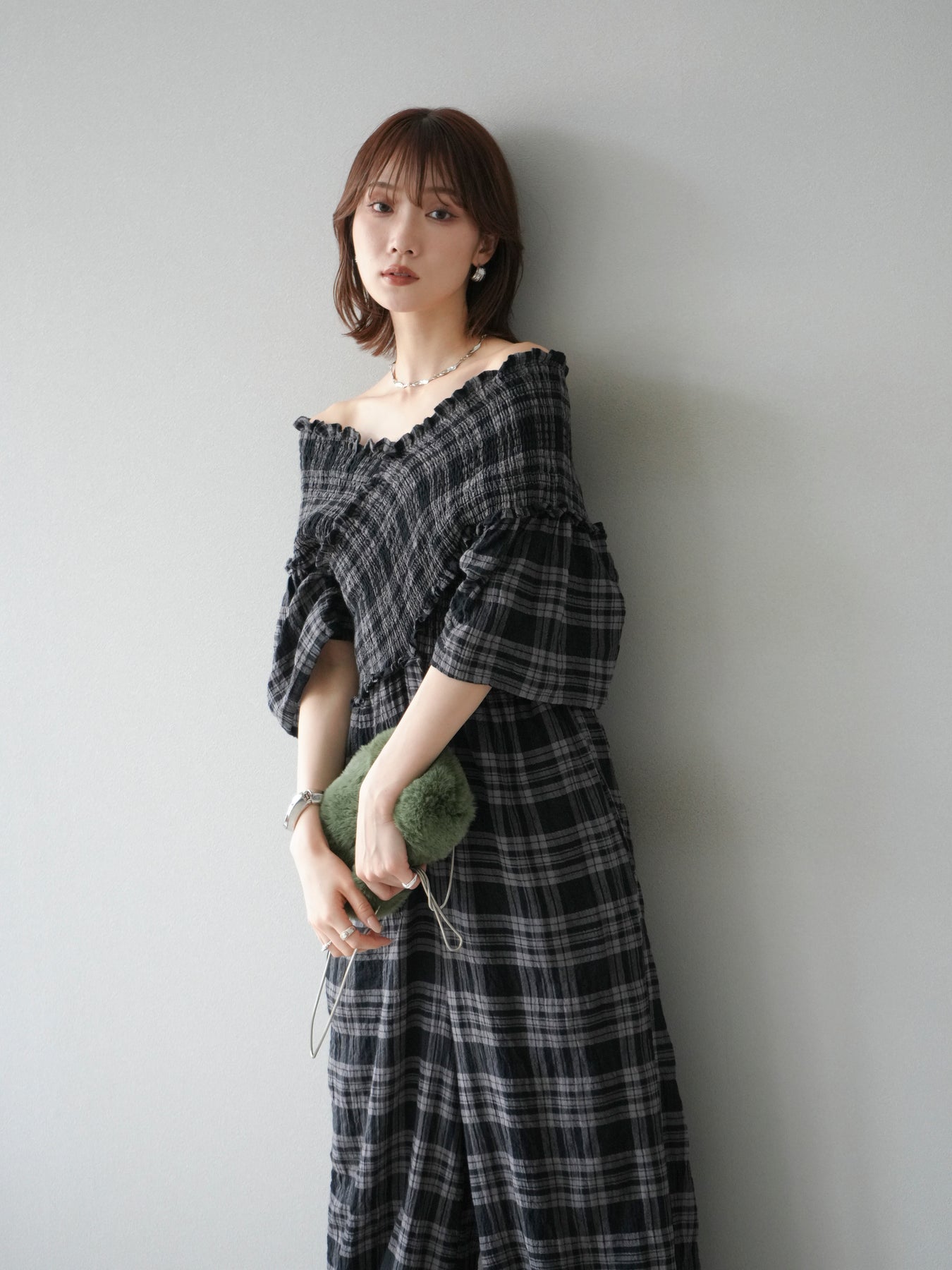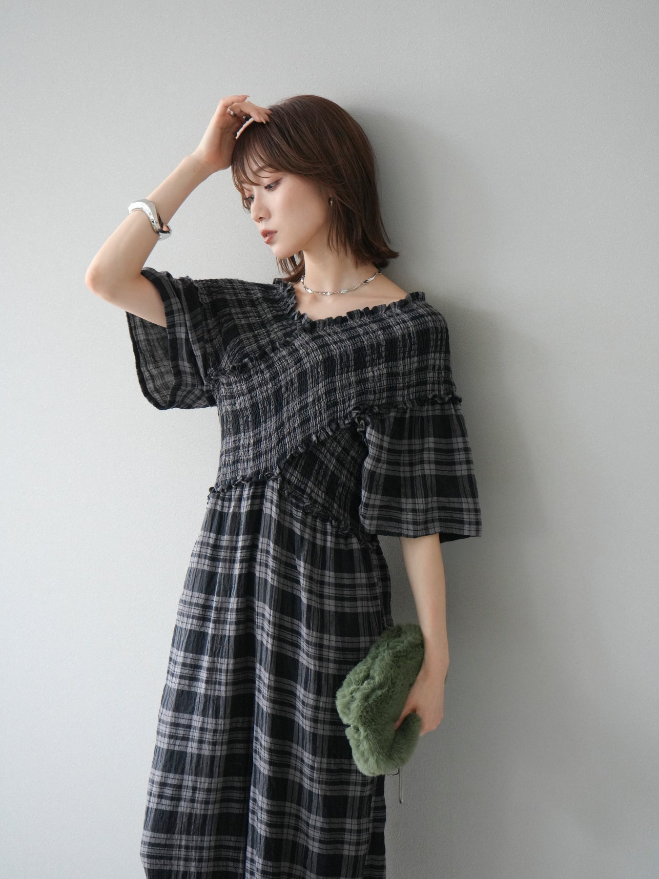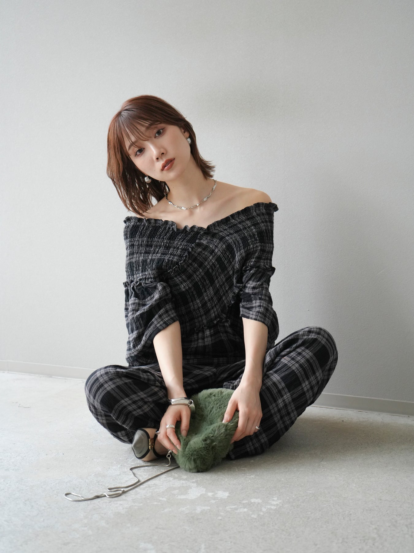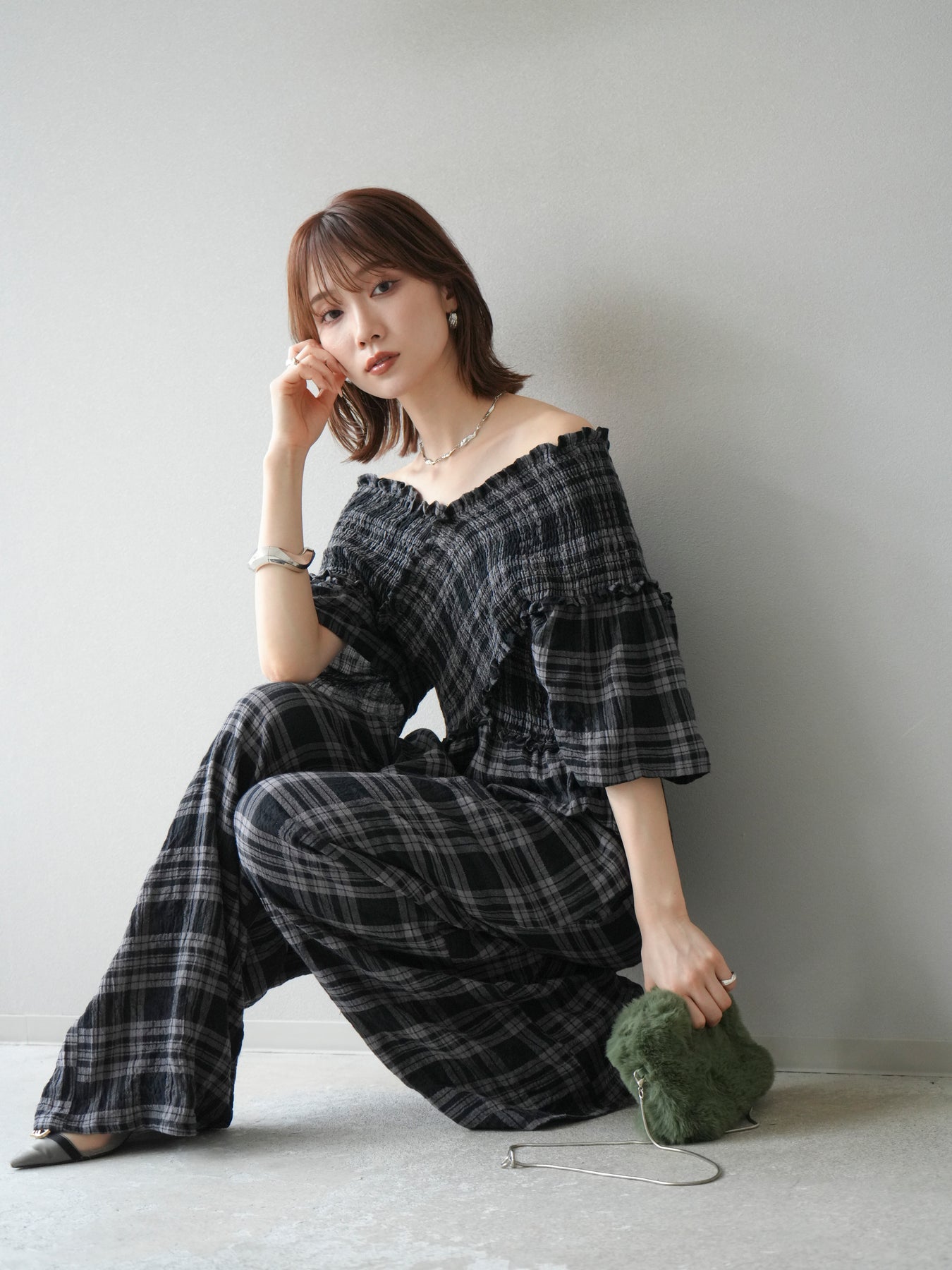 チェック柄が目を惹くハーフスリーブのサロペット。胸元に施したクロスデザインとシャーリングが立体感を生み、女性らしいシルエットを演出します。ゆとりのあるワイドシルエットでリラクシーな着心地ながら、スタイルアップも叶うバランスの良さが魅力。1枚でコーディネートが完成し、カジュアルからお出かけまで幅広く活躍するアイテムです。