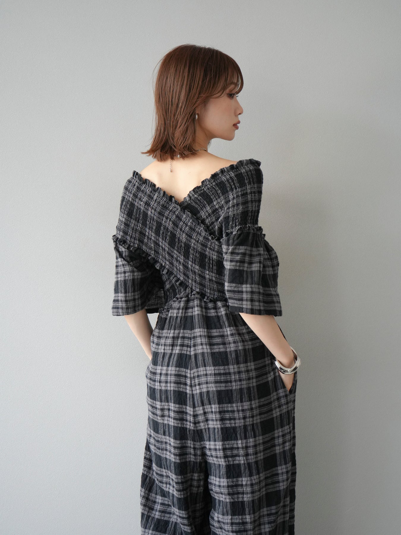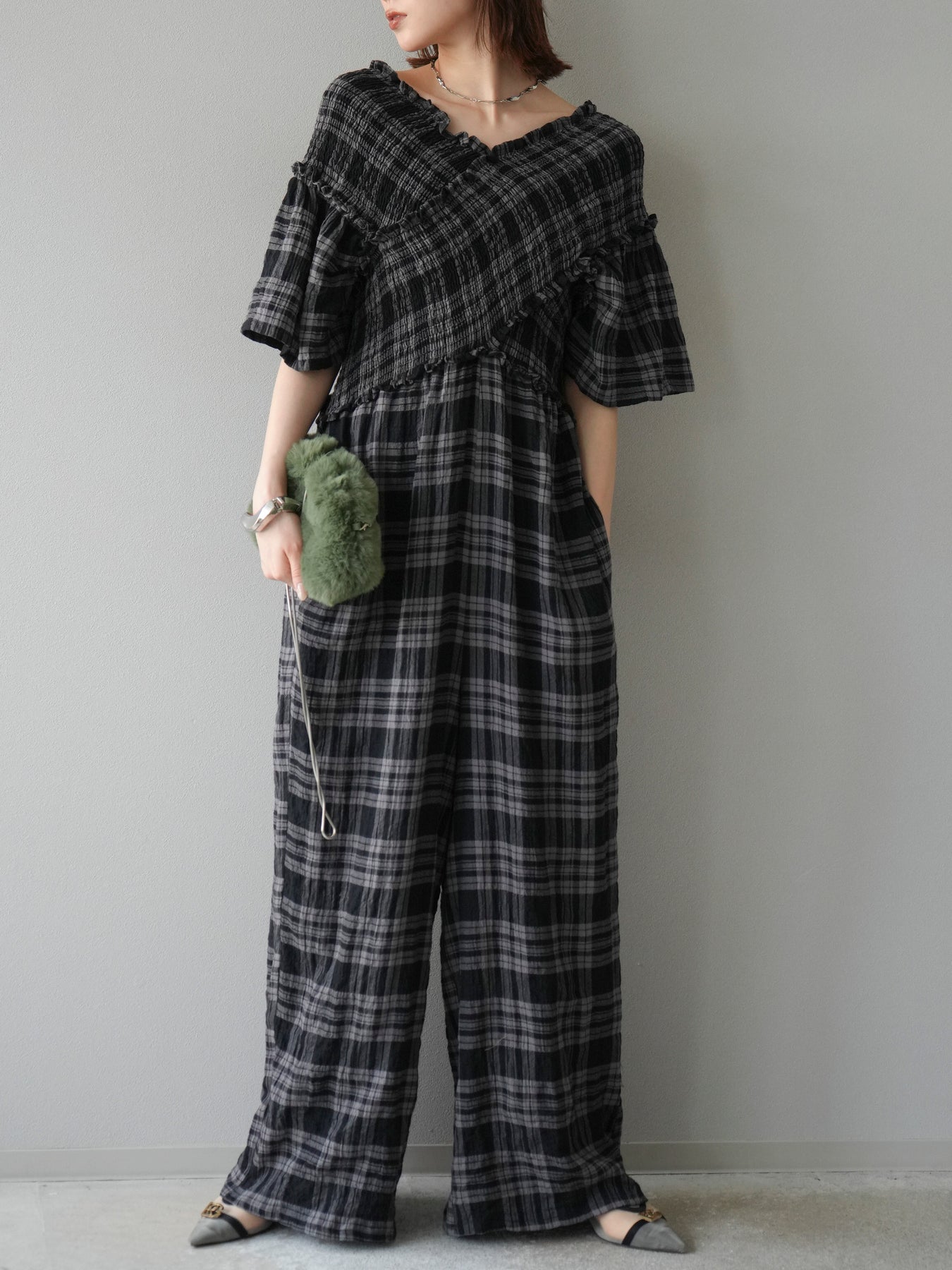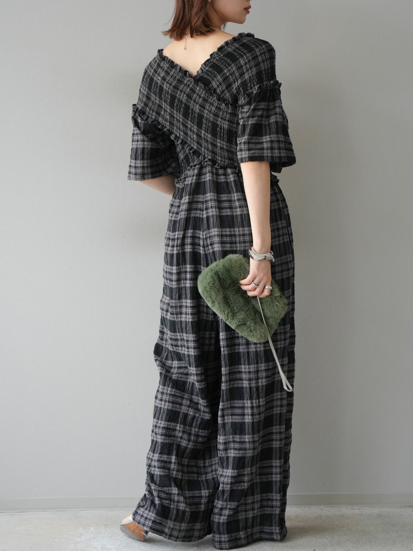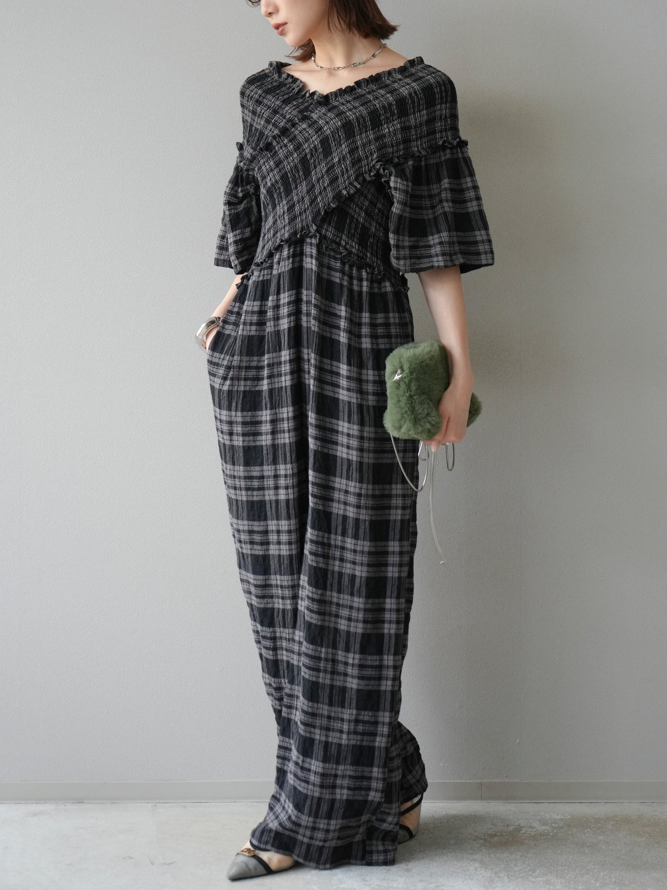[予約]チェック柄ハーフスリーブシャーリングクロスサロペット/ブラック
