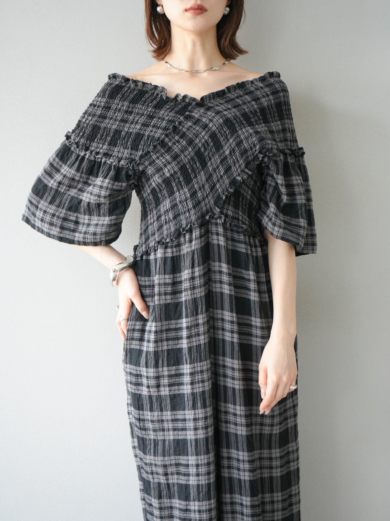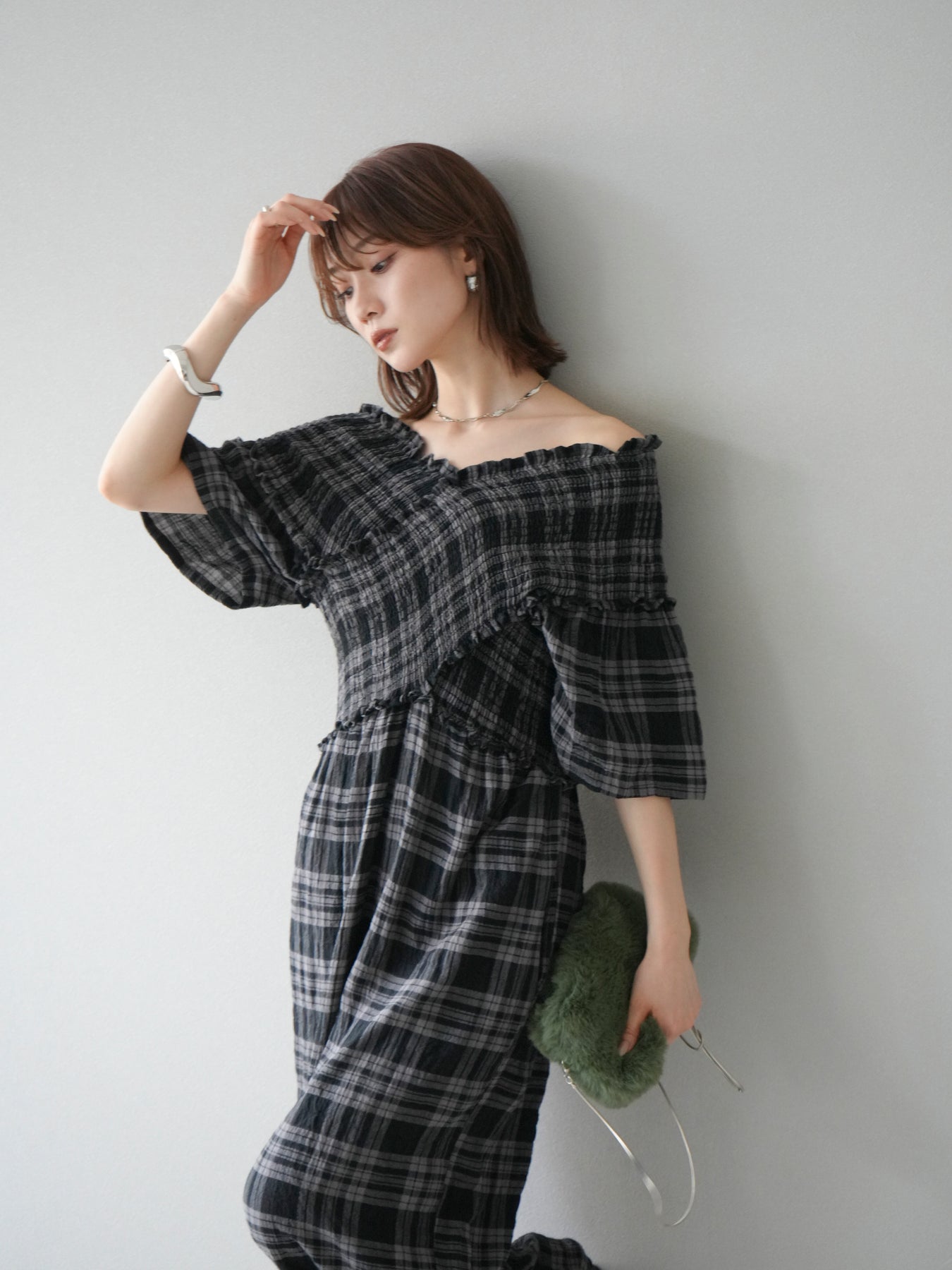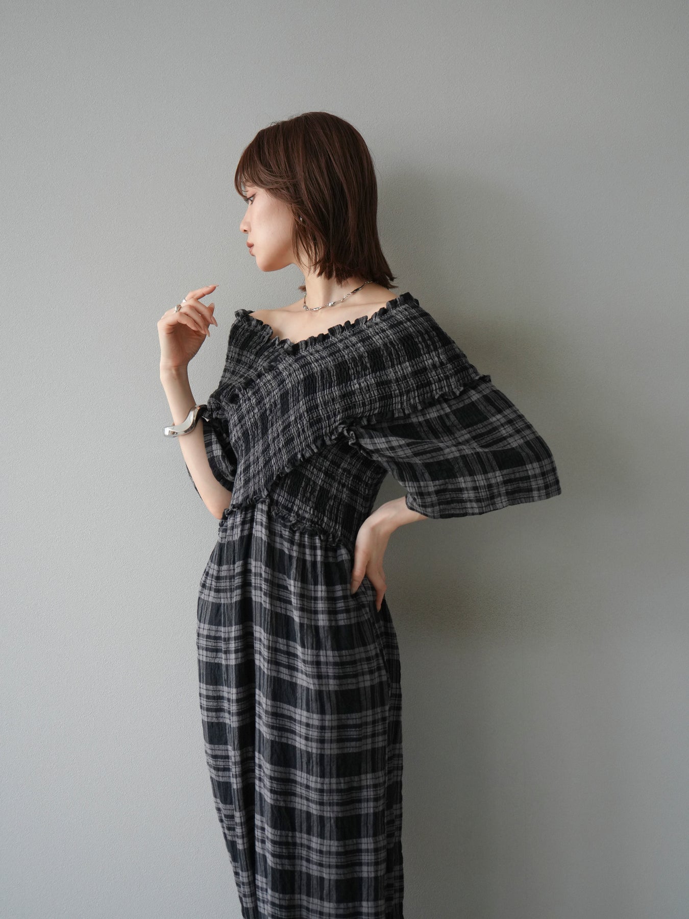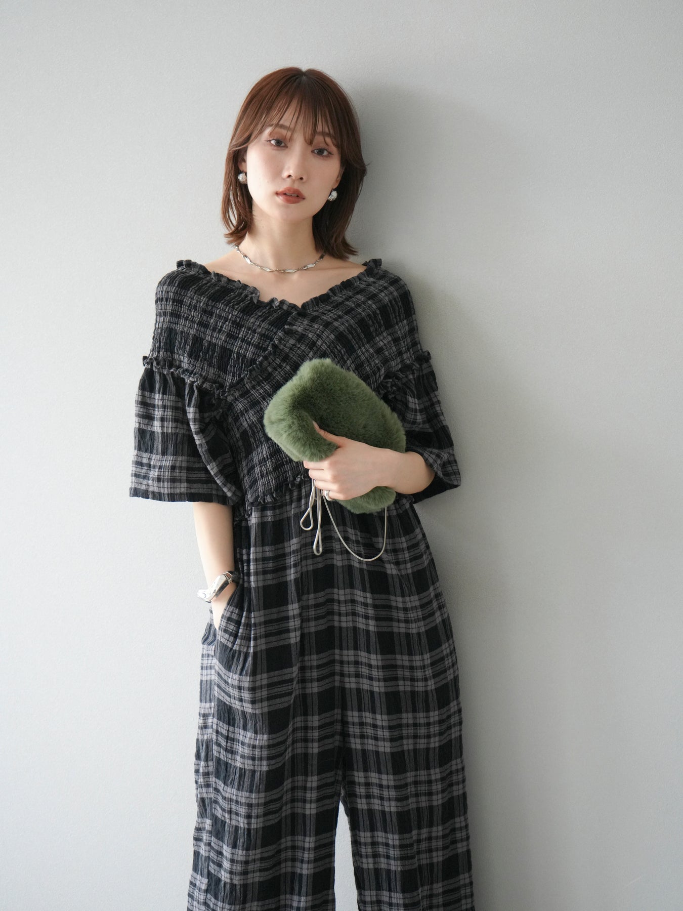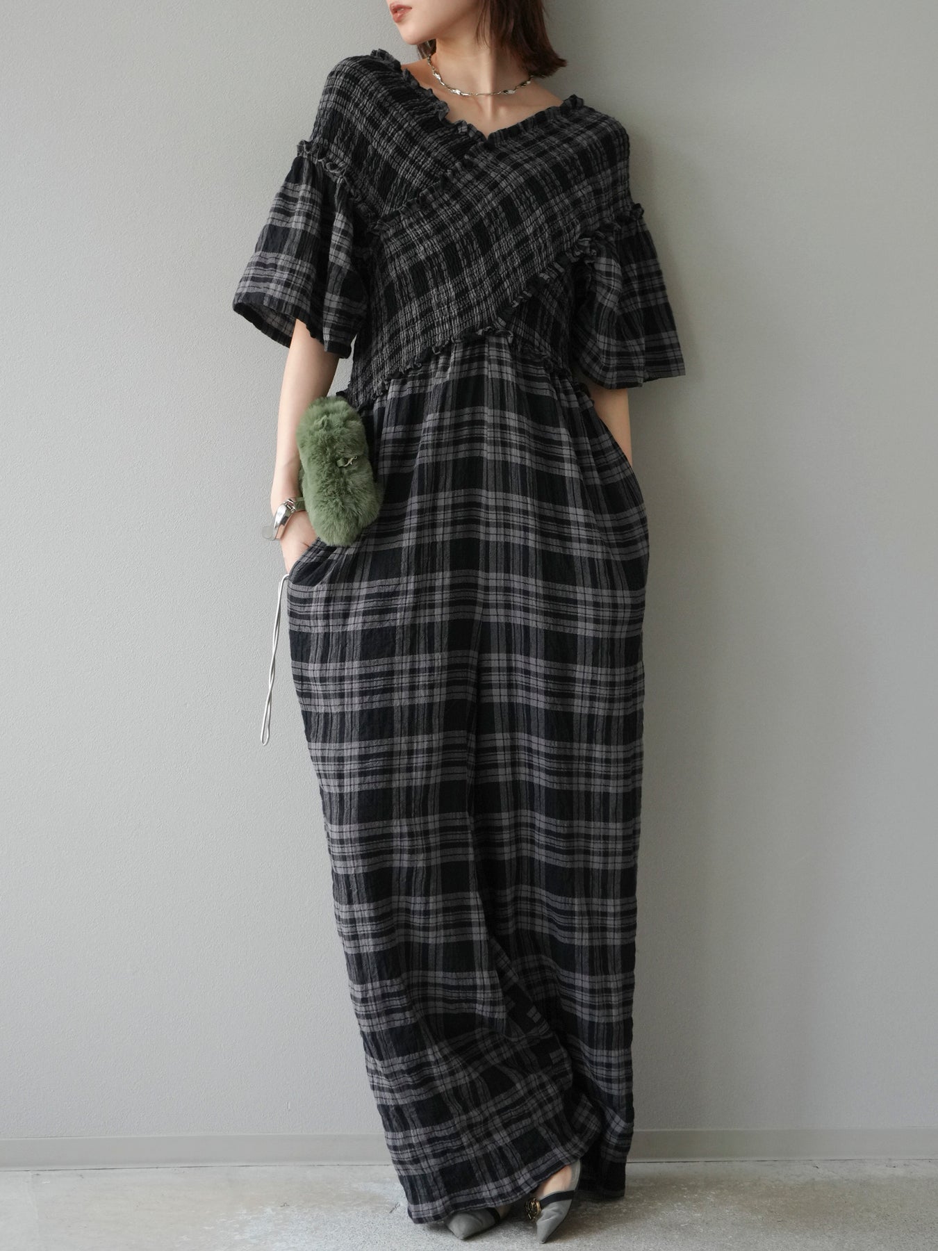 [予約]チェック柄ハーフスリーブシャーリングクロスサロペット/ブラック