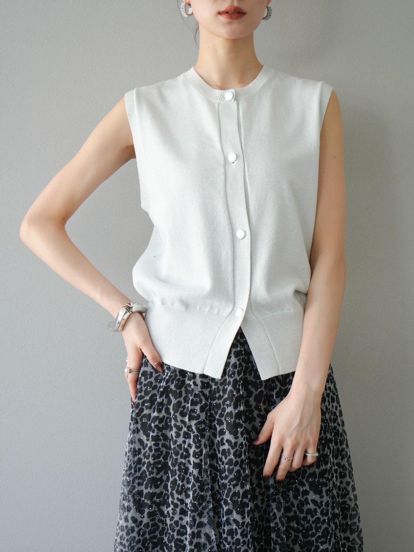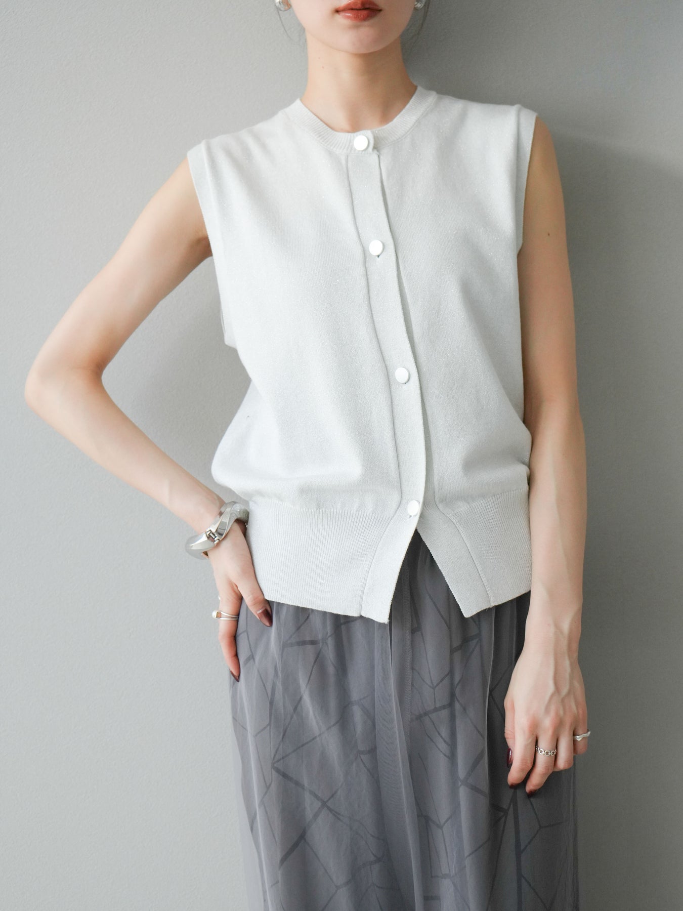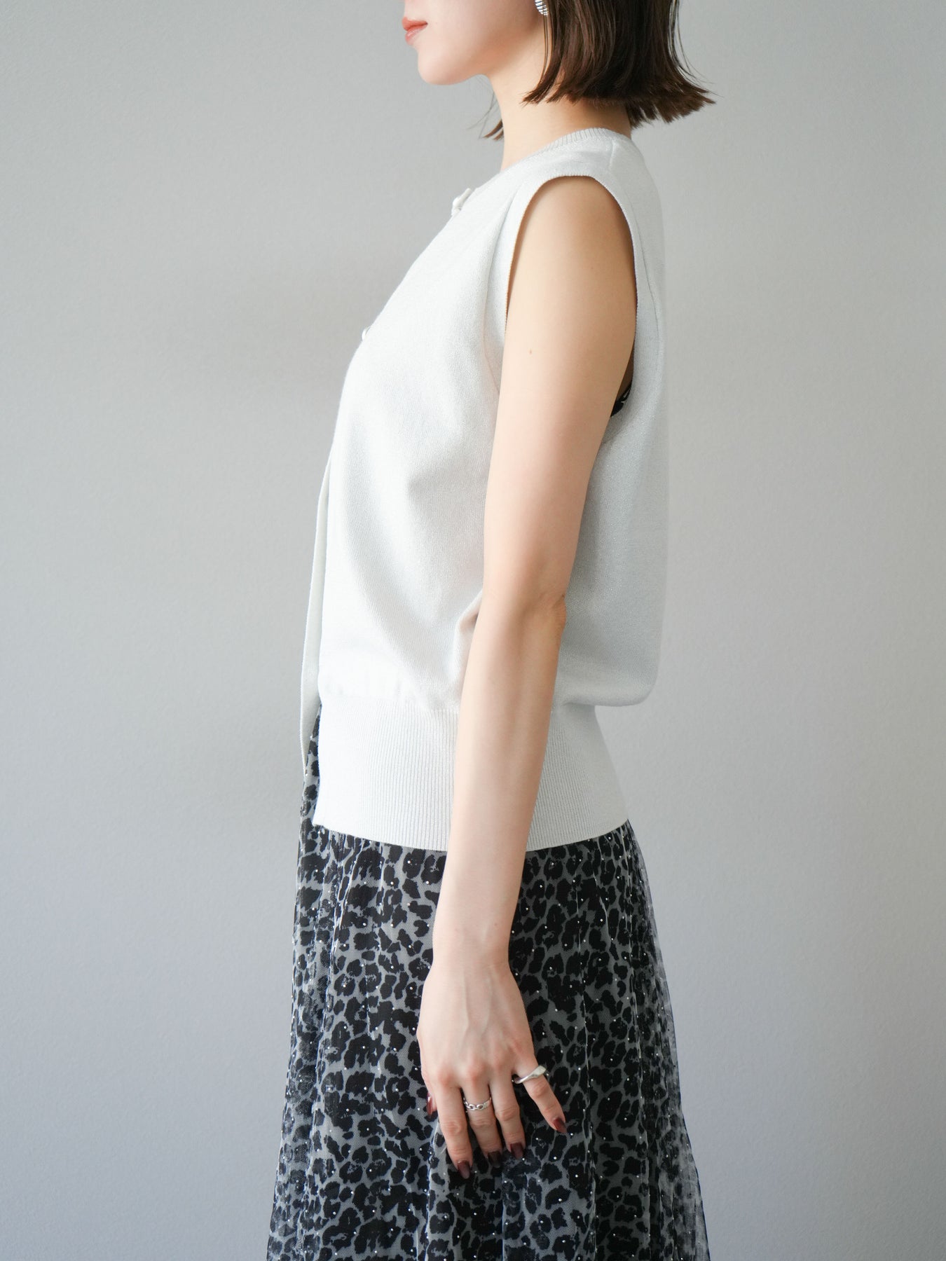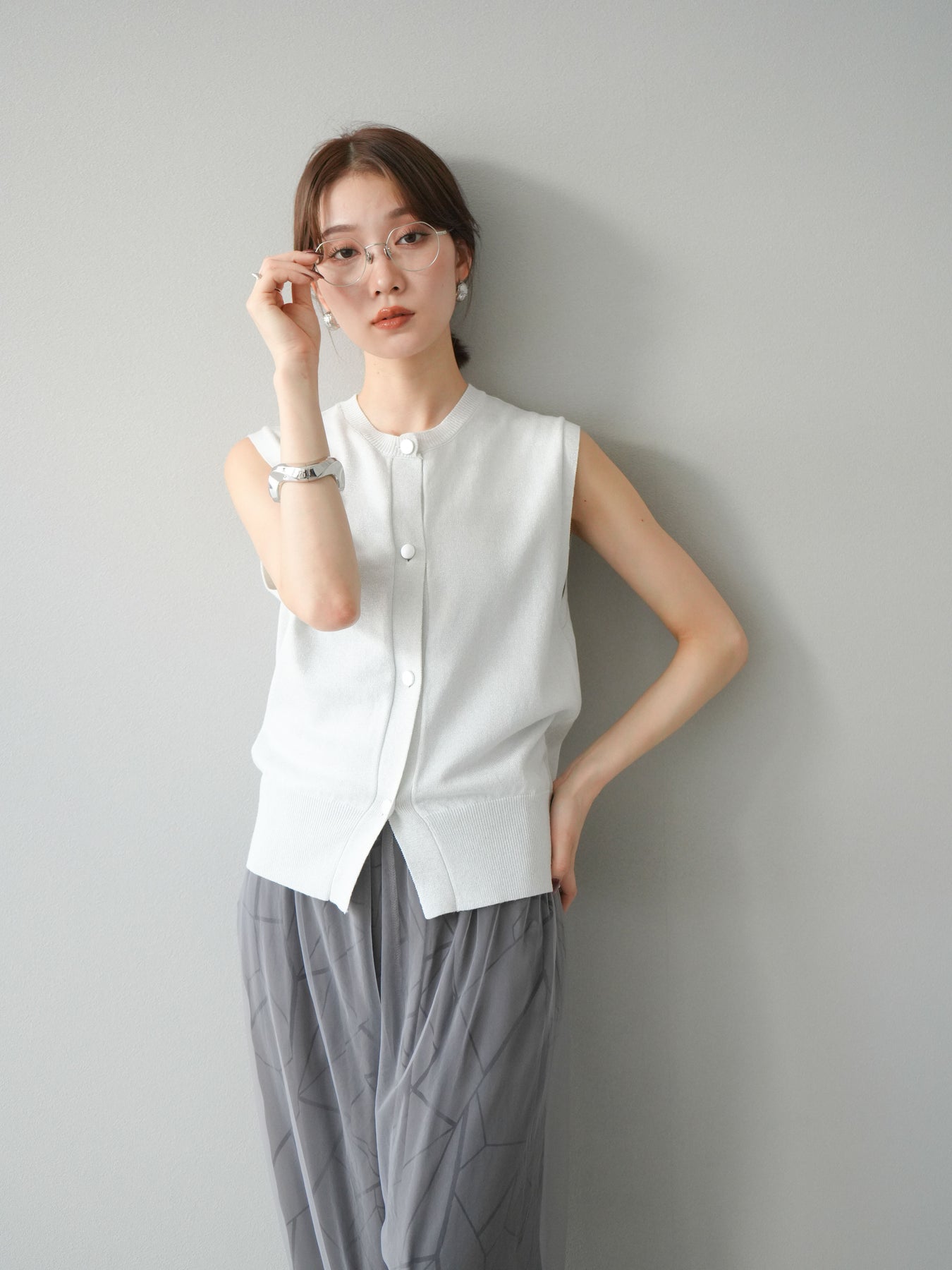 無袖針織背心,帶有微妙的閃光,閃耀優雅。 正面的金屬紐扣增添了經典的點綴,營造出簡約優雅的外觀。 它由柔軟的針織材料製成,可以單獨穿著,也可以與襯衫或剪裁上衣搭配。 該設計允許您將其在前面敞開作為背心穿著,使其成為可以在任何季節穿著的多功能服裝。 ※除下裝、吊帶背心(內衣)以外的商品均不含內衣。