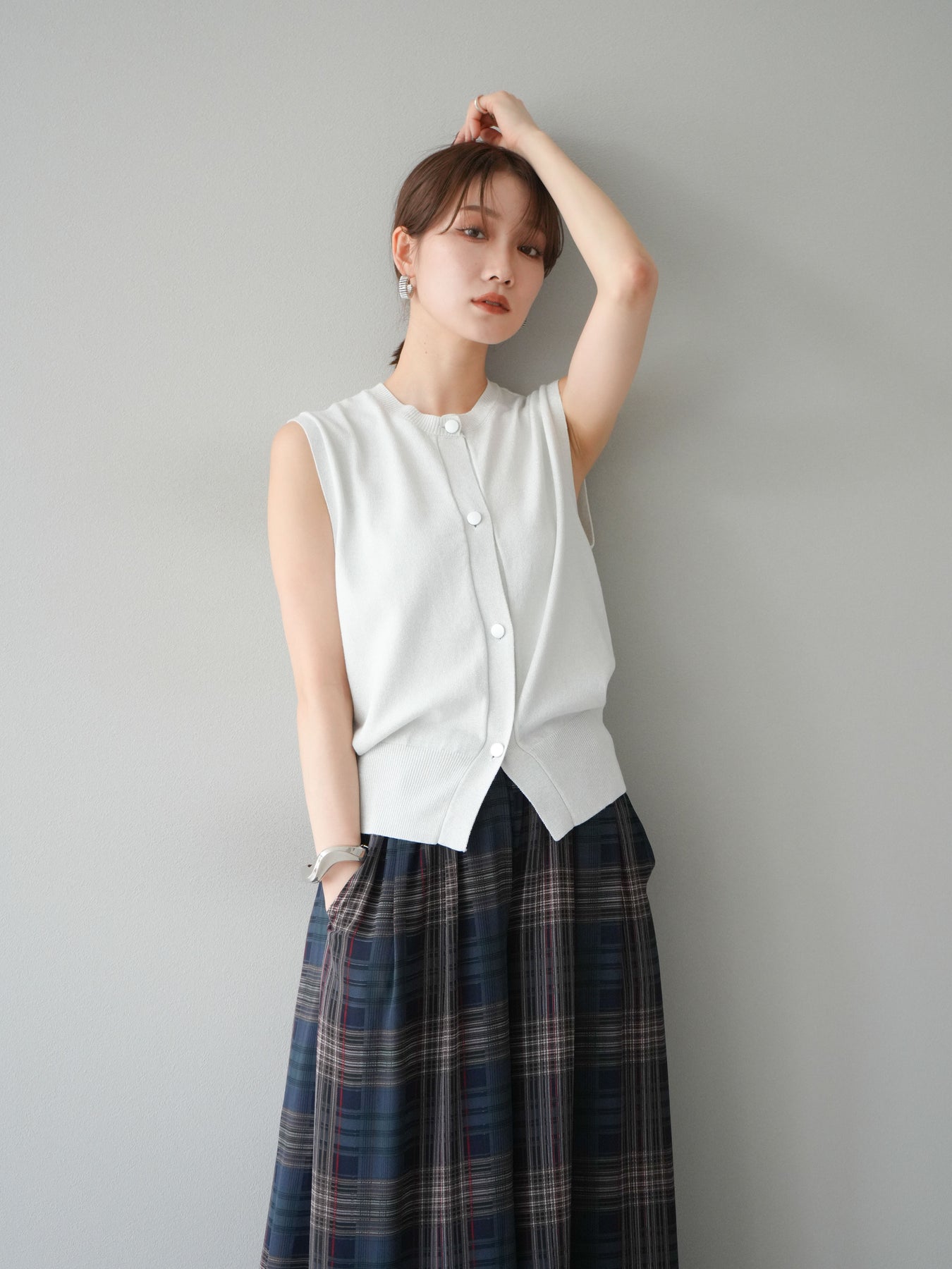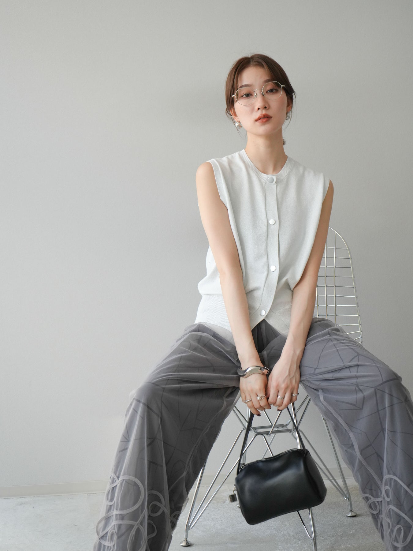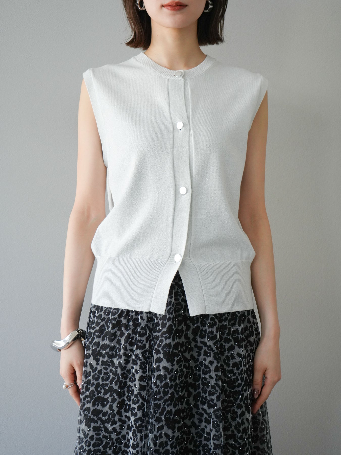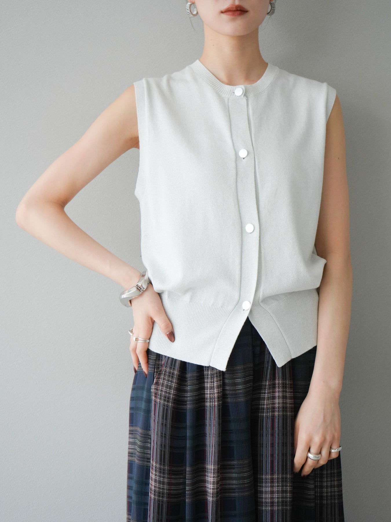 無袖針織背心,帶有微妙的閃光,閃耀優雅。 正面的金屬紐扣增添了經典的點綴,營造出簡約優雅的外觀。 它由柔軟的針織材料製成,可以單獨穿著,也可以與襯衫或剪裁上衣搭配。 該設計允許您將其在前面敞開作為背心穿著,使其成為可以在任何季節穿著的多功能服裝。 ※除下裝、吊帶背心(內衣)以外的商品均不含內衣。