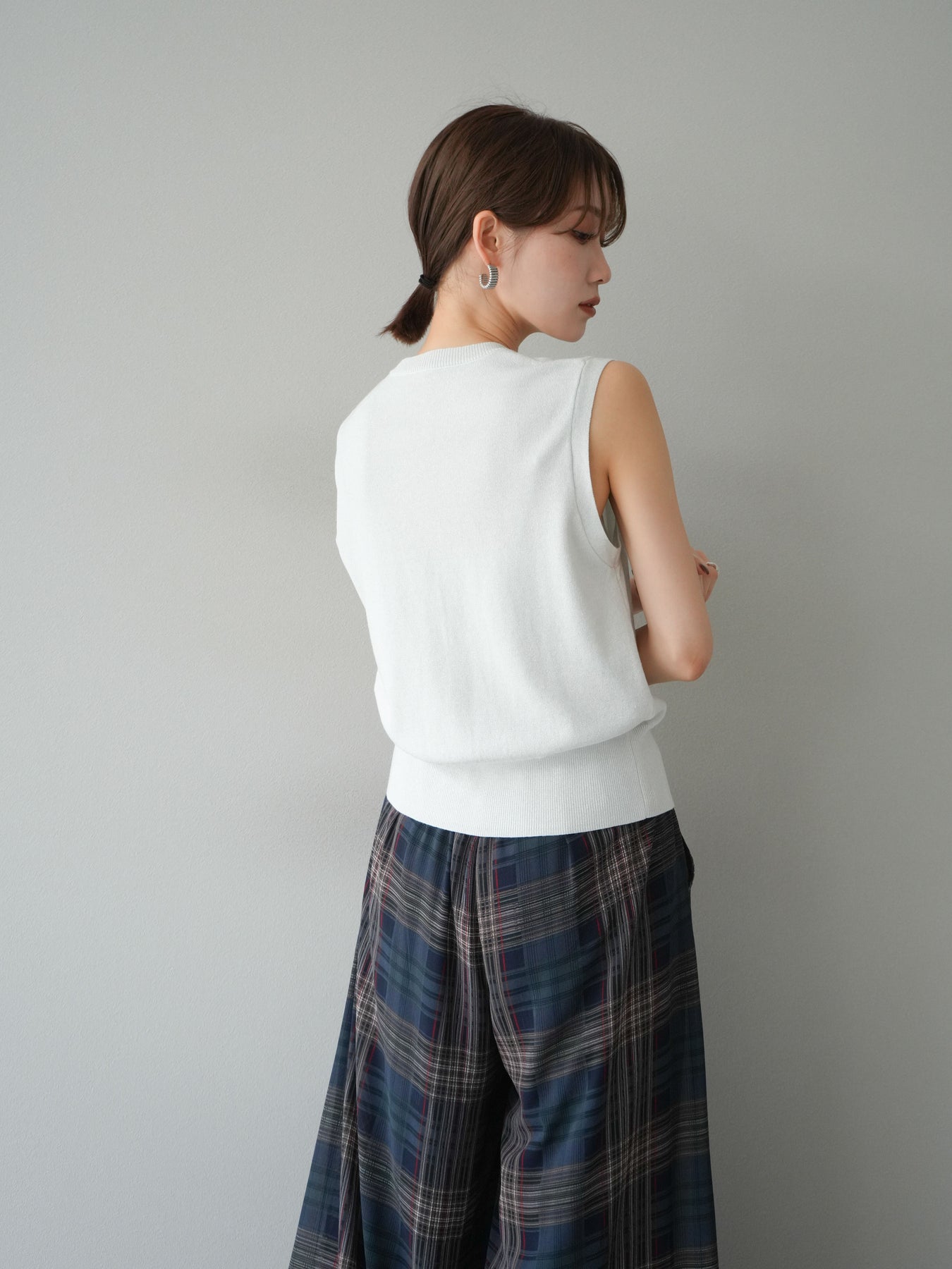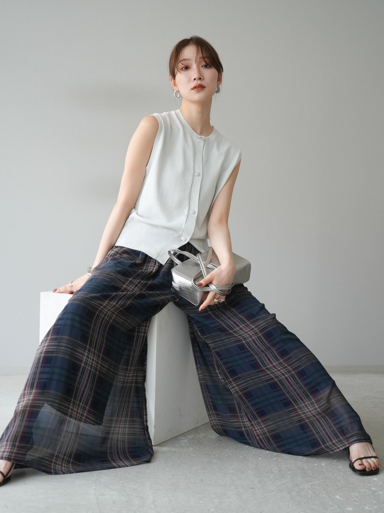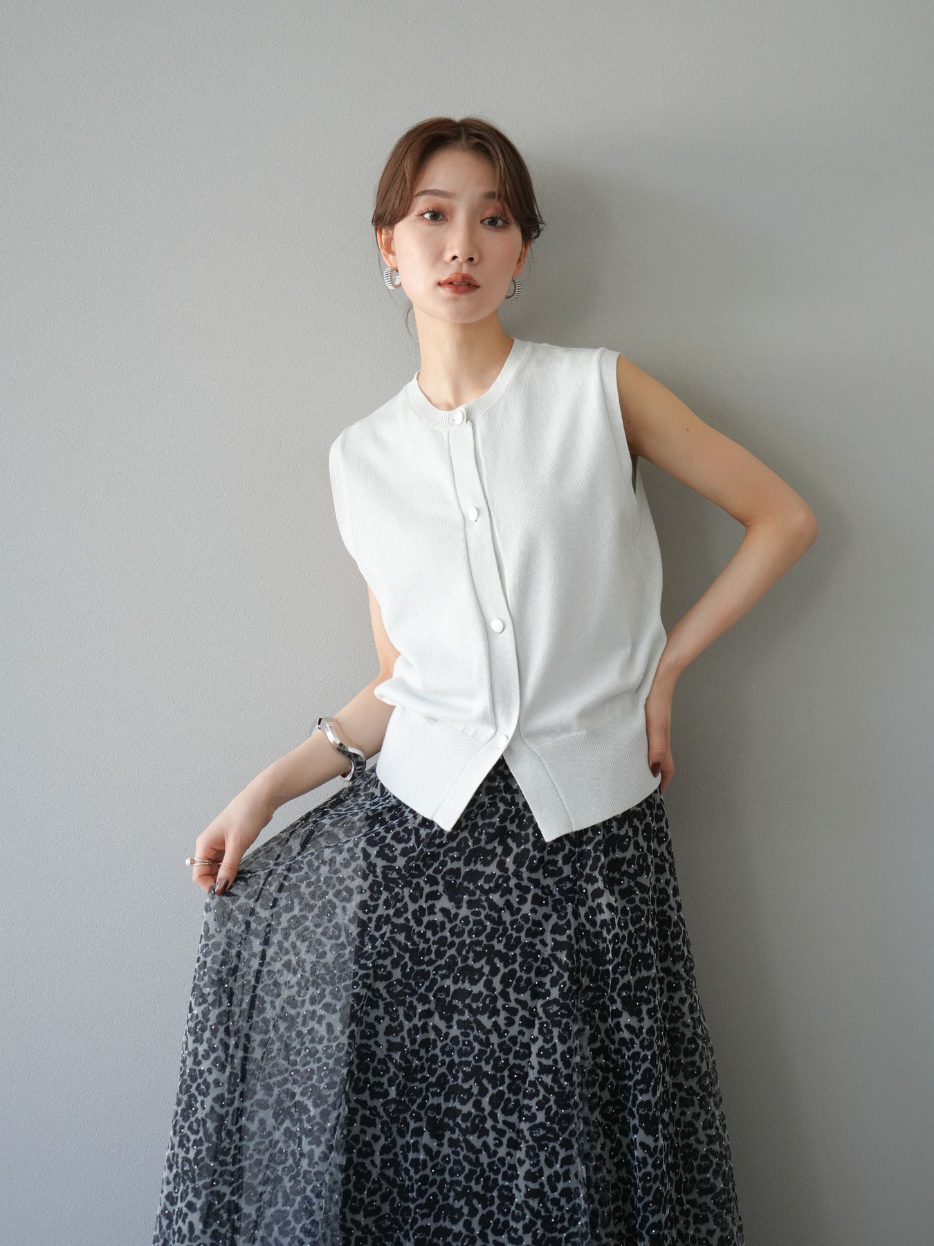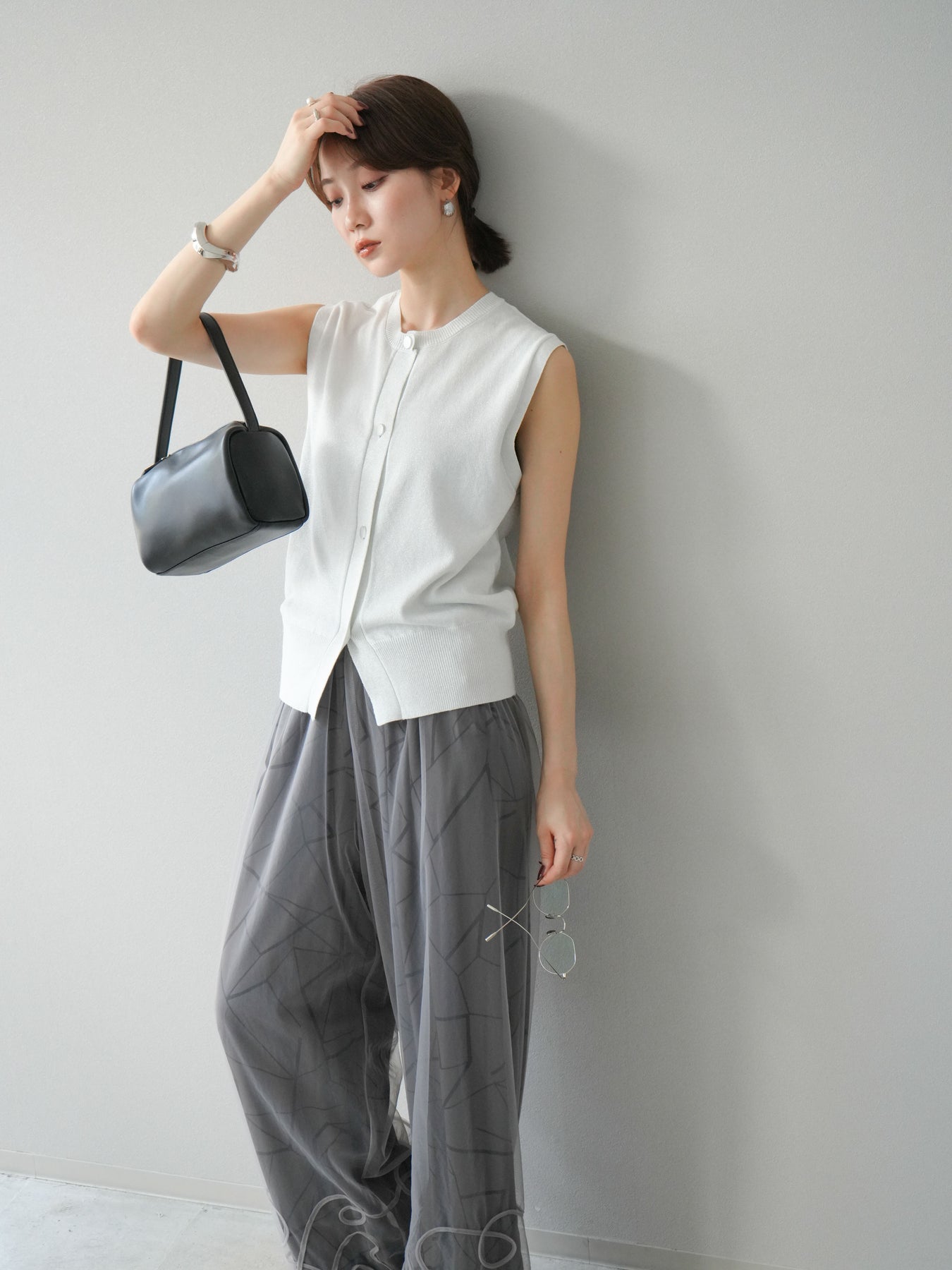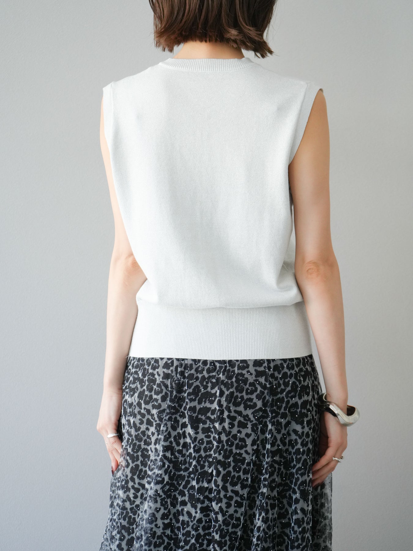 無袖針織背心,帶有微妙的閃光,閃耀優雅。 正面的金屬紐扣增添了經典的點綴,營造出簡約優雅的外觀。 它由柔軟的針織材料製成,可以單獨穿著,也可以與襯衫或剪裁上衣搭配。 該設計允許您將其在前面敞開作為背心穿著,使其成為可以在任何季節穿著的多功能服裝。 ※除下裝、吊帶背心(內衣)以外的商品均不含內衣。