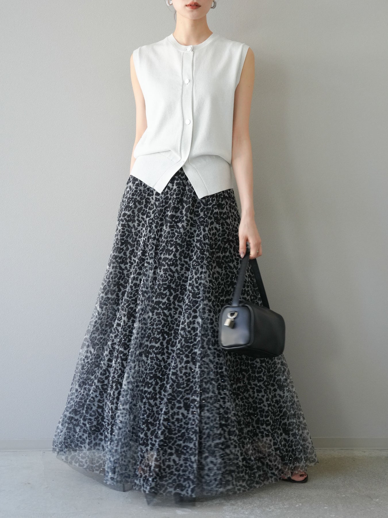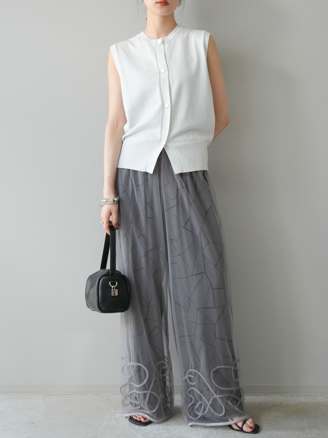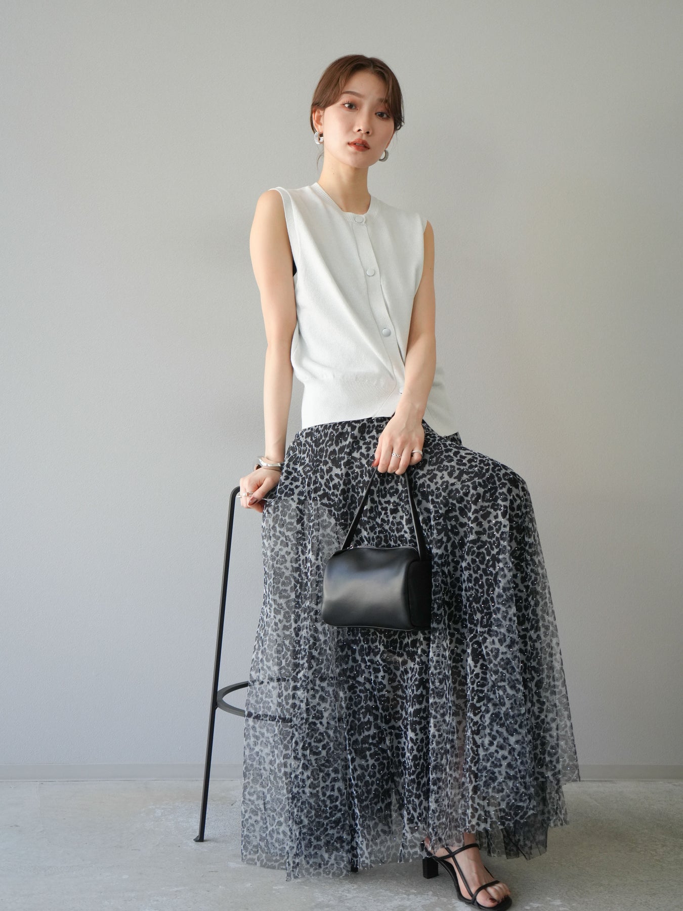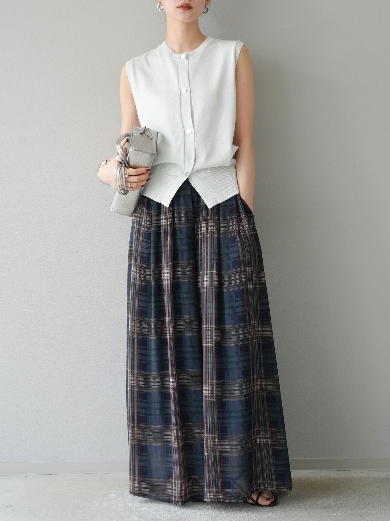 無袖針織背心,帶有微妙的閃光,閃耀優雅。 正面的金屬紐扣增添了經典的點綴,營造出簡約優雅的外觀。 它由柔軟的針織材料製成,可以單獨穿著,也可以與襯衫或剪裁上衣搭配。 該設計允許您將其在前面敞開作為背心穿著,使其成為可以在任何季節穿著的多功能服裝。 ※除下裝、吊帶背心(內衣)以外的商品均不含內衣。