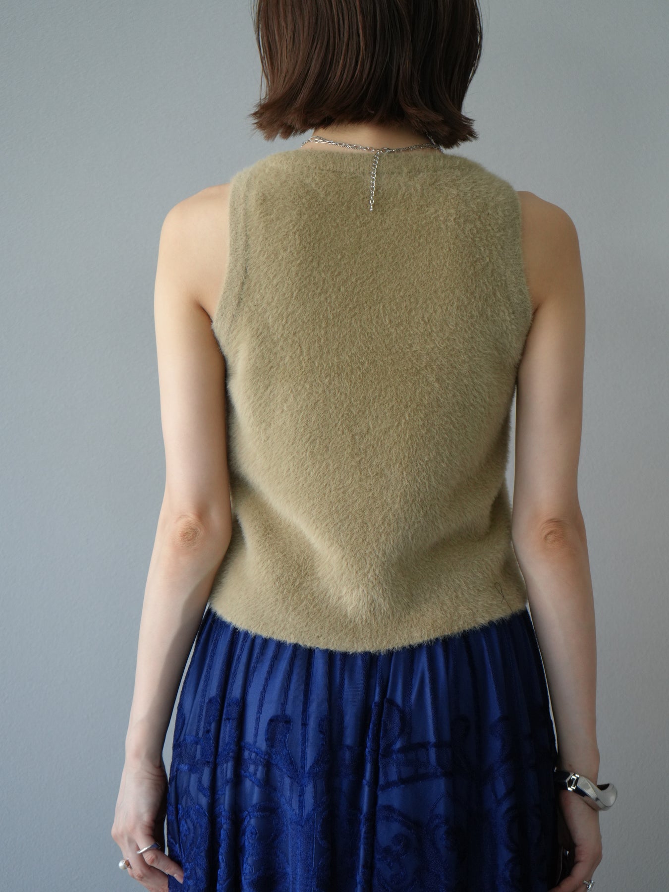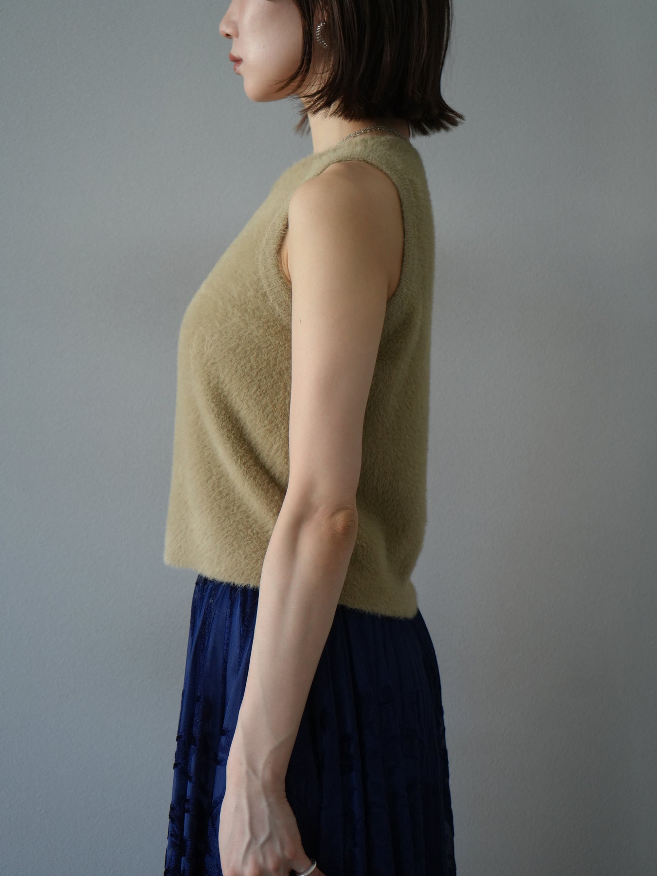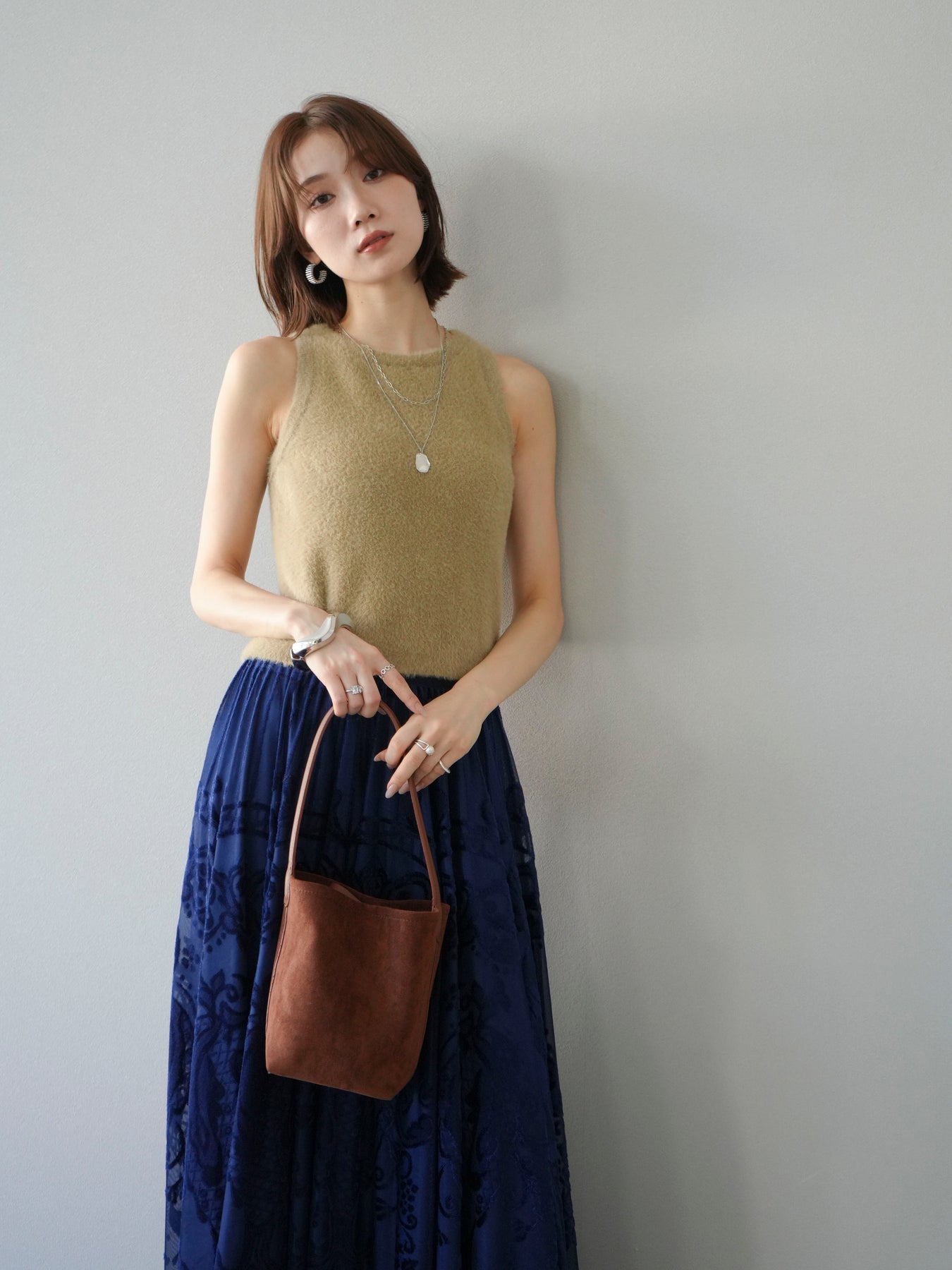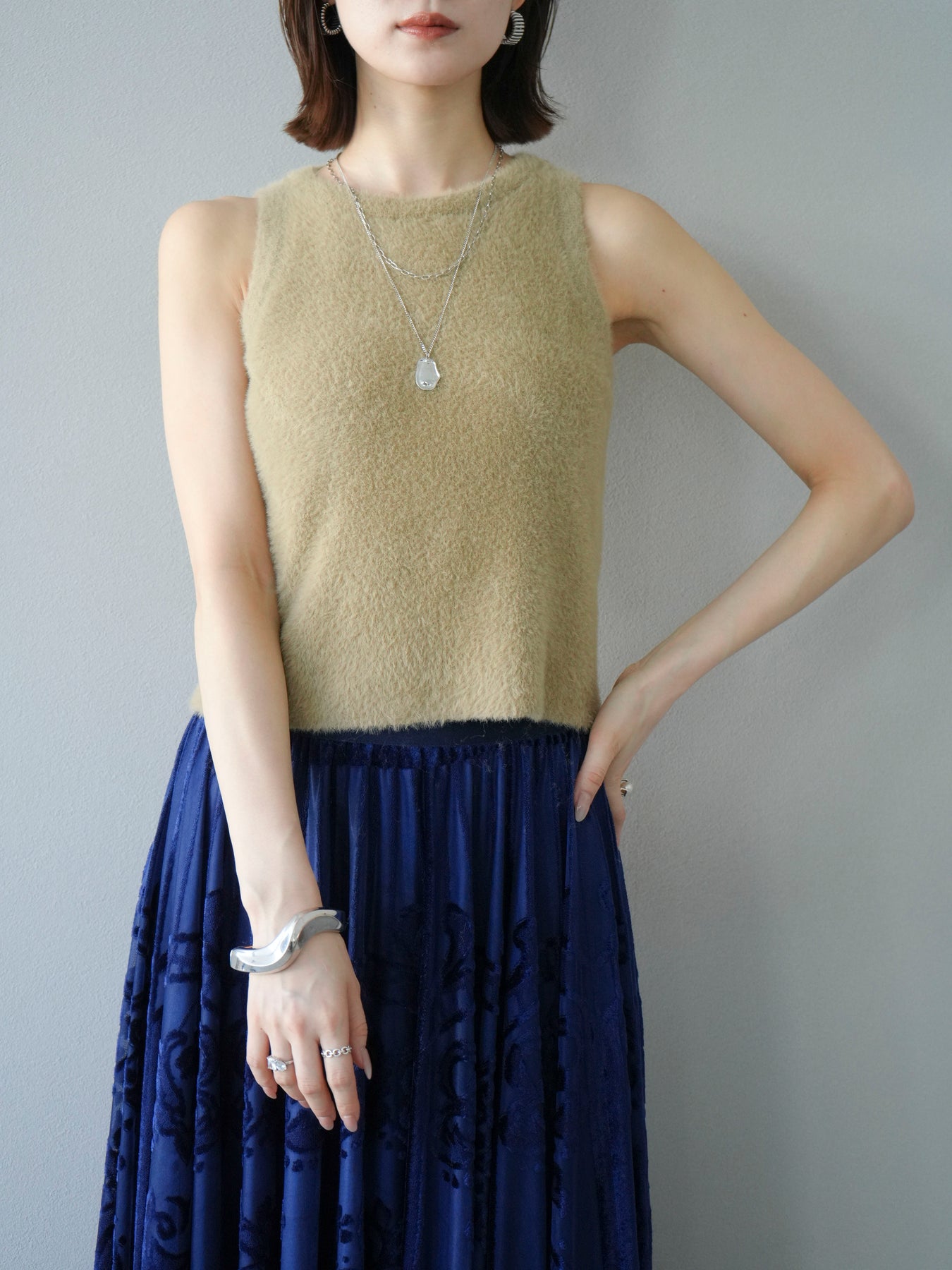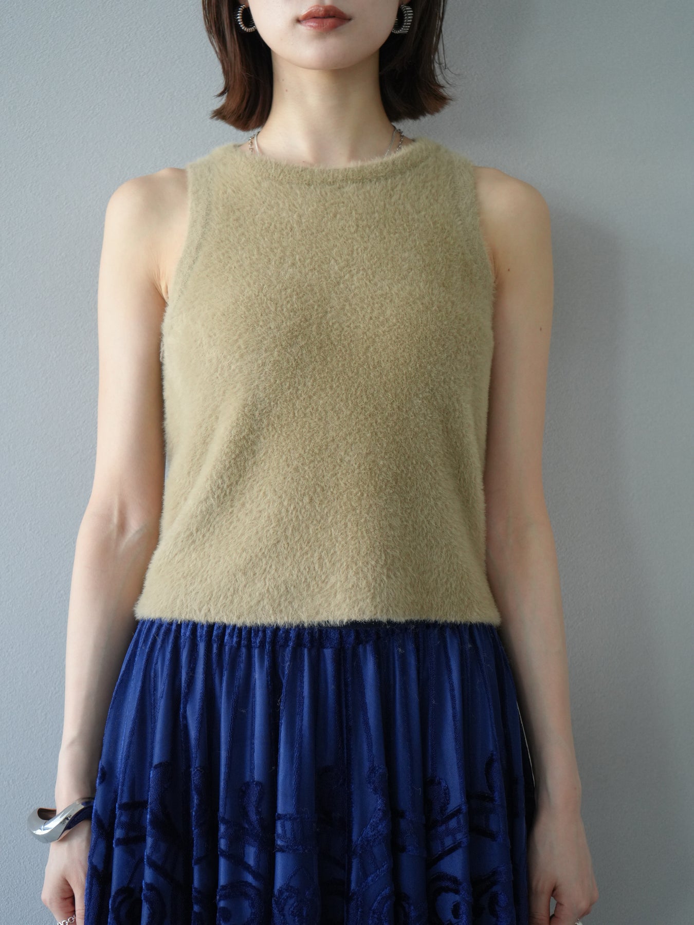 ふんわりとしたシャギー素材を使用したニットタンクトップ。毛足のある柔らかな風合いがシーズンムードを高め、1枚でもレイヤードでも着映えするアイテムです。程よくコンパクトなシルエットで、ボトムスとのバランスが取りやすく、スカートにもパンツにも好相性。シンプルながらも素材感で存在感を放ち、アクセサリーを合わせればより華やかな印象に。インナーにシャツやシアートップスを重ねることで、季節を問わずロングシーズン活躍します。 ※ボトムス、キャミソール(インナー)以外の商品は一律でインナーは付属していません。