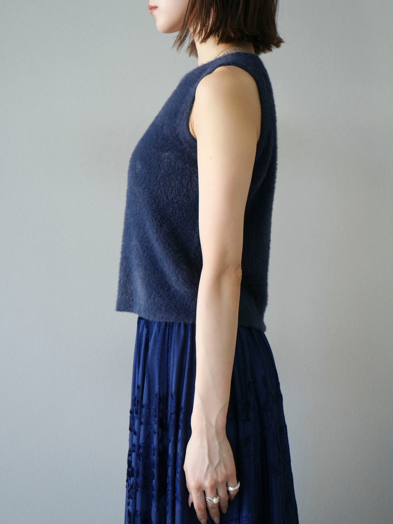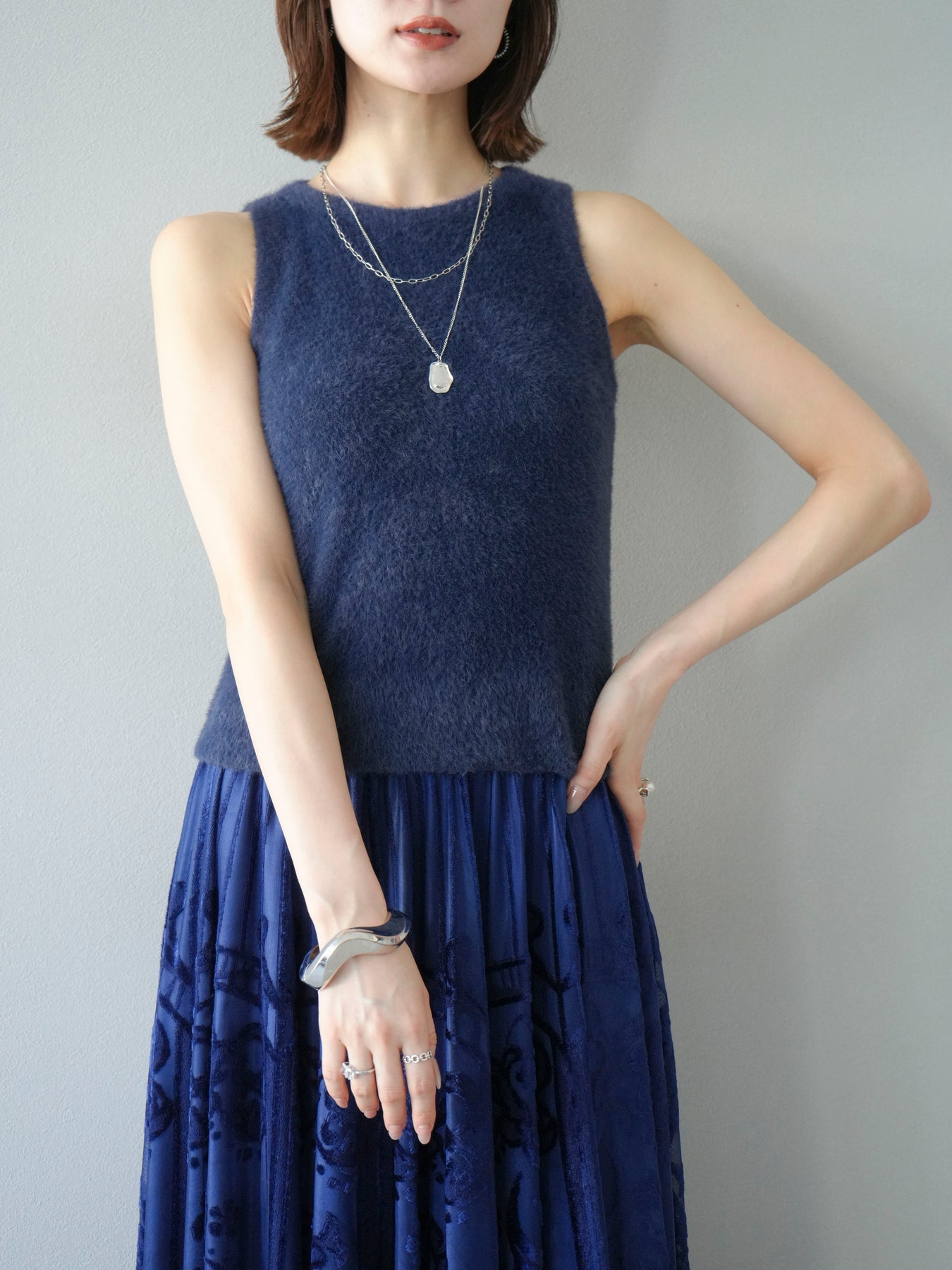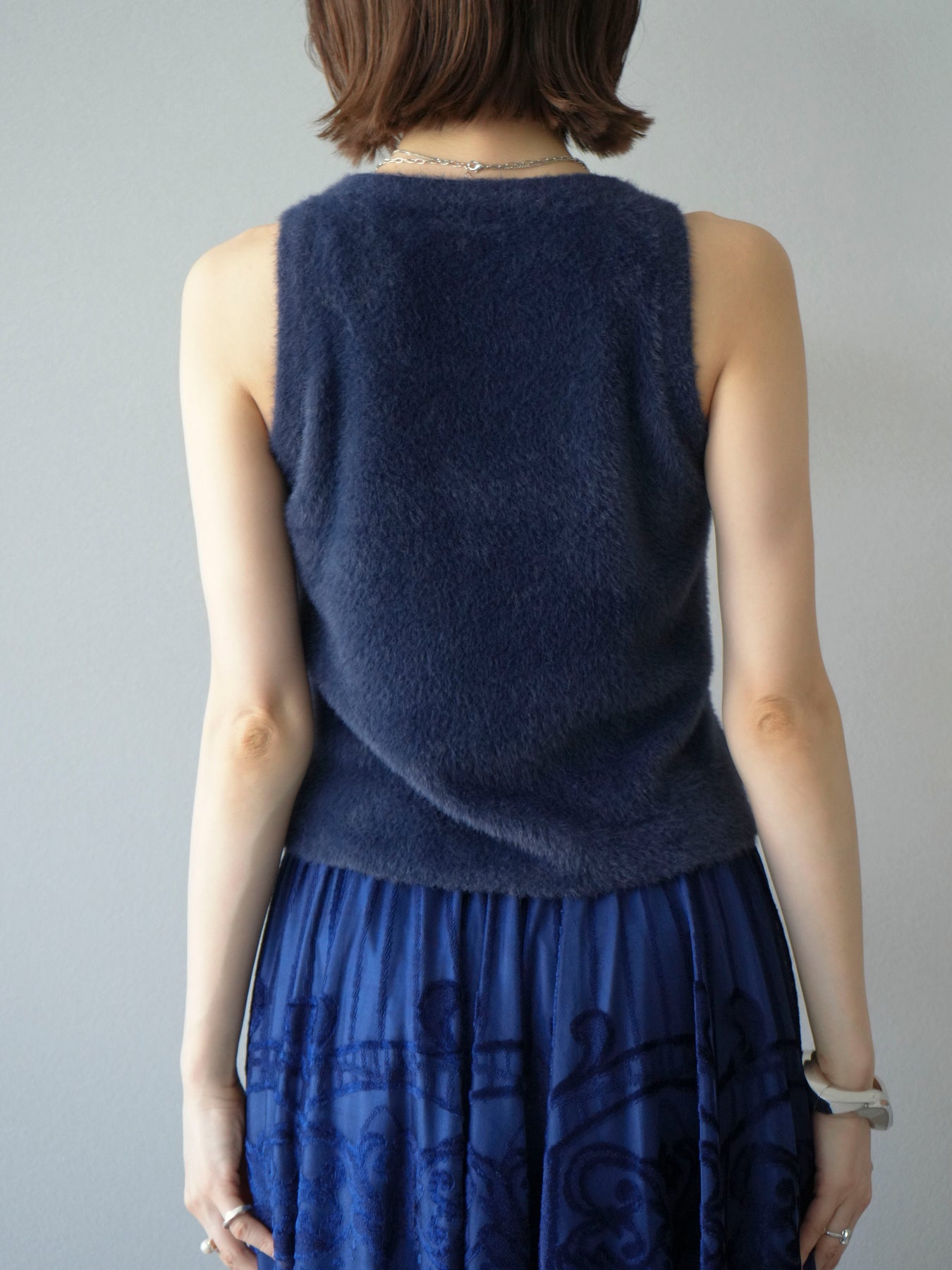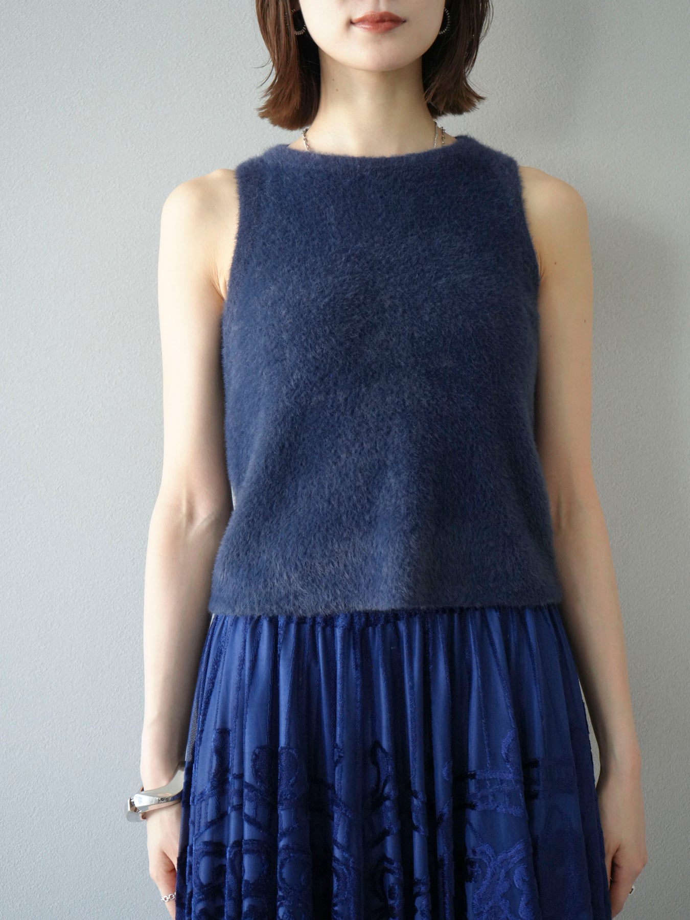 ふんわりとしたシャギー素材を使用したニットタンクトップ。毛足のある柔らかな風合いがシーズンムードを高め、1枚でもレイヤードでも着映えするアイテムです。程よくコンパクトなシルエットで、ボトムスとのバランスが取りやすく、スカートにもパンツにも好相性。シンプルながらも素材感で存在感を放ち、アクセサリーを合わせればより華やかな印象に。インナーにシャツやシアートップスを重ねることで、季節を問わずロングシーズン活躍します。 ※ボトムス、キャミソール(インナー)以外の商品は一律でインナーは付属していません。