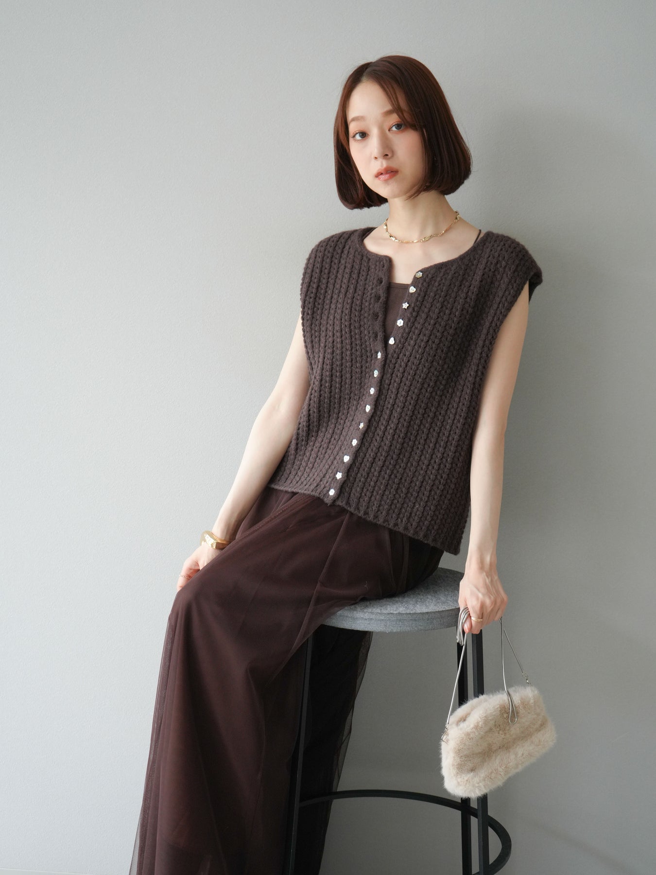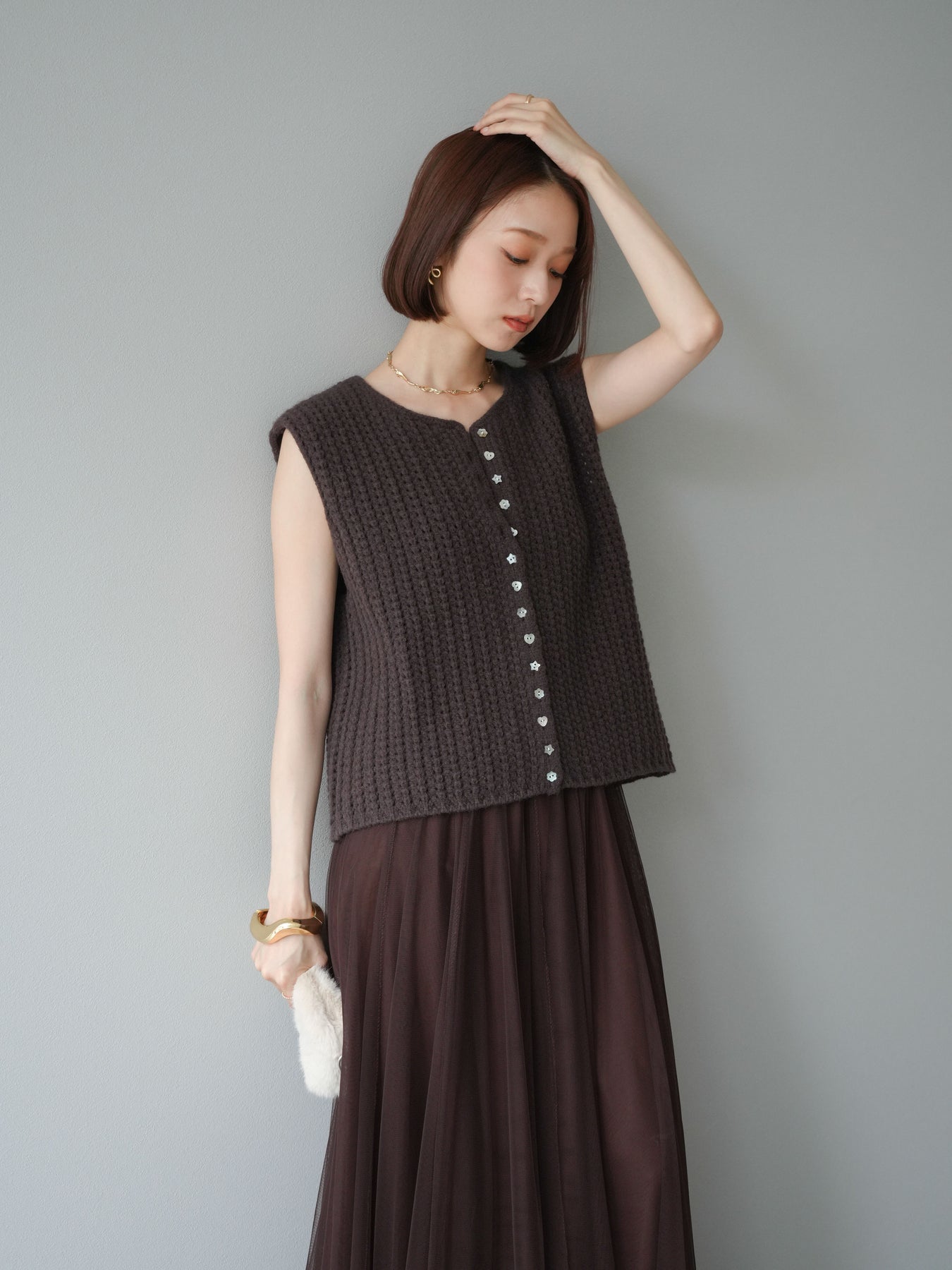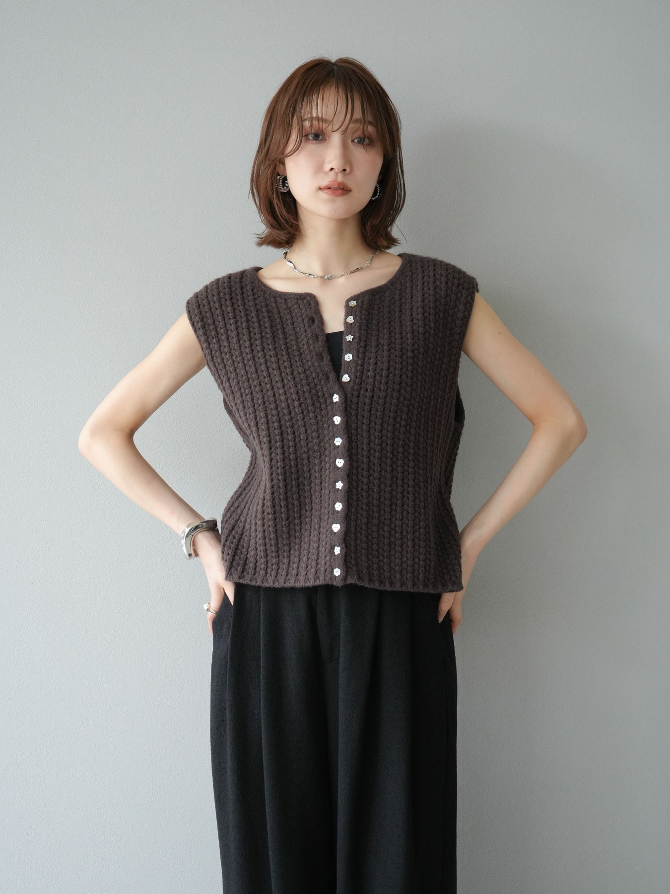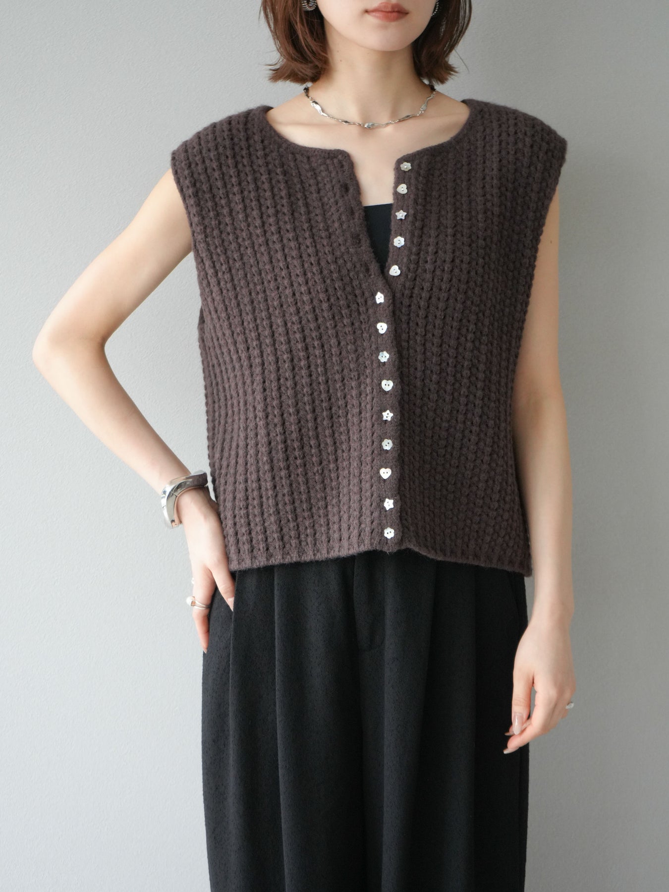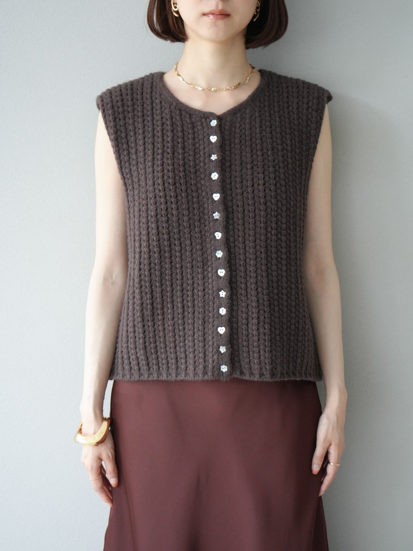 [予約]ランダムボタンニットベスト/ブラウン